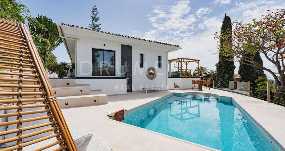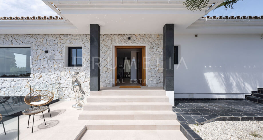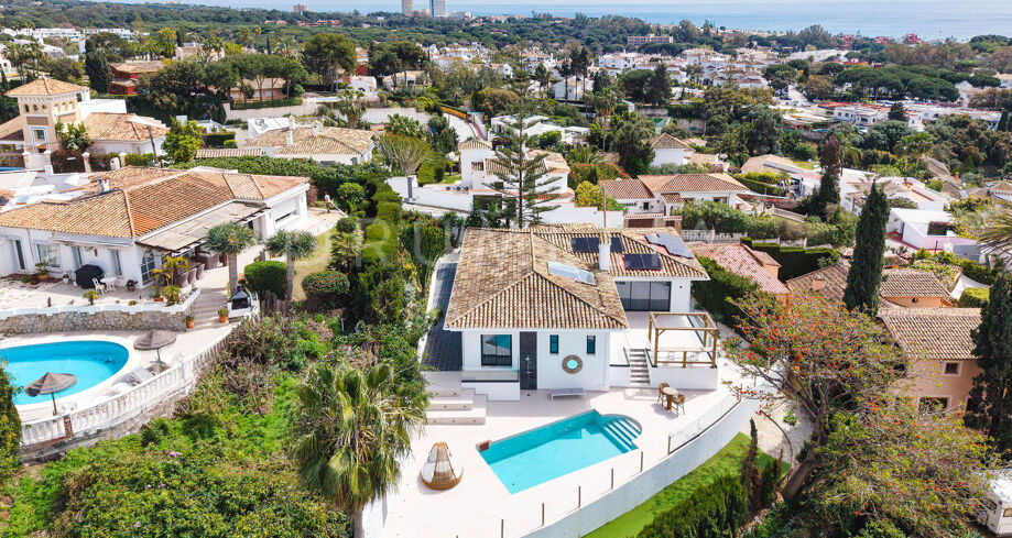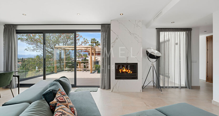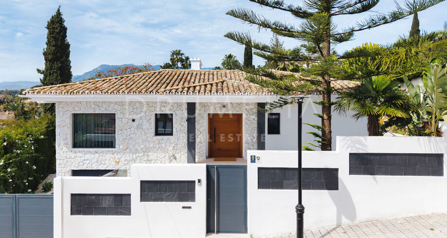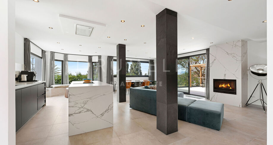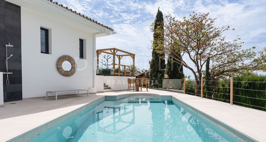 Denne totalrenoverte eneboligen i de fredelige åsene i Elviria kombinerer moderne komfort med middelhavssjarm. Huset er på ett plan og er designet for å maksimere naturlig lys og gi panoramautsikt over havet og fjellene. Den har fire romslige soverom, tre bad med eget bad og et gjestetoalett. Det åpne kjøkkenet er fullt utstyrt med hvitevarer av høy kvalitet, og den lyse stuen med sentral peis skaper en varm og innbydende atmosfære.