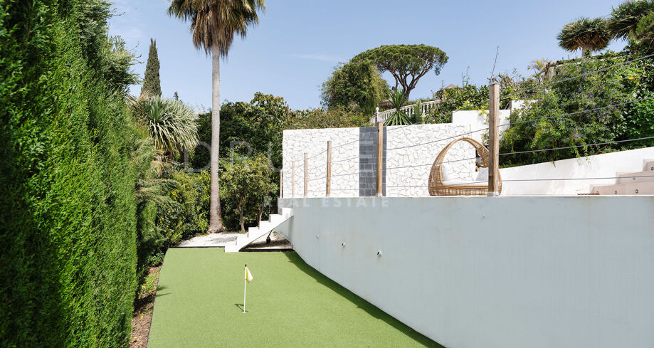 Store vinduer fører ut til en romslig terrasse, hvor uteområdet blir en naturlig forlengelse av hjemmet. En vakkert anlagt hage omringer det private bassenget, perfekt for å nyte Marbellas milde klima. Det finnes også en grillplass og en privat putting green for golfentusiaster.