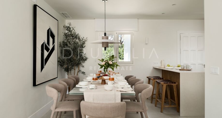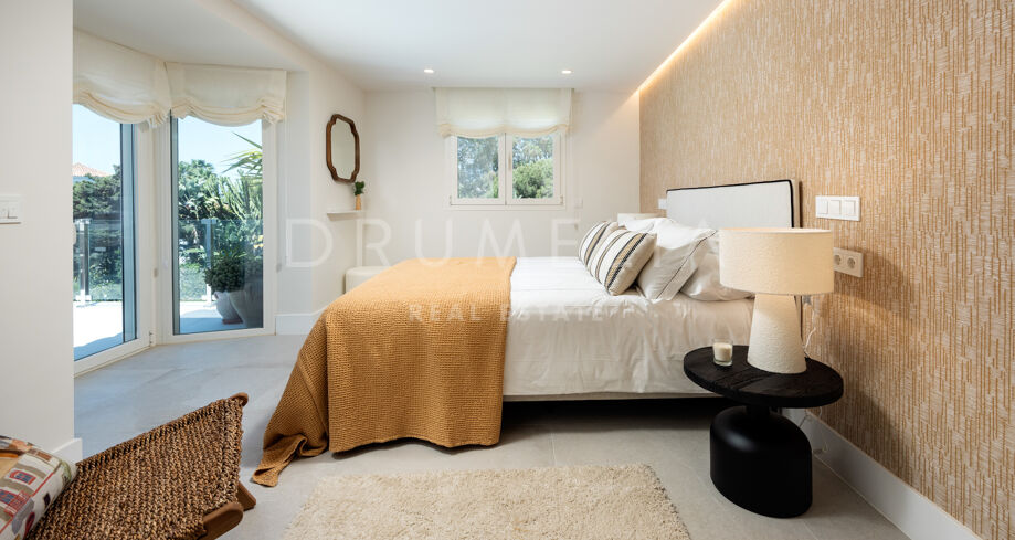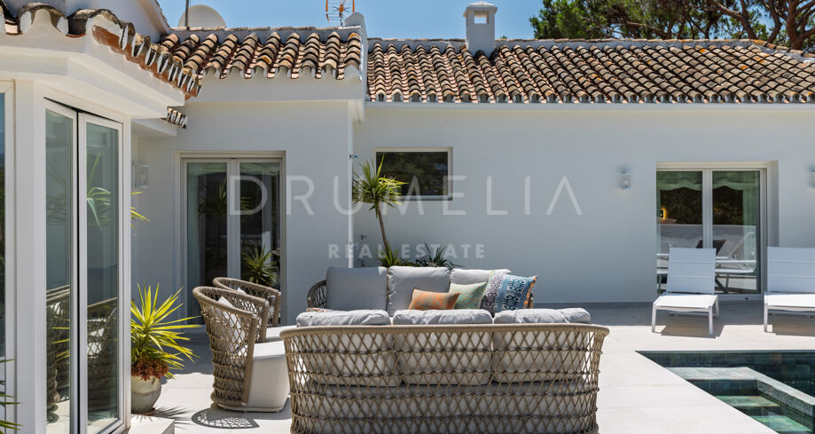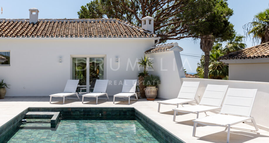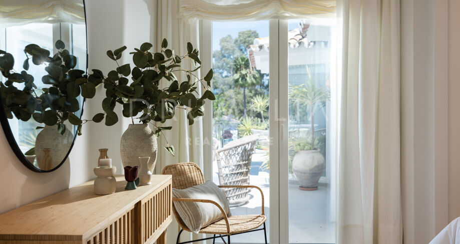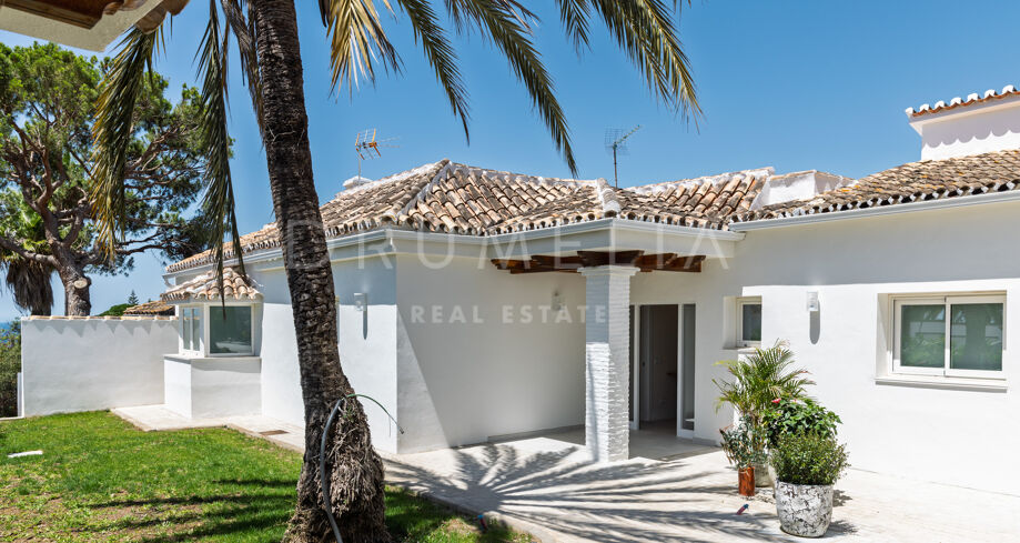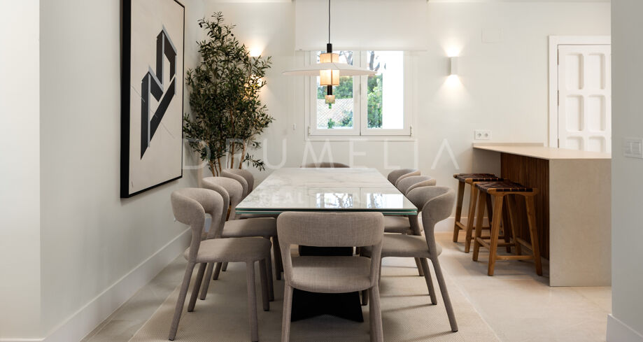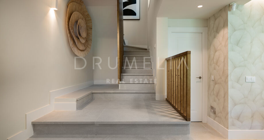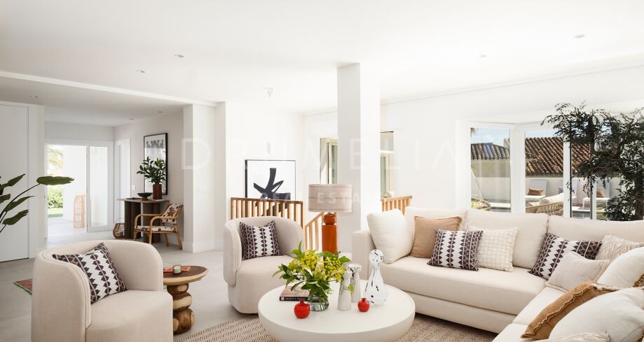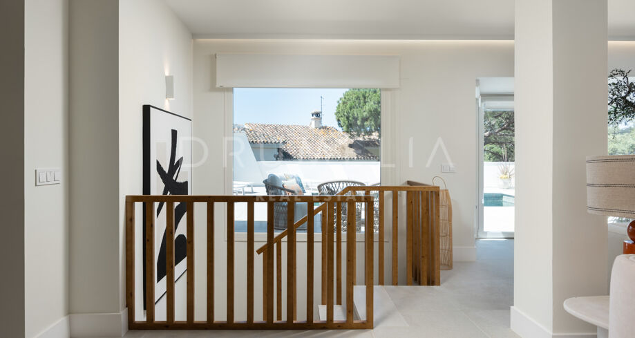 Denne nyrenoverte villaen ligger i det prestisjefylte boligområdet Cumbres de Elviria, øst i Marbella, og tilbyr tidløs eleganse og moderne komfort i rolige omgivelser nær strand, golf og internasjonale skoler. Med sydvendt orientering og en tomt på 1.424 m² byr eiendommen på 294 m² bebygd areal fordelt på to etasjer, gjennomsyret av naturlig lys og funksjonelle løsninger.