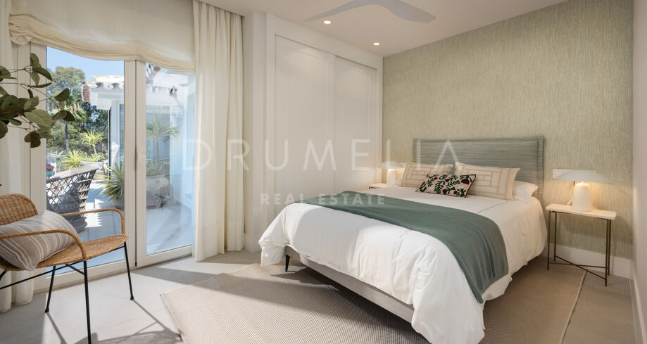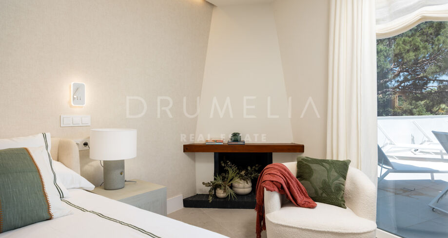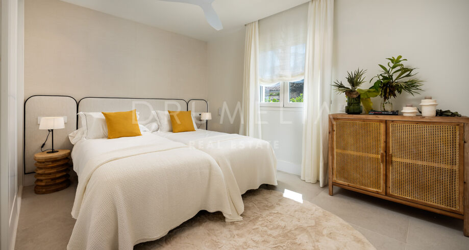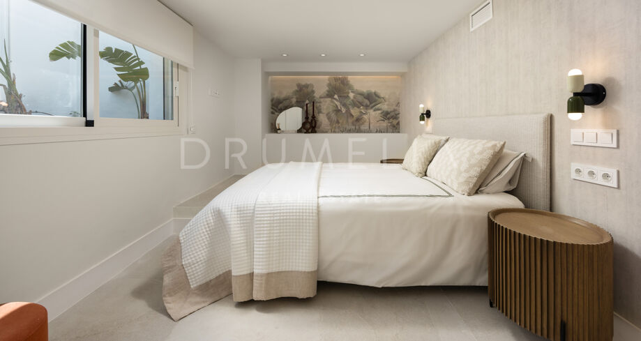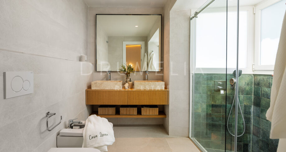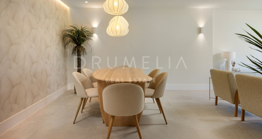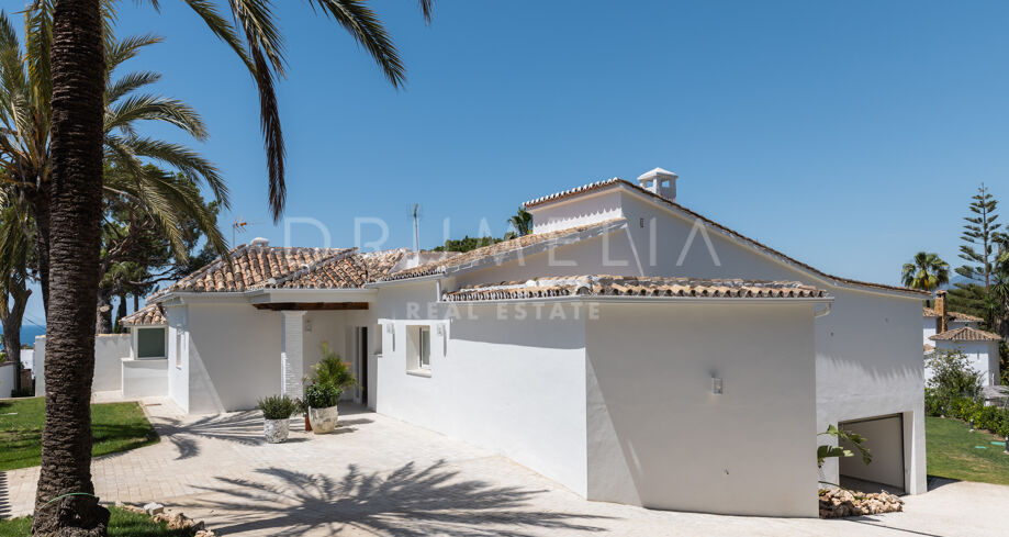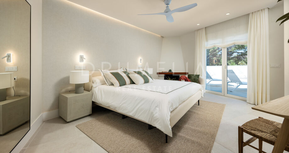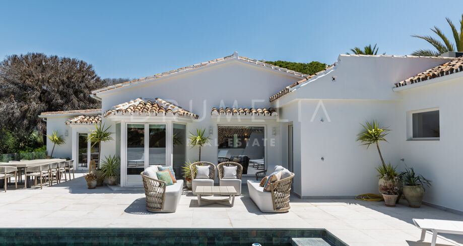 Denne nyrenoverte villaen ligger i det prestisjefylte boligområdet Cumbres de Elviria, øst i Marbella, og tilbyr tidløs eleganse og moderne komfort i rolige omgivelser nær strand, golf og internasjonale skoler. Med sydvendt orientering og en tomt på 1.424 m² byr eiendommen på 294 m² bebygd areal fordelt på to etasjer, gjennomsyret av naturlig lys og funksjonelle løsninger.