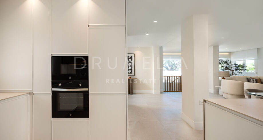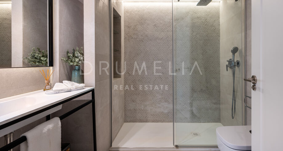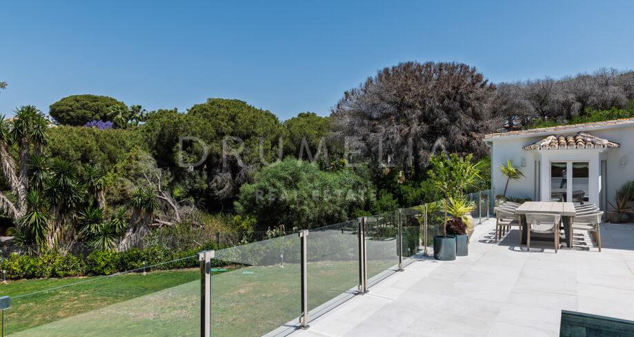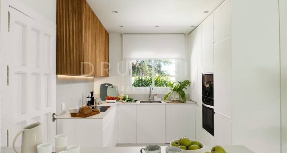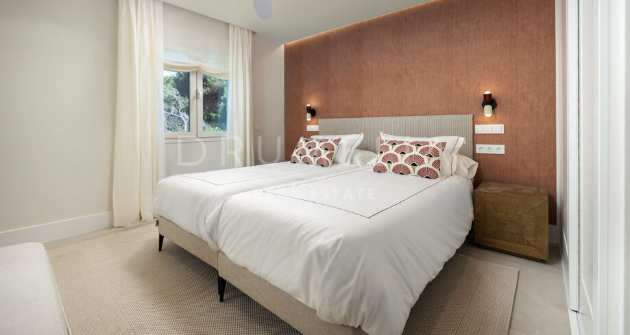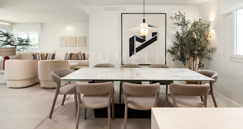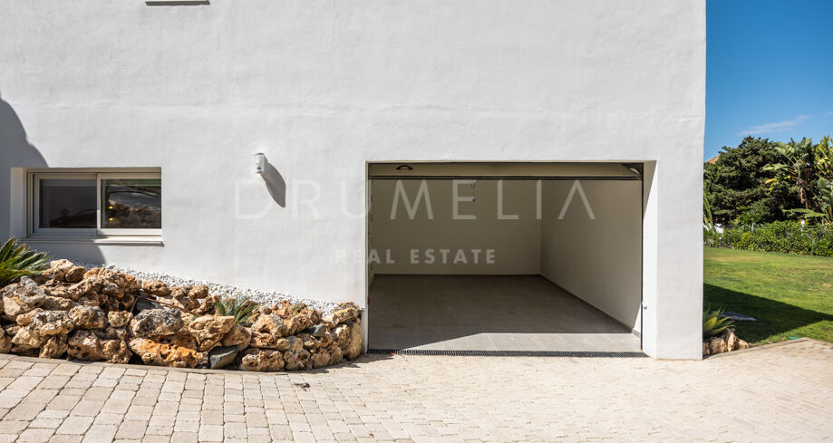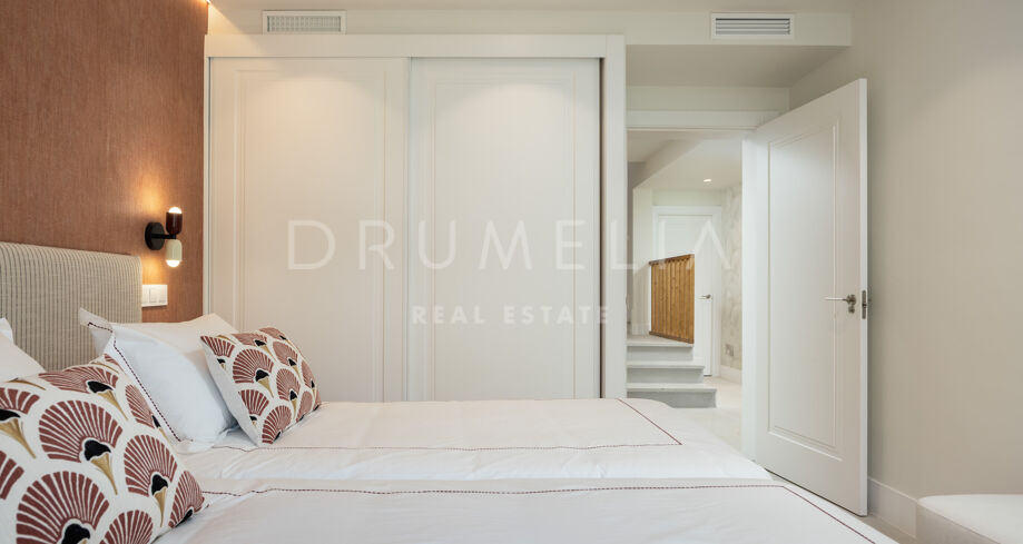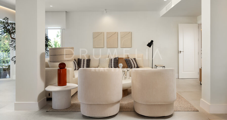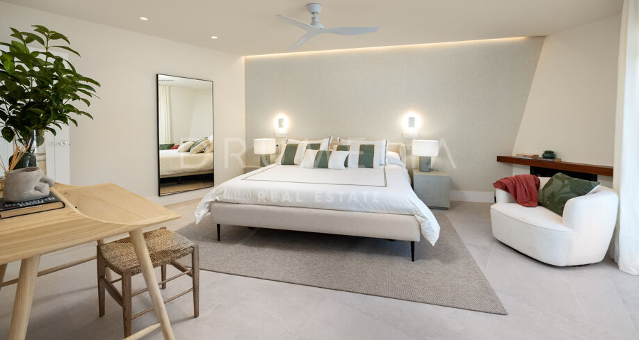 Denne nyrenoverte villaen ligger i det prestisjefylte boligområdet Cumbres de Elviria, øst i Marbella, og tilbyr tidløs eleganse og moderne komfort i rolige omgivelser nær strand, golf og internasjonale skoler. Med sydvendt orientering og en tomt på 1.424 m² byr eiendommen på 294 m² bebygd areal fordelt på to etasjer, gjennomsyret av naturlig lys og funksjonelle løsninger.