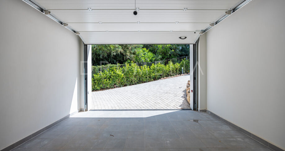 Hovedetasjen åpner opp til en lys stue- og spisestue med direkte tilgang til en 180 m² stor terrasse med basseng, loungeområde og vakre hageomgivelser. Det moderne kjøkkenet, utstyrt med Balay hvitevarer og porselensbenkeplater, har tilknyttet vaskerom og utgang til terrassen. Hovedsoverommet har peis, eget bad og utgang til terrassen ved bassenget. Tre andre soverom, to med direkte utgang, og to bad fullfører etasjen.