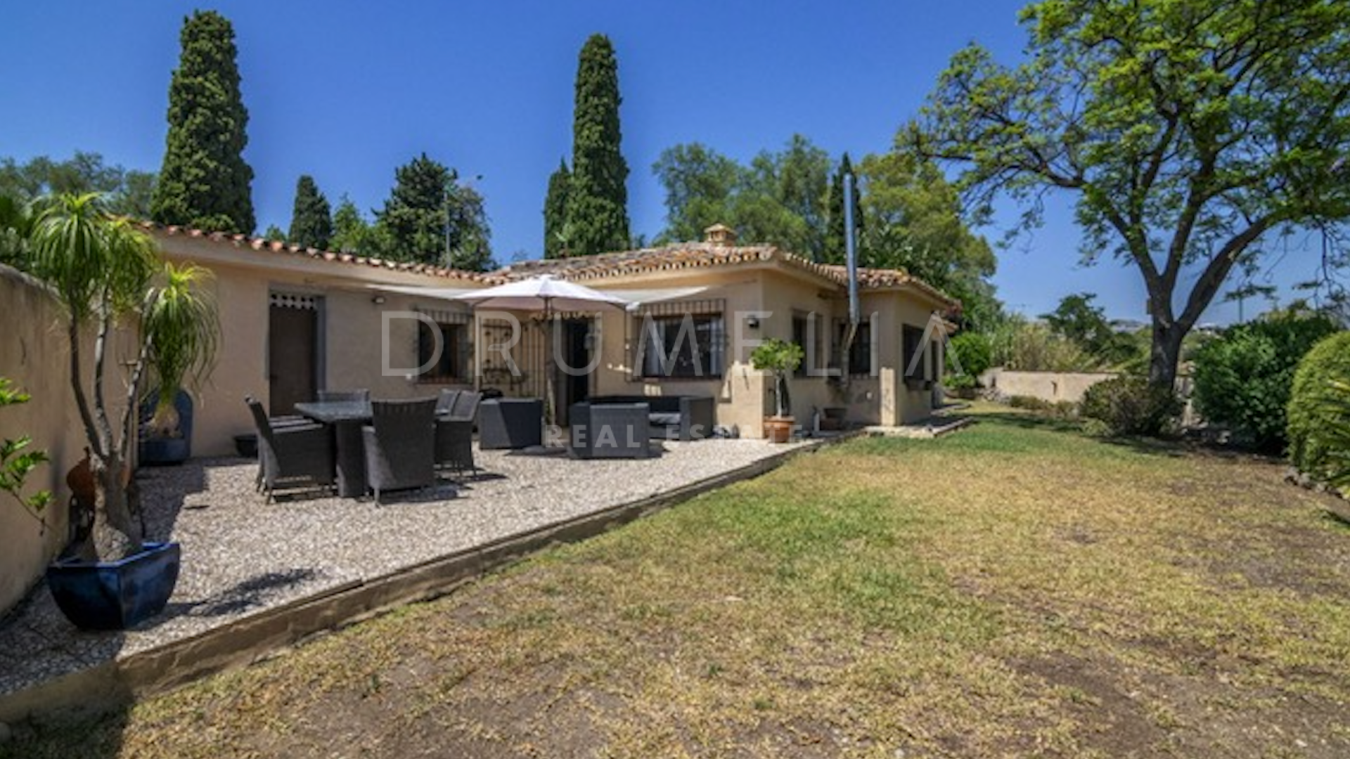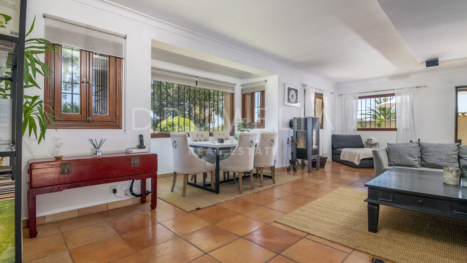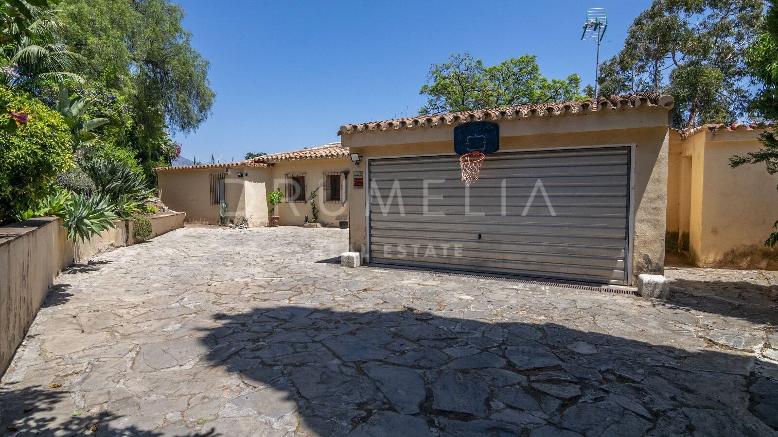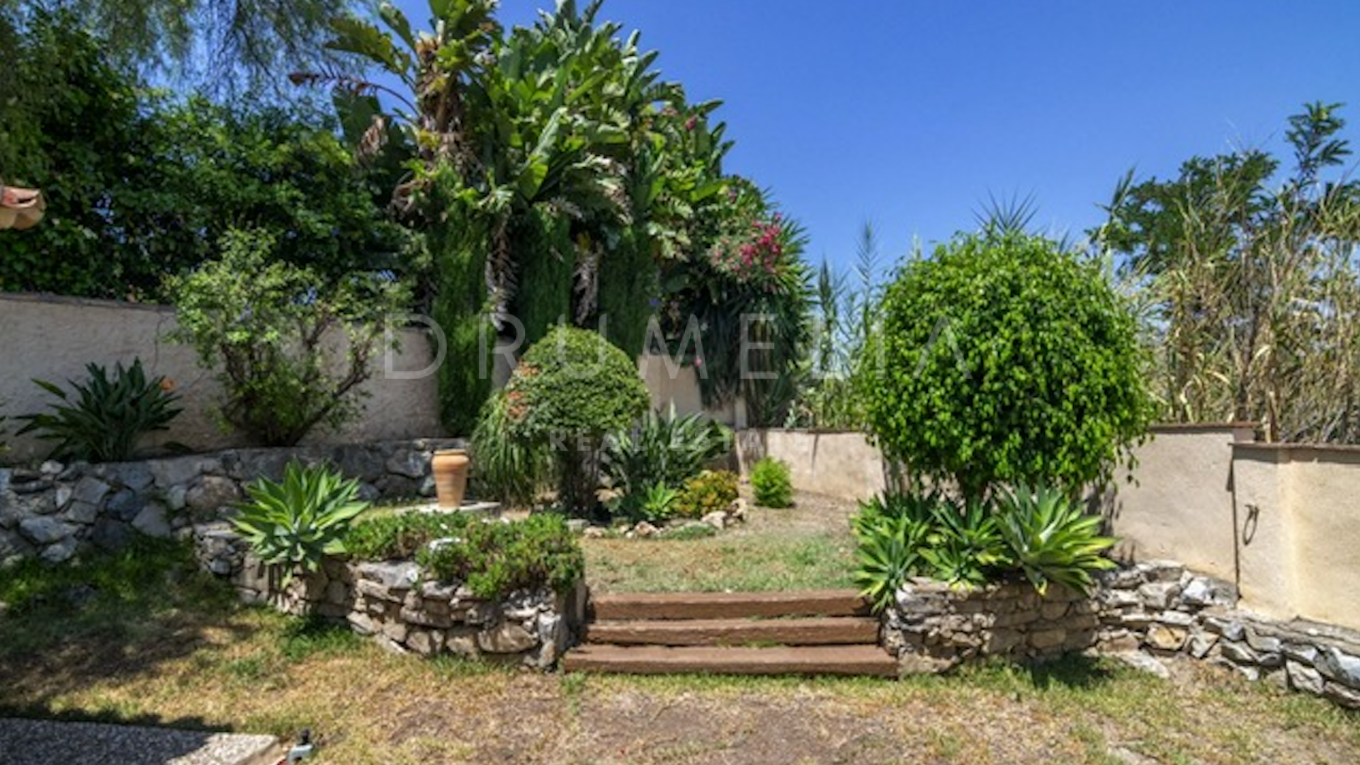 Denne enetasjes villaen er omgitt av grøntområder og privatliv, med en steinbelagt innkjørsel som fører til en romslig inngang og parkeringsplass. Uteområdet har velstelte hager med trær, busker og kaktuser, samt en terrasse med plass til både utendørs spising og avslapning. Beliggenheten er rolig og i nærkontakt med naturen.
