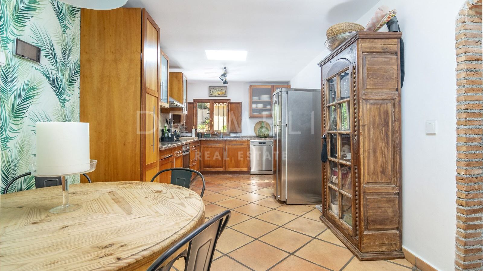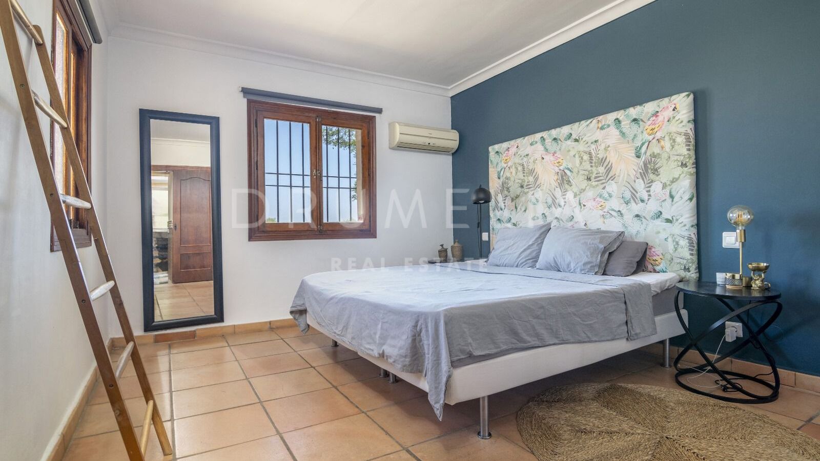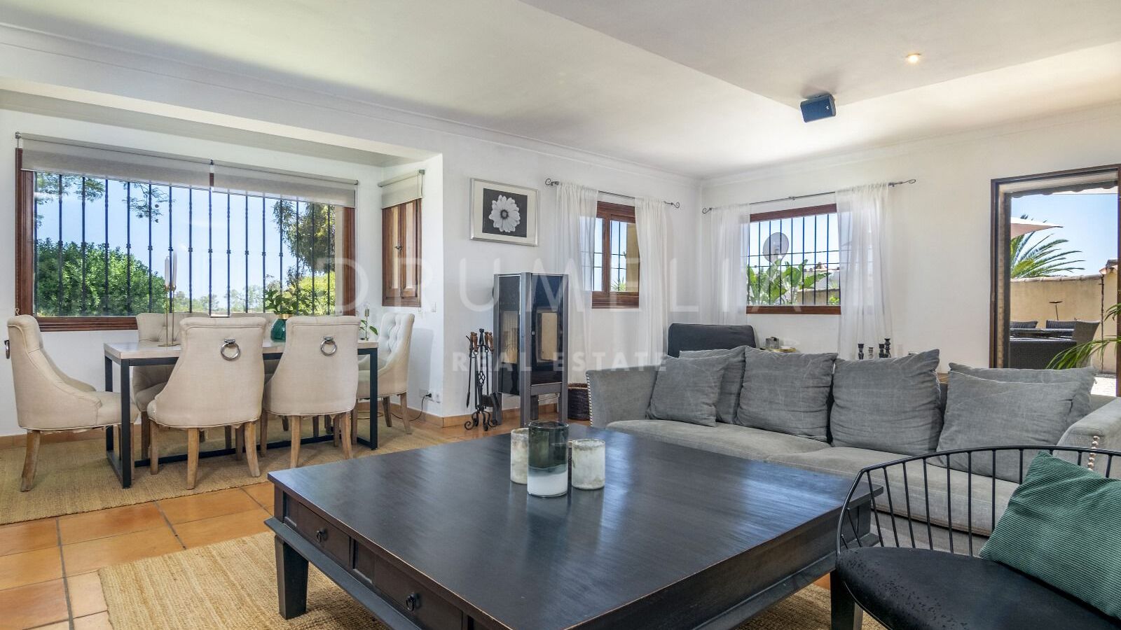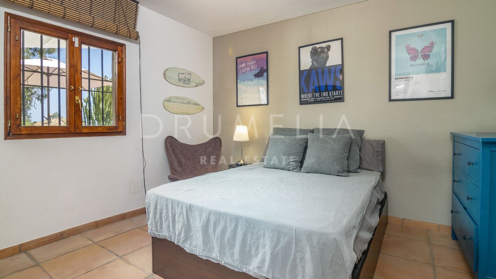 Denne enetasjes villaen er omgitt av grøntområder og privatliv, med en steinbelagt innkjørsel som fører til en romslig inngang og parkeringsplass. Uteområdet har velstelte hager med trær, busker og kaktuser, samt en terrasse med plass til både utendørs spising og avslapning. Beliggenheten er rolig og i nærkontakt med naturen.