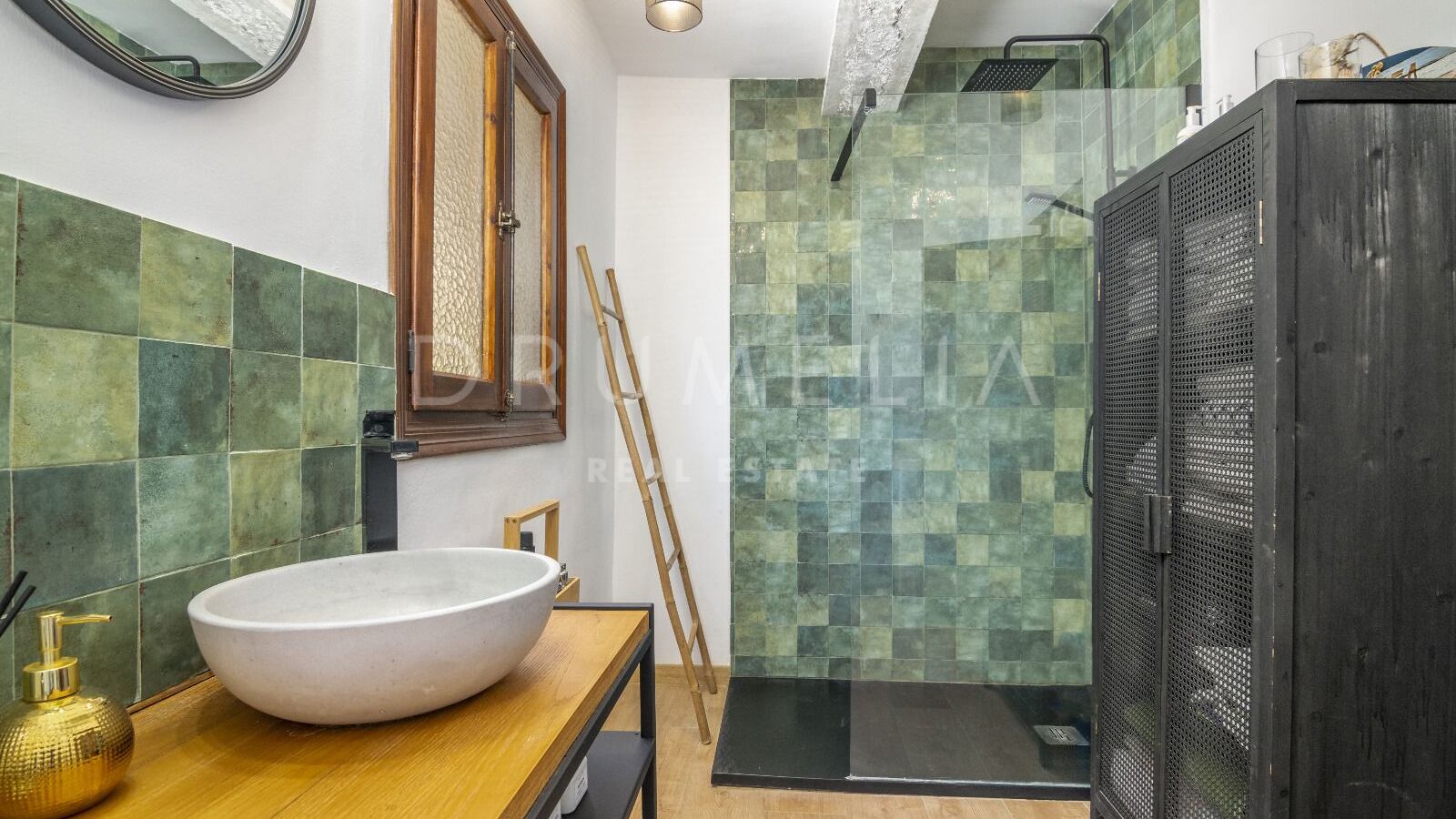Boligen har to komplette bad – ett med dusjhjørne og grønne keramiske fliser, og et større bad med doble vasker og detaljer i stein og murstein. Det er også mulig å bygge en etasje til, som gir mer boareal ved behov.