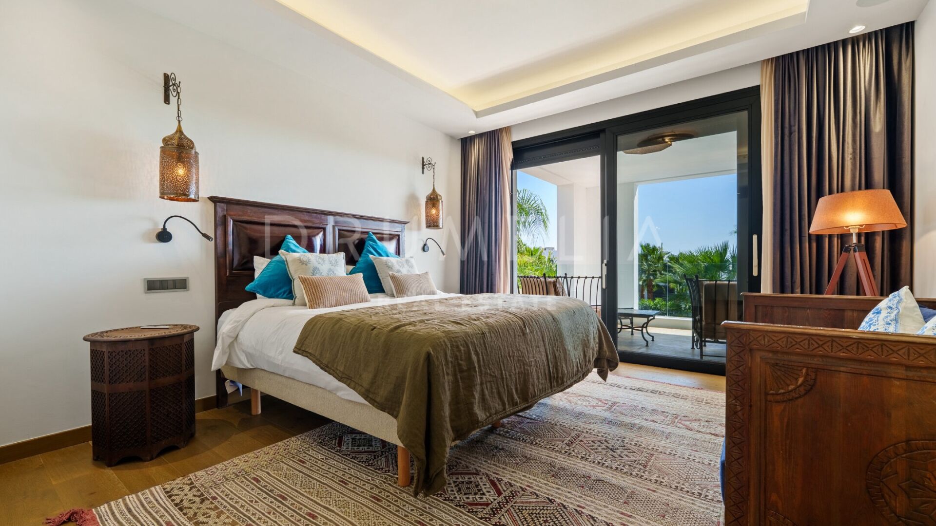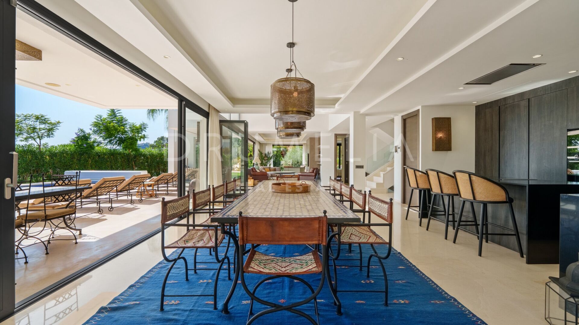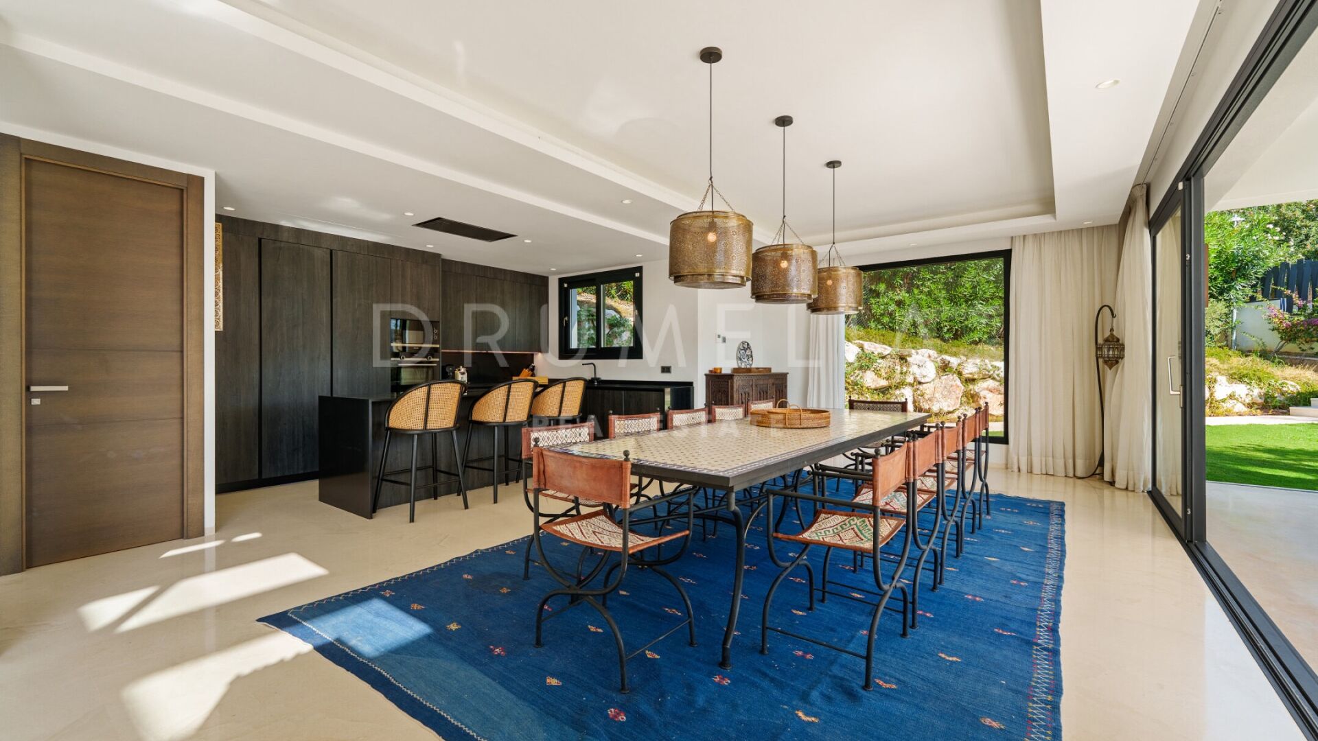 Denne vakre boligen i Haza del Conde, Nueva Andalucía, kombinerer moderne eleganse med klassisk andalusisk sjarm. Arkitekturen forener rene linjer med håndlagde detaljer og maurisk inspirasjon, som skaper en varm og sofistikert atmosfære. Store glassdører slipper inn rikelig med naturlig lys, mens spesialdesignede lamper, tekstiler og møbler gir personlighet og karakter.