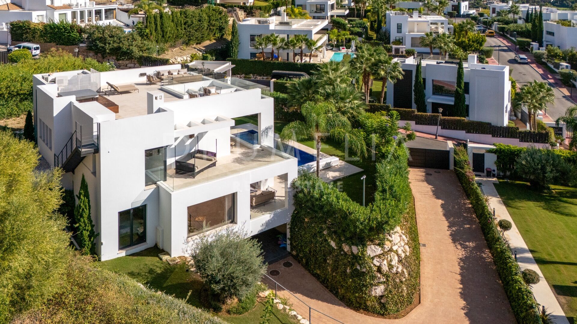 Boligen byr på romslige soverom med private terrasser, et underholdningsrom for filmkvelder og en takterrasse med panoramautsikt over golfdalen. Uteområdene har privat basseng, velstelte hager og spiseplasser i skyggefulle omgivelser. Eiendommen ligger i et inngjerdet og sikkert område nær Marbellas beste golfbaner, internasjonale skoler og strender og representerer den ekte middelhavslivsstilen.
