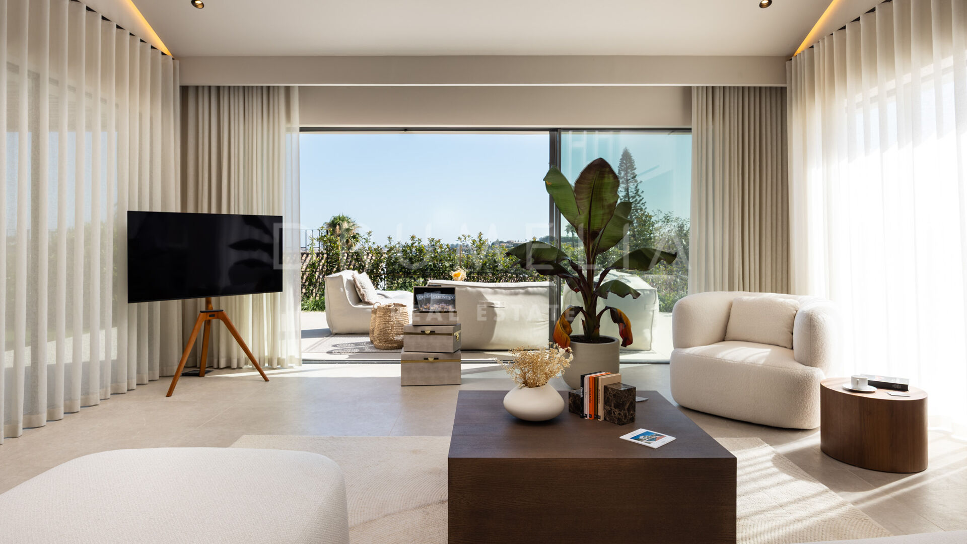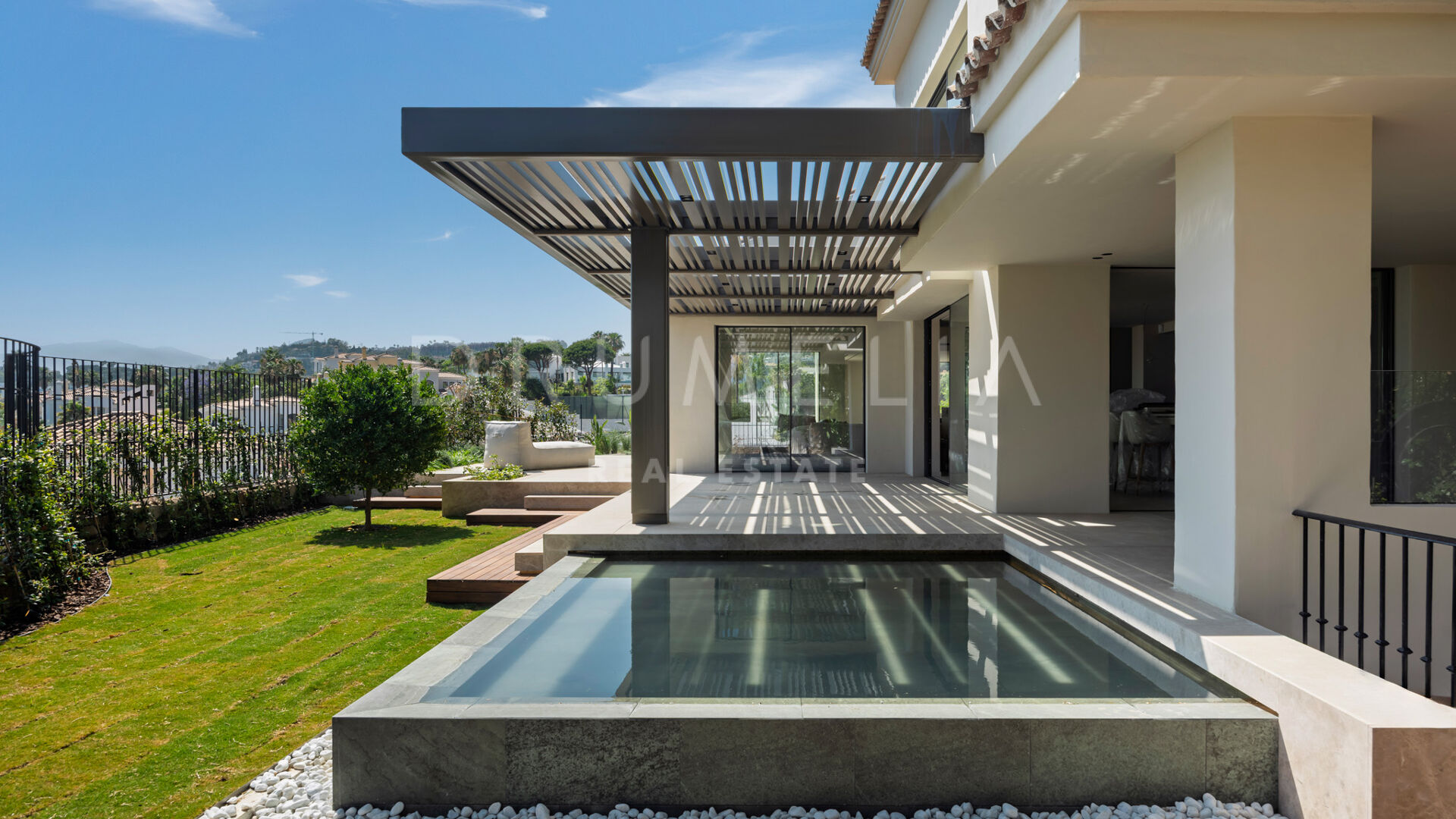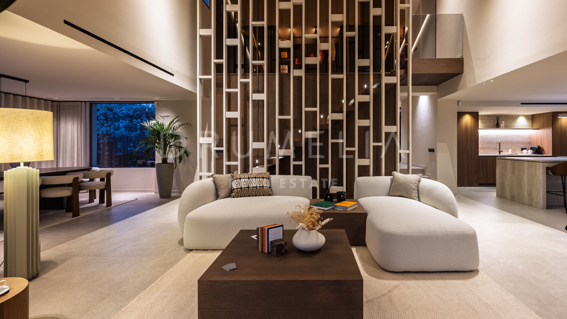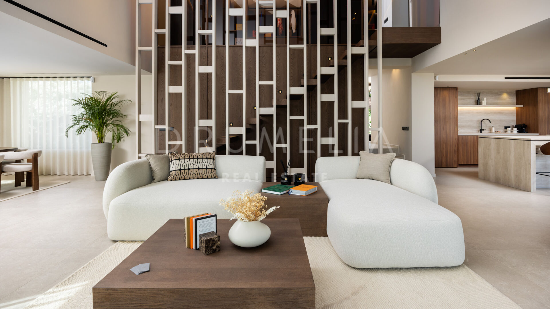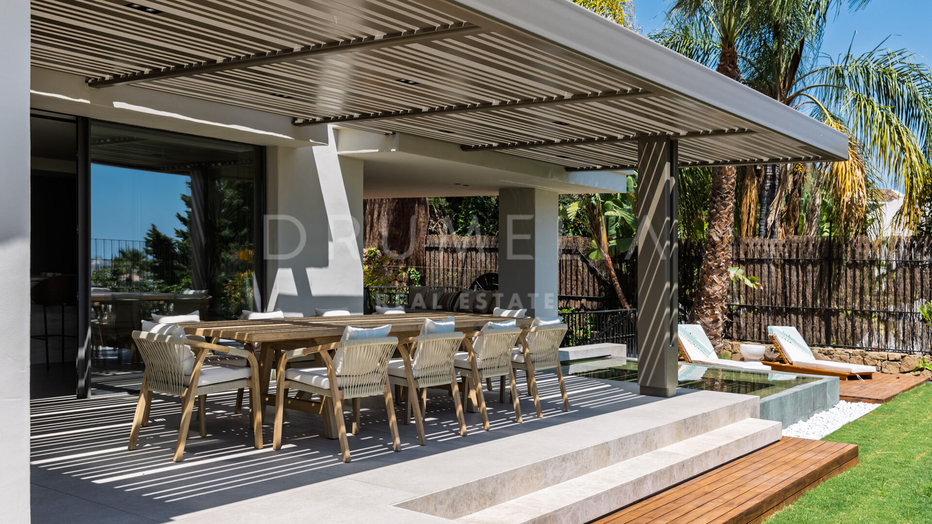 Denne moderne villaen ligger i det prestisjefylte Golf Valley i Nueva Andalucía og kombinerer moderne arkitektur med Bali-inspirert design og frodige, tropiske hager. Fullstendig redesignet og renovert i 2025, byr den på en sømløs overgang mellom innendørs og utendørs liv, der naturlig lys og eksklusive materialer skaper en rolig og raffinert atmosfære.