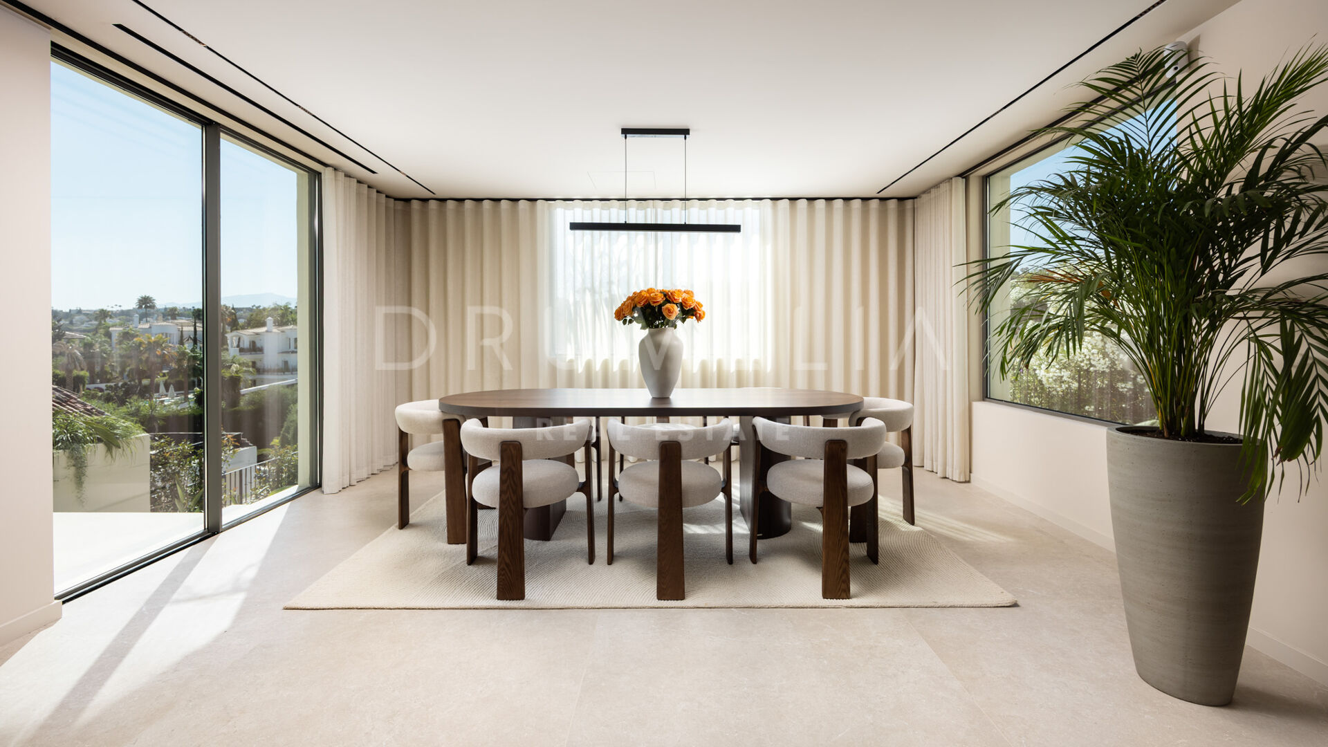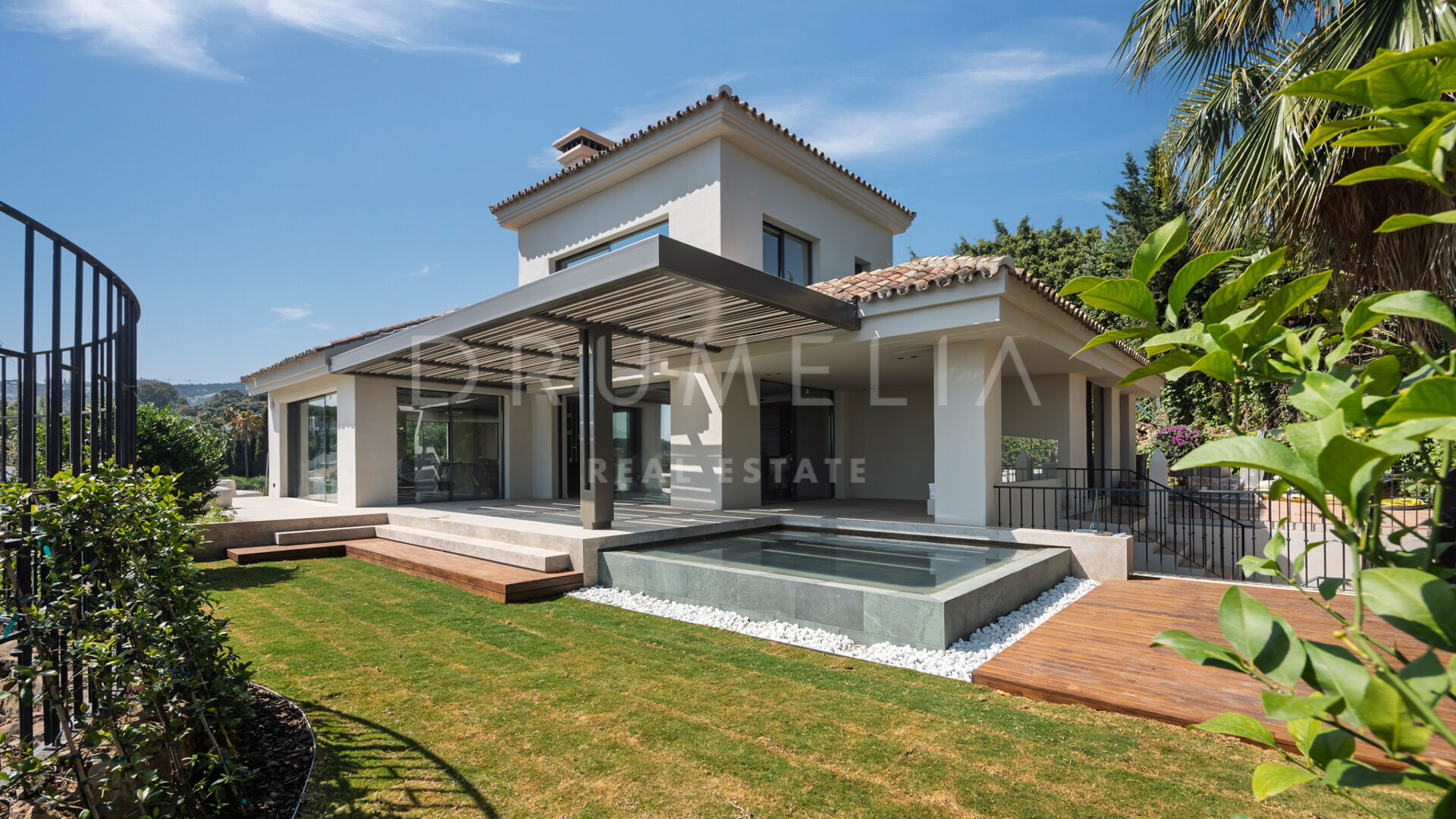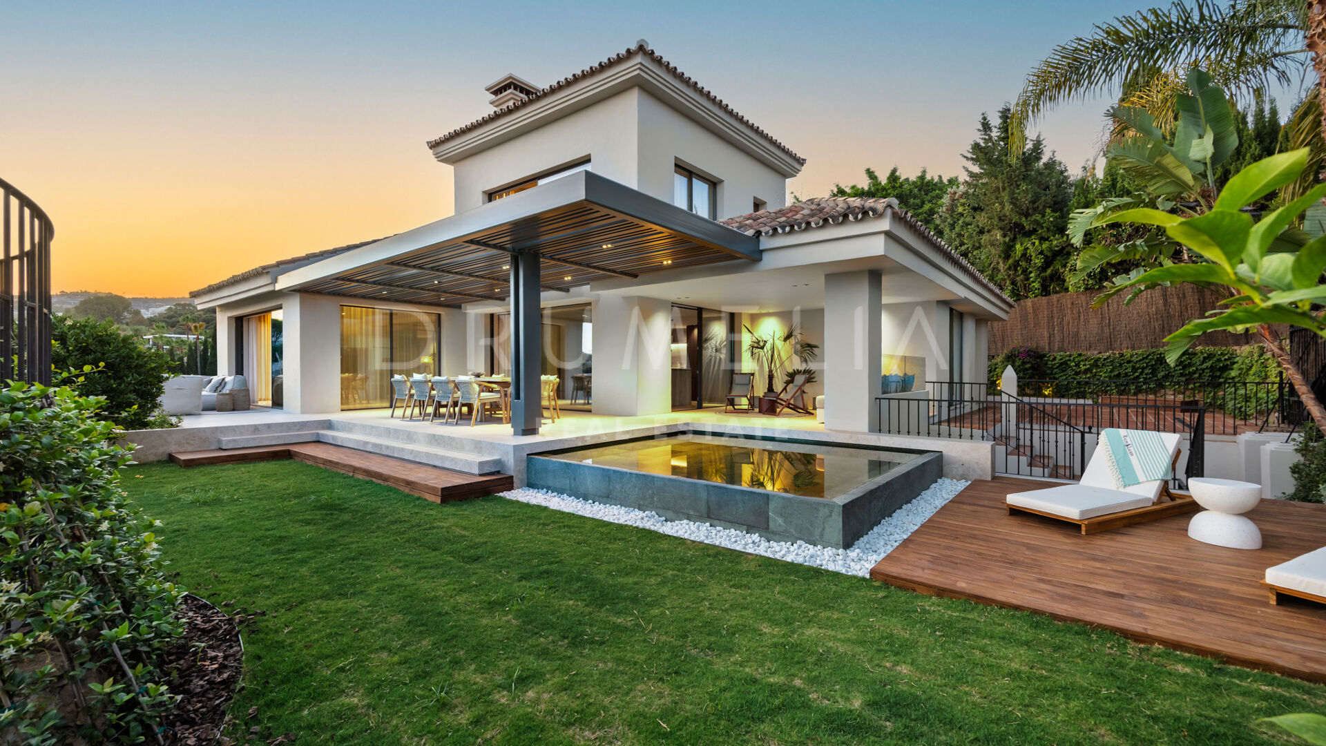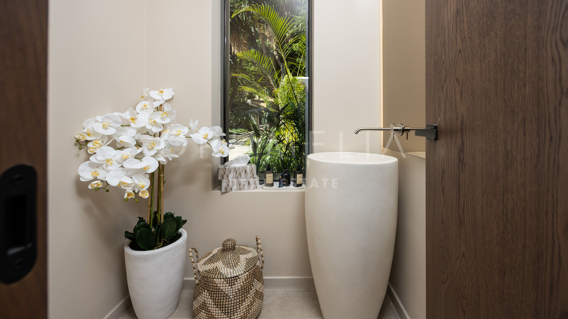 Denne moderne villaen ligger i det prestisjefylte Golf Valley i Nueva Andalucía og kombinerer moderne arkitektur med Bali-inspirert design og frodige, tropiske hager. Fullstendig redesignet og renovert i 2025, byr den på en sømløs overgang mellom innendørs og utendørs liv, der naturlig lys og eksklusive materialer skaper en rolig og raffinert atmosfære.