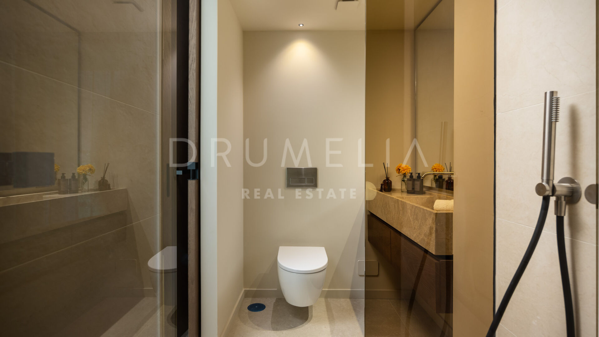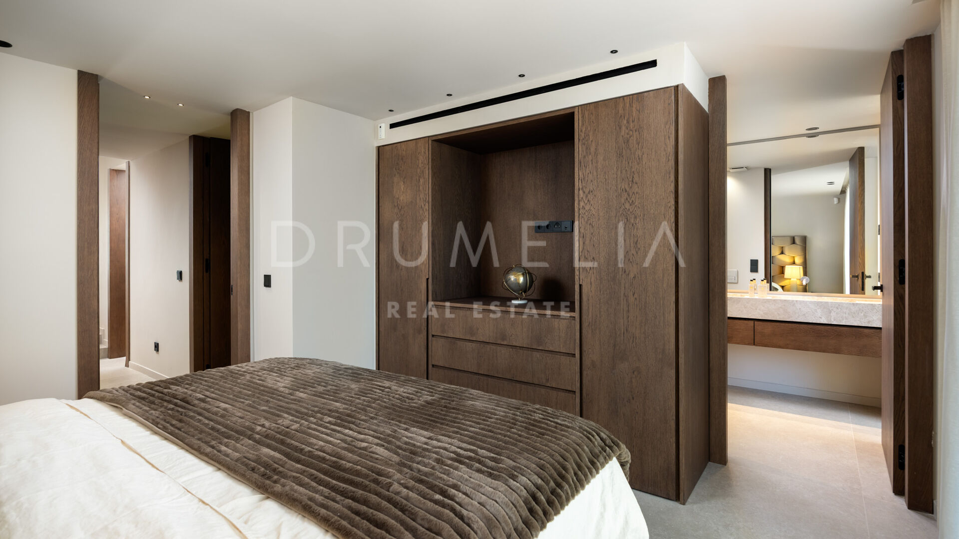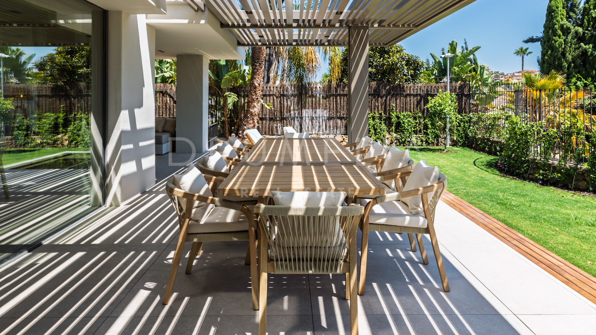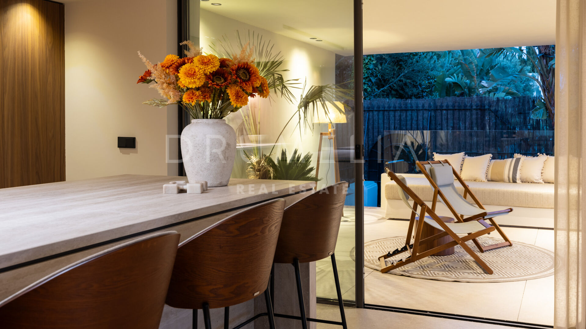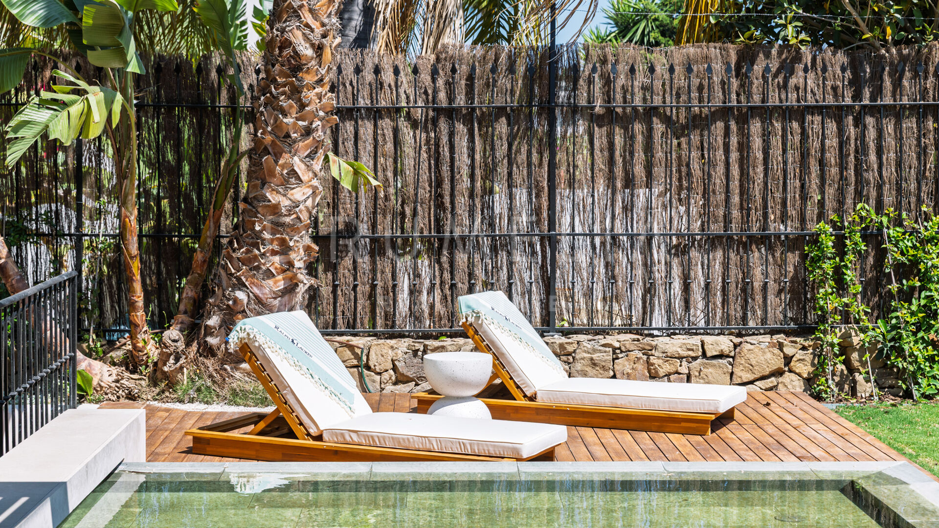 Denne moderne villaen ligger i det prestisjefylte Golf Valley i Nueva Andalucía og kombinerer moderne arkitektur med Bali-inspirert design og frodige, tropiske hager. Fullstendig redesignet og renovert i 2025, byr den på en sømløs overgang mellom innendørs og utendørs liv, der naturlig lys og eksklusive materialer skaper en rolig og raffinert atmosfære.