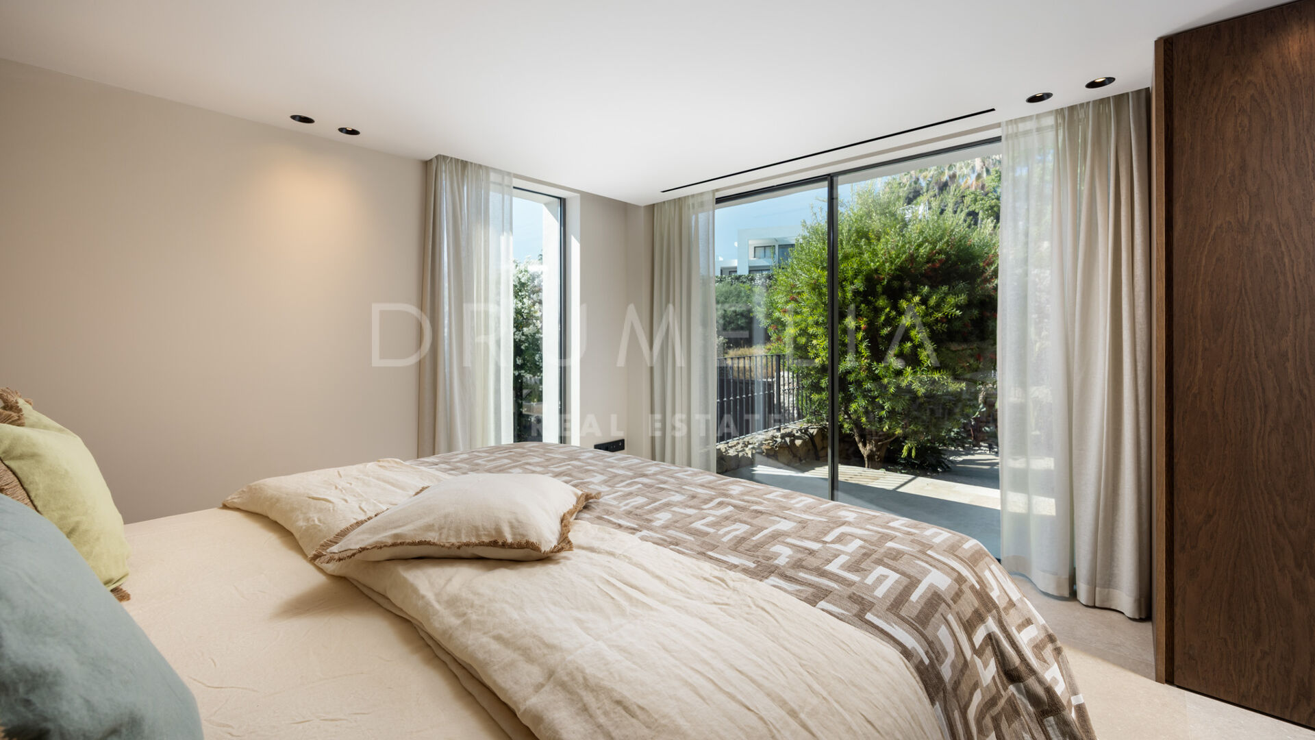 Innvendig fremheves romfølelsen av høye tak og store vinduer. Villaen består av fem soverom og seks bad, inkludert en imponerende hovedsuite med garderobe og åpen utsikt. Underetasjen rommer en separat leilighet, bar og fleksible rom som kan brukes til treningsrom, hjemmekino eller studio. Selges fullt møblert.
