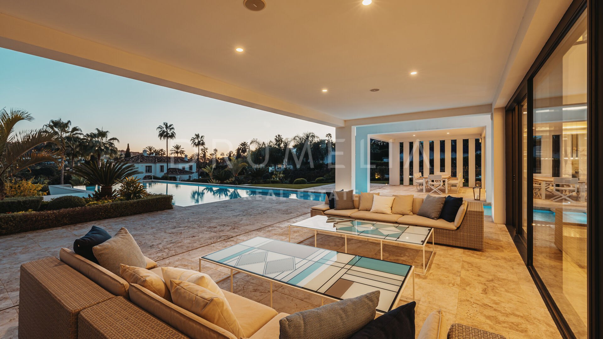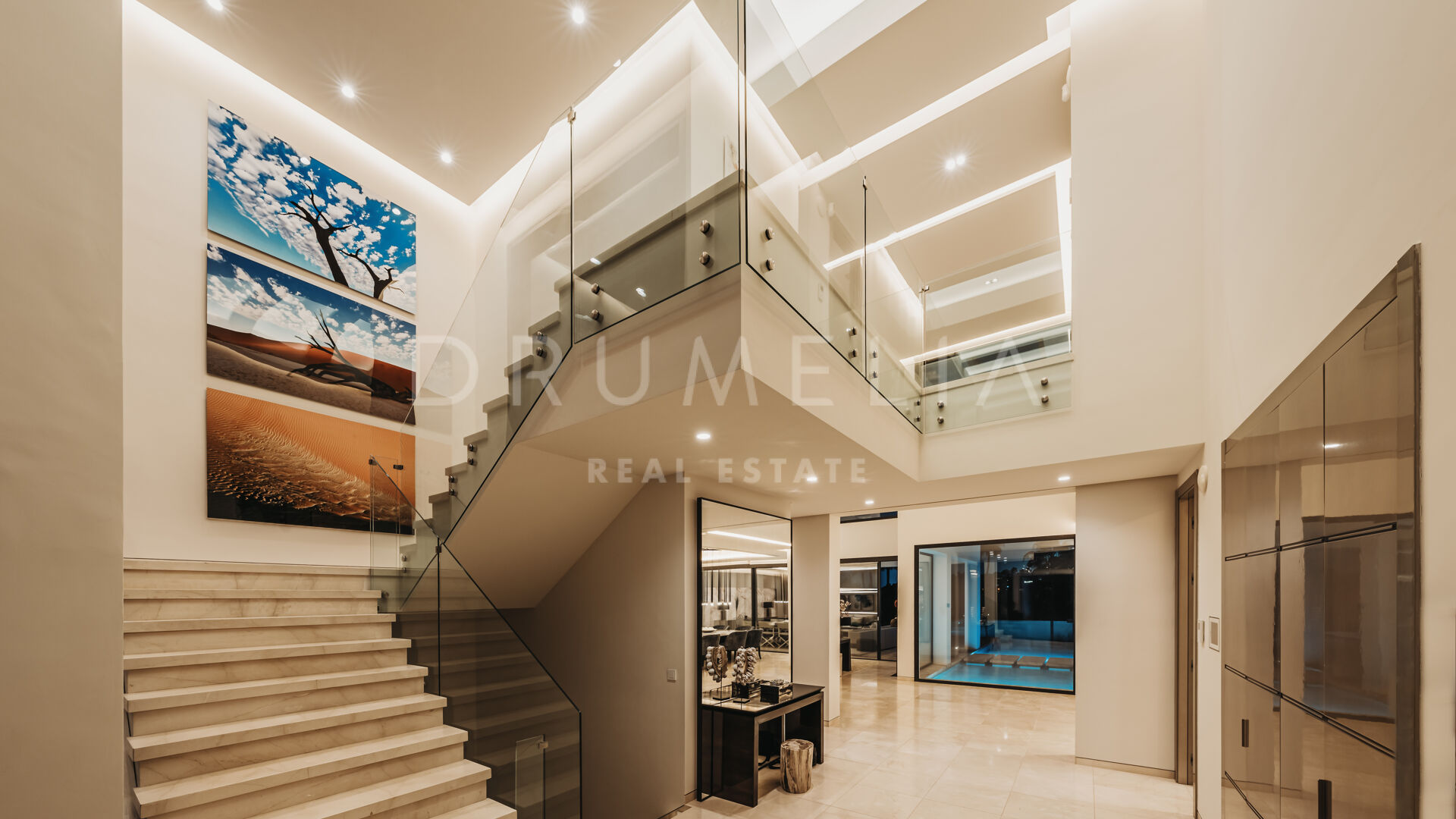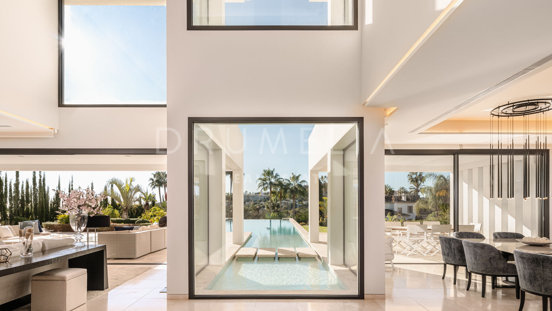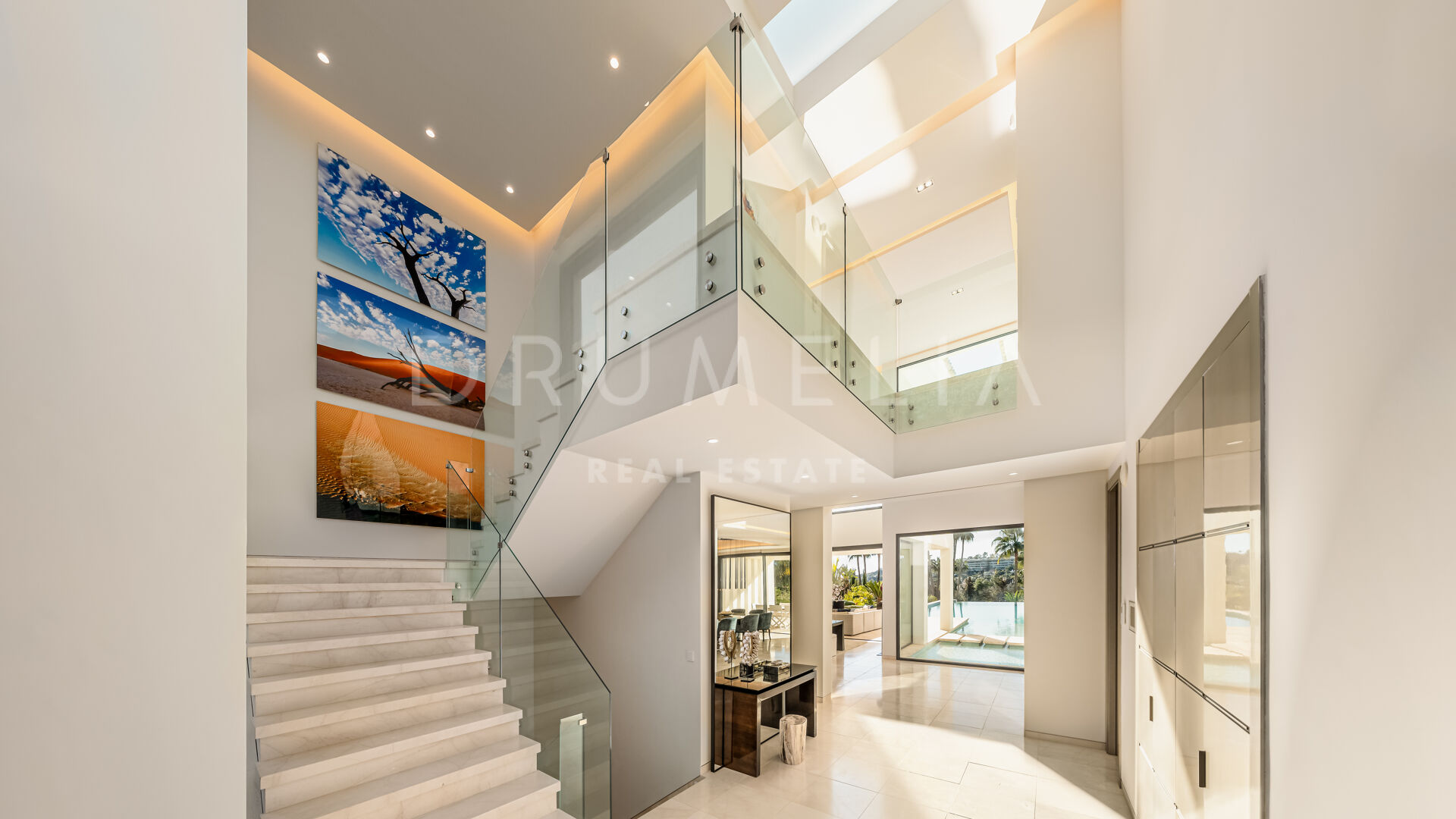 Dette spektakulære huset er omgitt av golfbaner og lignende luksuseiendommer i Nueva Andalucía, og er virkelig et av de mest eksepsjonelle husene i området. Det ligger i nærheten av alt du trenger: internasjonale skoler, butikker, restauranter og barer, flere golfbaner, et kasino, sandstrender og strandklubber, alle fasiliteter i livlige Nueva Andalucía, glamorøse Puerto Banus, San Pedro og Marbella sentrum.