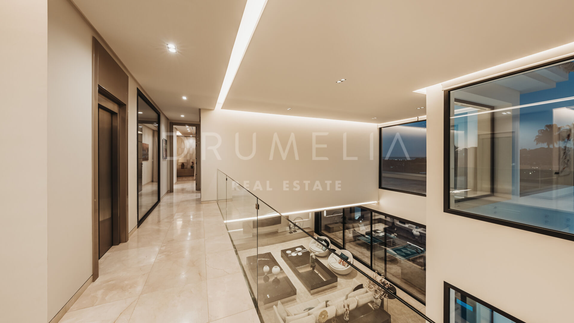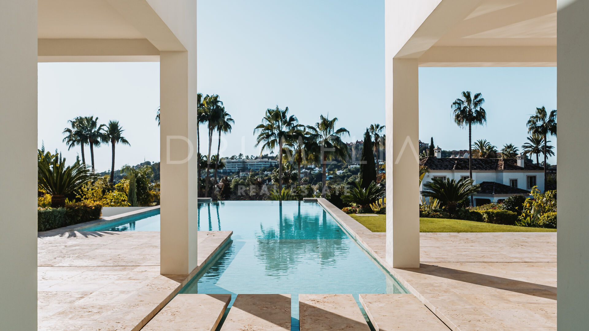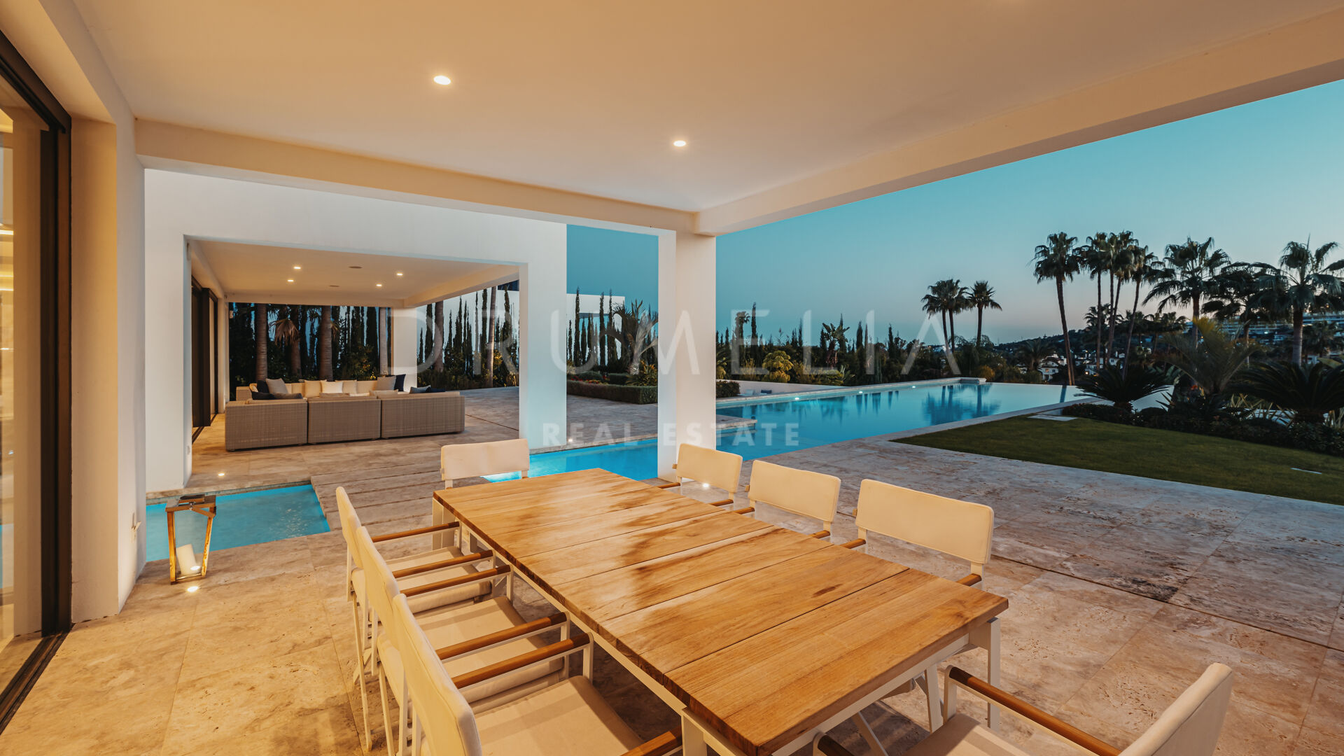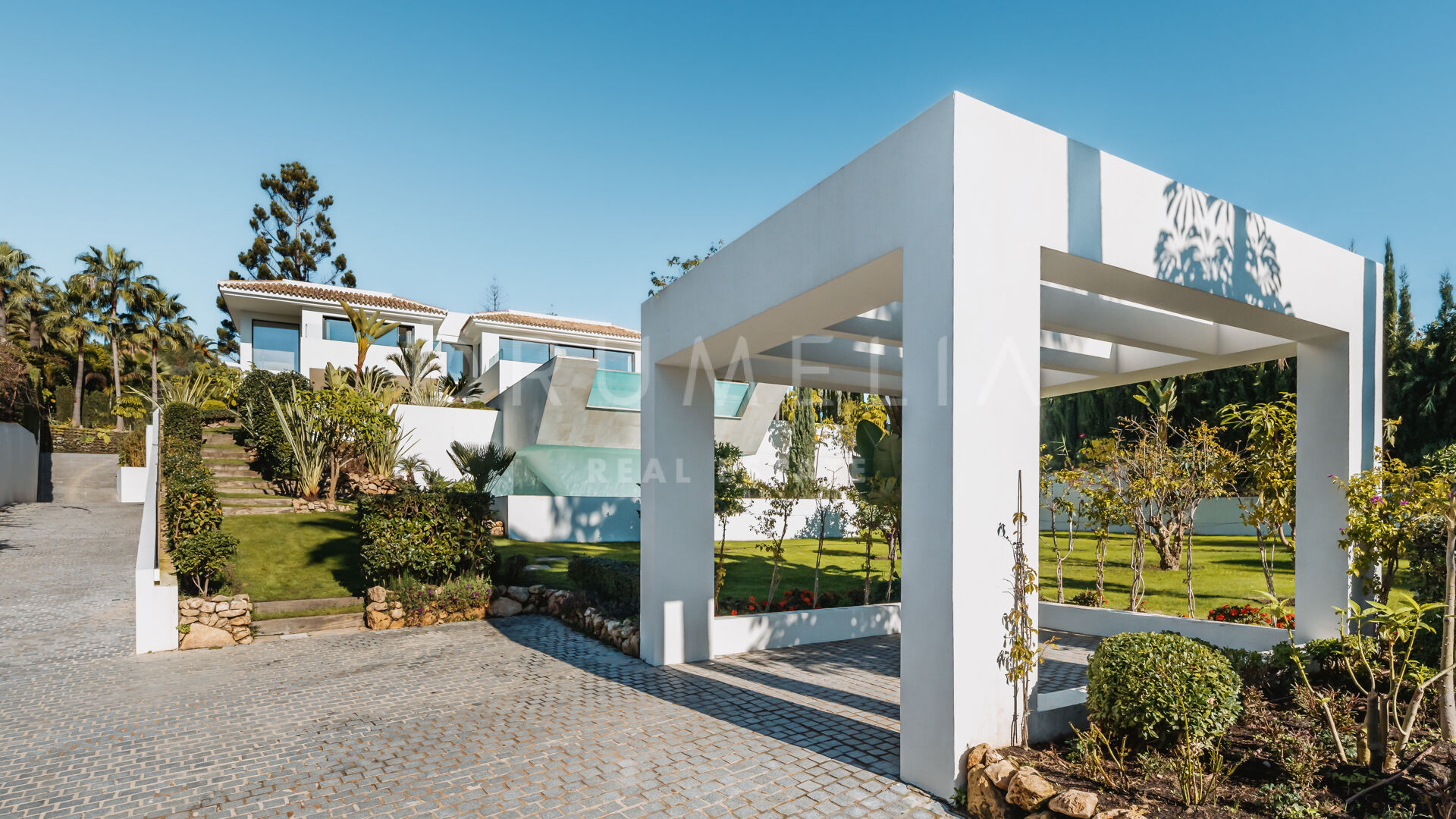 Denne luksuriøse ferieboligen på 966 m² ligger på en stor, høytliggende tomt på 2 104 m², og har perfekt utsikt over de idylliske omgivelsene, golfbanen og fjellene, inkludert La Concha-fjellet, Marbellas majestetiske symbol. Huset imponerer med sin elegante arkitektur i moderne middelhavsstil, åpne, moderne og elegante rom med stilig interiørdesign og de nyeste teknologiske fremskrittene. Dette splitter nye, skreddersydde huset er ferdigstilt i henhold til de høyeste kvalitetsstandardene, med materialer av topp kvalitet overalt.
