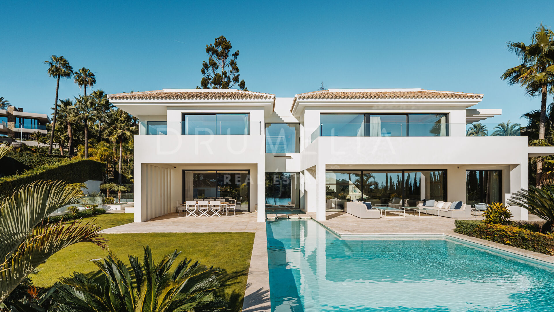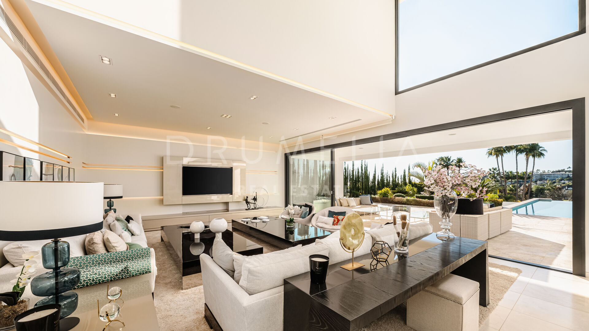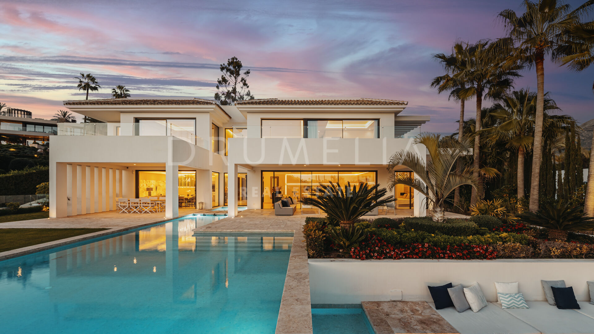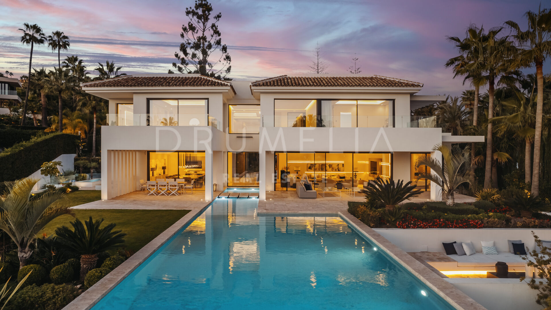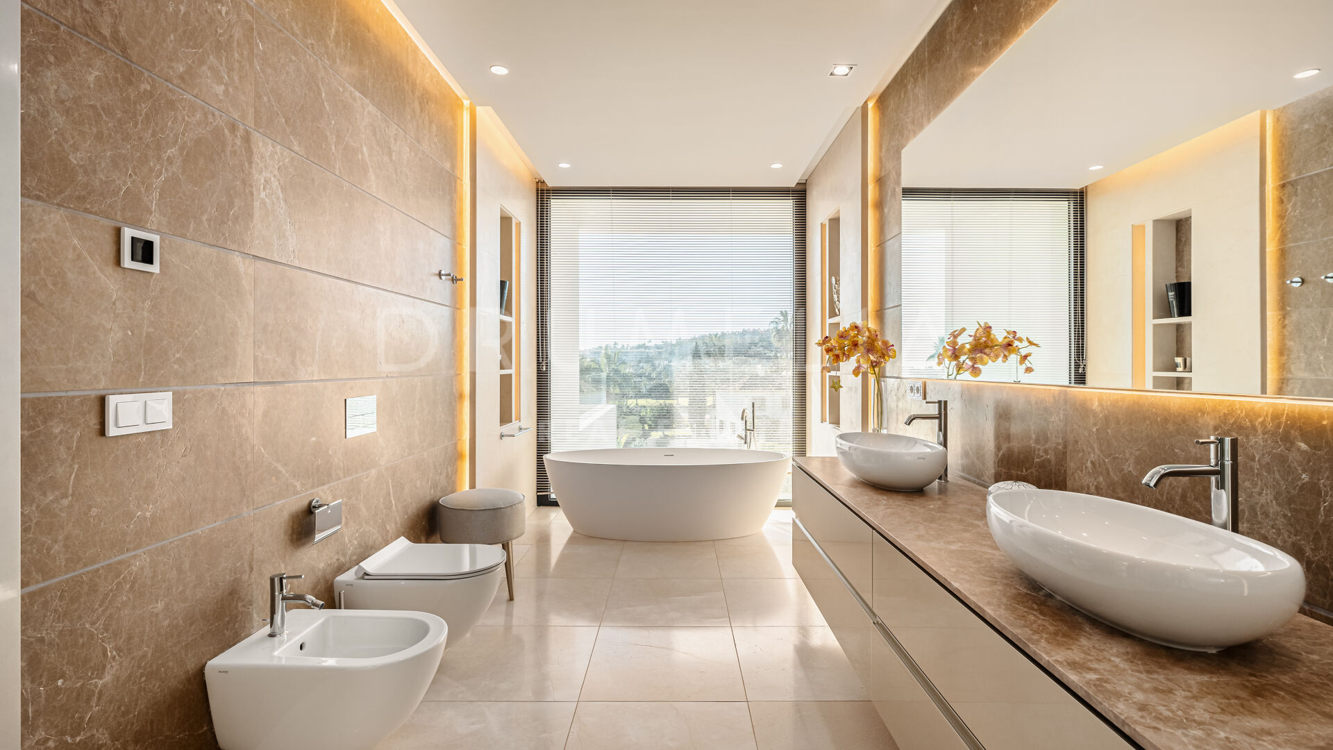 Denne luksuriøse ferieboligen på 966 m² ligger på en stor, høytliggende tomt på 2 104 m², og har perfekt utsikt over de idylliske omgivelsene, golfbanen og fjellene, inkludert La Concha-fjellet, Marbellas majestetiske symbol. Huset imponerer med sin elegante arkitektur i moderne middelhavsstil, åpne, moderne og elegante rom med stilig interiørdesign og de nyeste teknologiske fremskrittene. Dette splitter nye, skreddersydde huset er ferdigstilt i henhold til de høyeste kvalitetsstandardene, med materialer av topp kvalitet overalt.