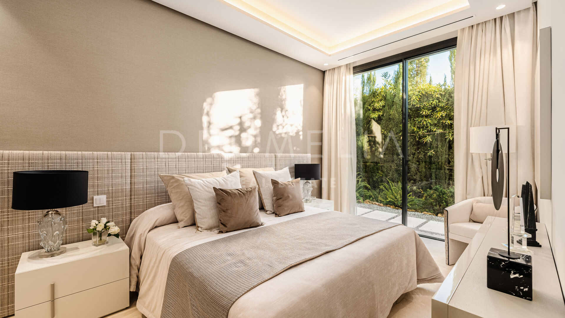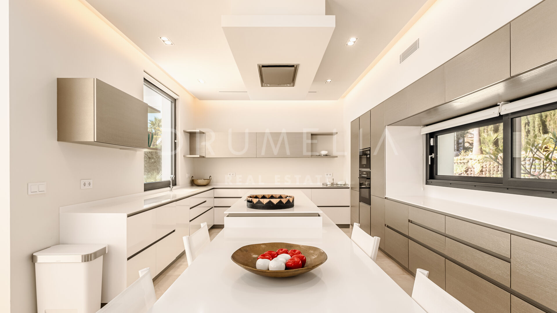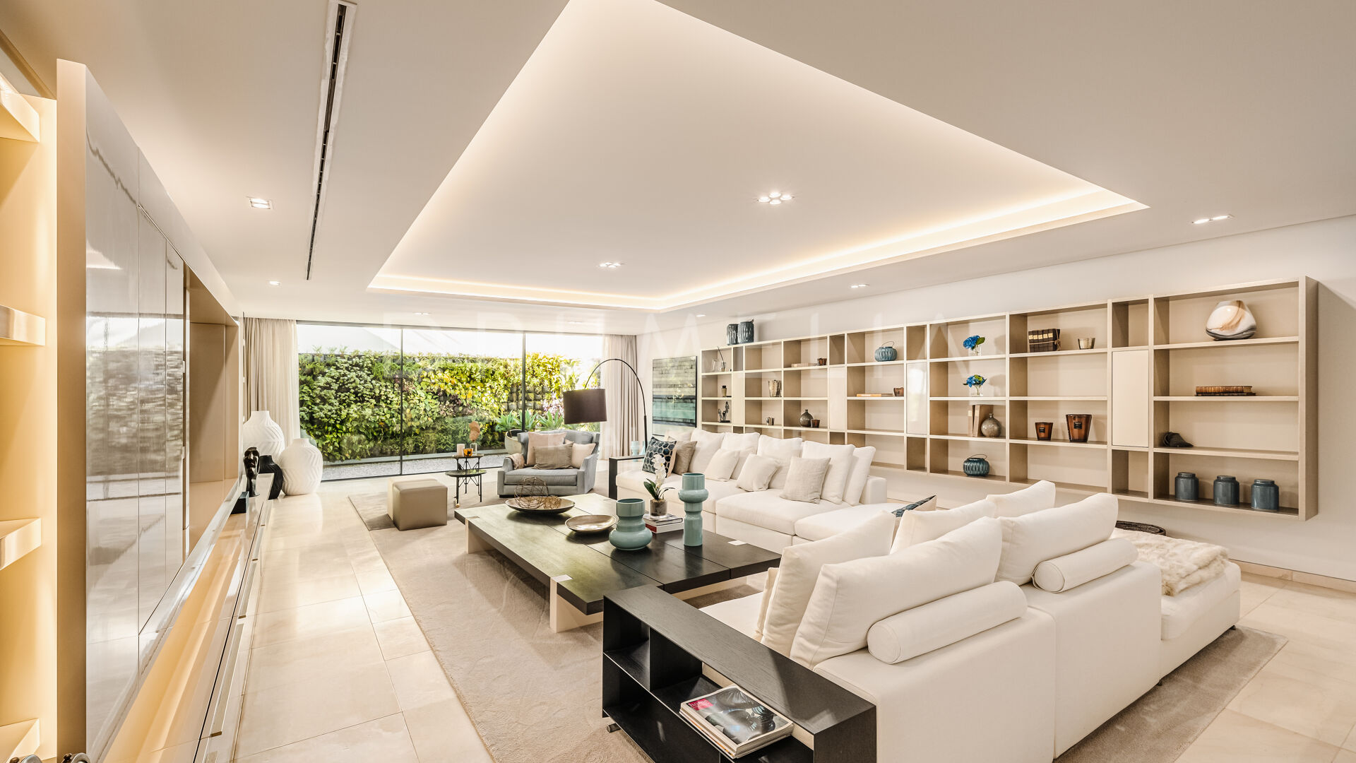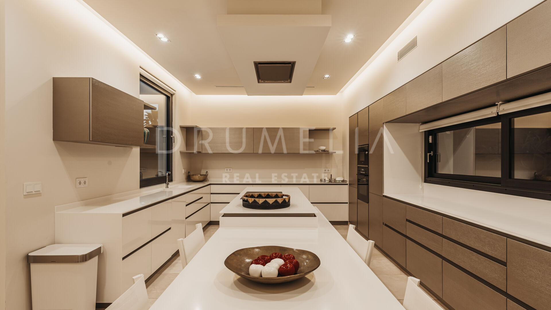 Denne moderne villaen til salgs i det prestisjetunge området La Cerquilla ligger i hjertet av Golf Valley, nær alle fasiliteter i Nueva Andalucía, flotte golfbaner og verdensberømte Puerto Banus.
