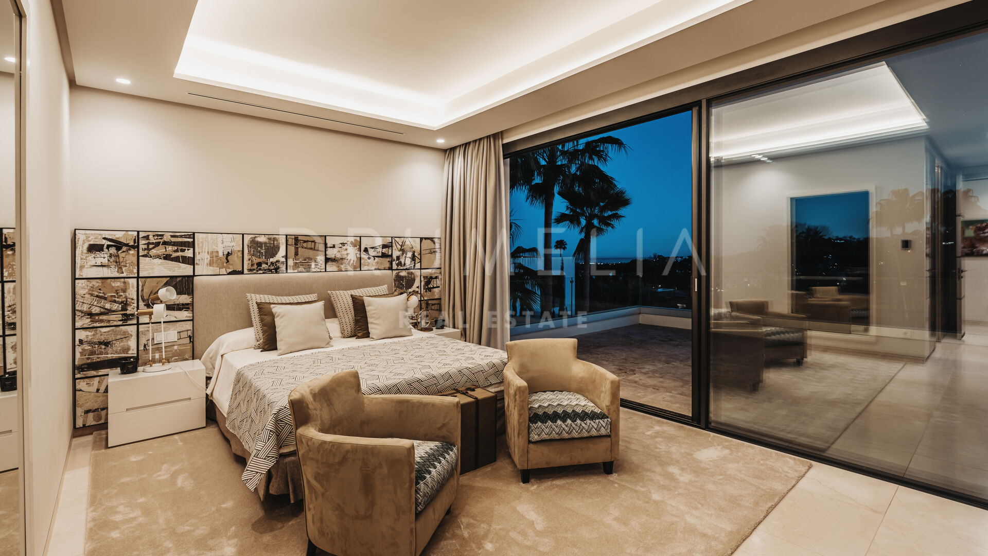 Denne fantastiske villaen er fordelt over 3 plan og har 6 soverom, 6 supermoderne bad og 2 toaletter. Du blir ønsket velkommen inn i en imponerende entré med dobbel takhøyde, som fører til en stor åpen stue. Den store, elegante stuen er innredet med møbler av høy kvalitet og har utsikt over den subtropiske hagen. Den er forbundet med en imponerende spiseplass og et toppmoderne, elegant kjøkken. Stuen og spisestuen har direkte utgang til de overbygde og uoverbygde terrassene, med flere chill-out- og uteserveringsområder og et evighetsbasseng med wow-faktor. I andre etasje er det romslige, rolige soverom med utsikt over de grønne teppene på Los Naranjos Golf. I underetasjen finner du et ekstra stort underholdningsområde med TV-rom og mulighet for å tilpasse flere funksjoner.