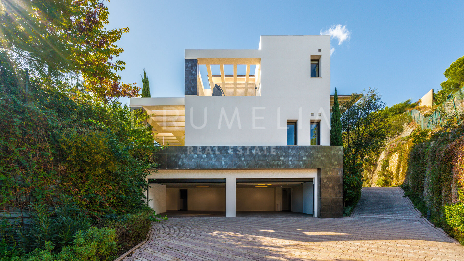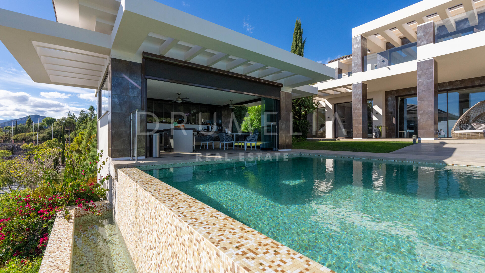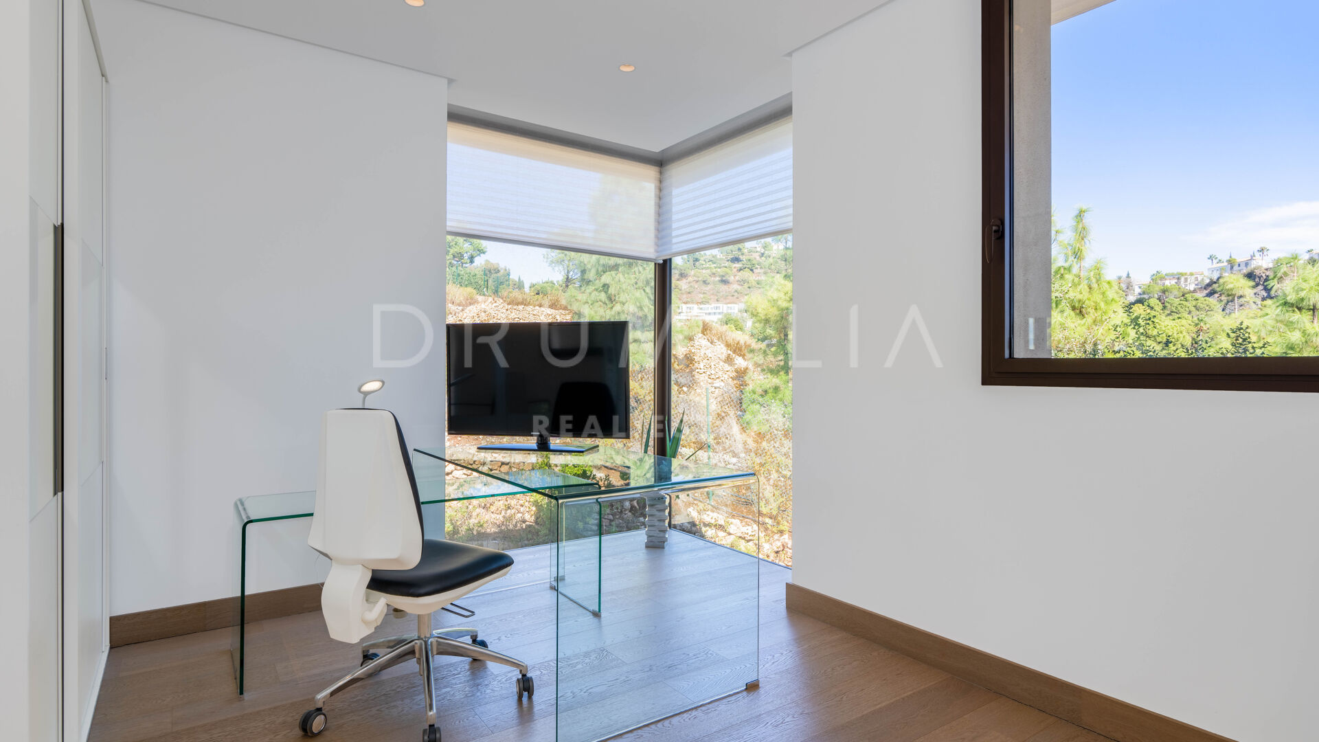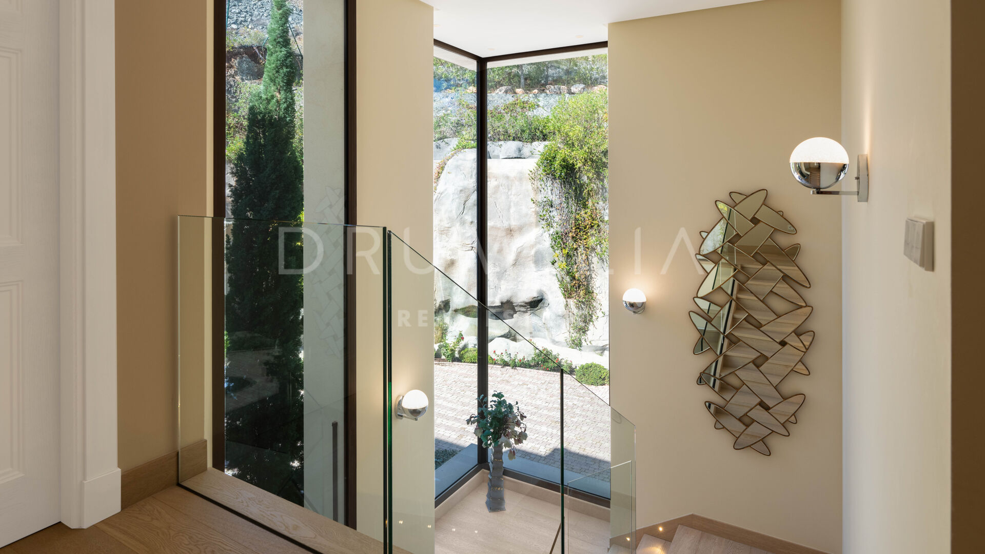 Glassdørene og de store vinduene slipper inn rikelig med naturlig lys i hele huset. Rommene vender ut mot de flotte terrassene, en subtropisk hage med grønne plener, anlagte områder og en solterrasse. Et imponerende svømmebasseng på 12×6 meter med sjøsaltfiltreringssystem innbyr til avkjøling på varme dager eller til storslåtte bassengfester året rundt. Marbella-området er kjent for det beste været på det europeiske kontinentet, og bassenget er oppvarmet. En innglasset paviljong og chill-out-område har et komplett kjøkken, ideelt for grilling og middager i det fri. En privat garasje har plass til fire biler. Denne eksklusive, moderne villaen er selve innbegrepet av luksus og har mange attraktive detaljer, blant annet heis, tregulv, gulvvarme og klimaanlegg i hele huset, garderober, LED-lys osv. Det nøytrale fargevalget skaper en virkelig rolig atmosfære. Ultramoderne møter avslapping i denne luksuriøse eiendommen, som tilbyr den perfekte blandingen av middelhavsnyanse og funksjonalitet!