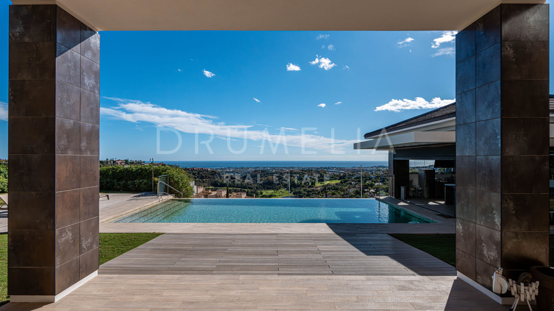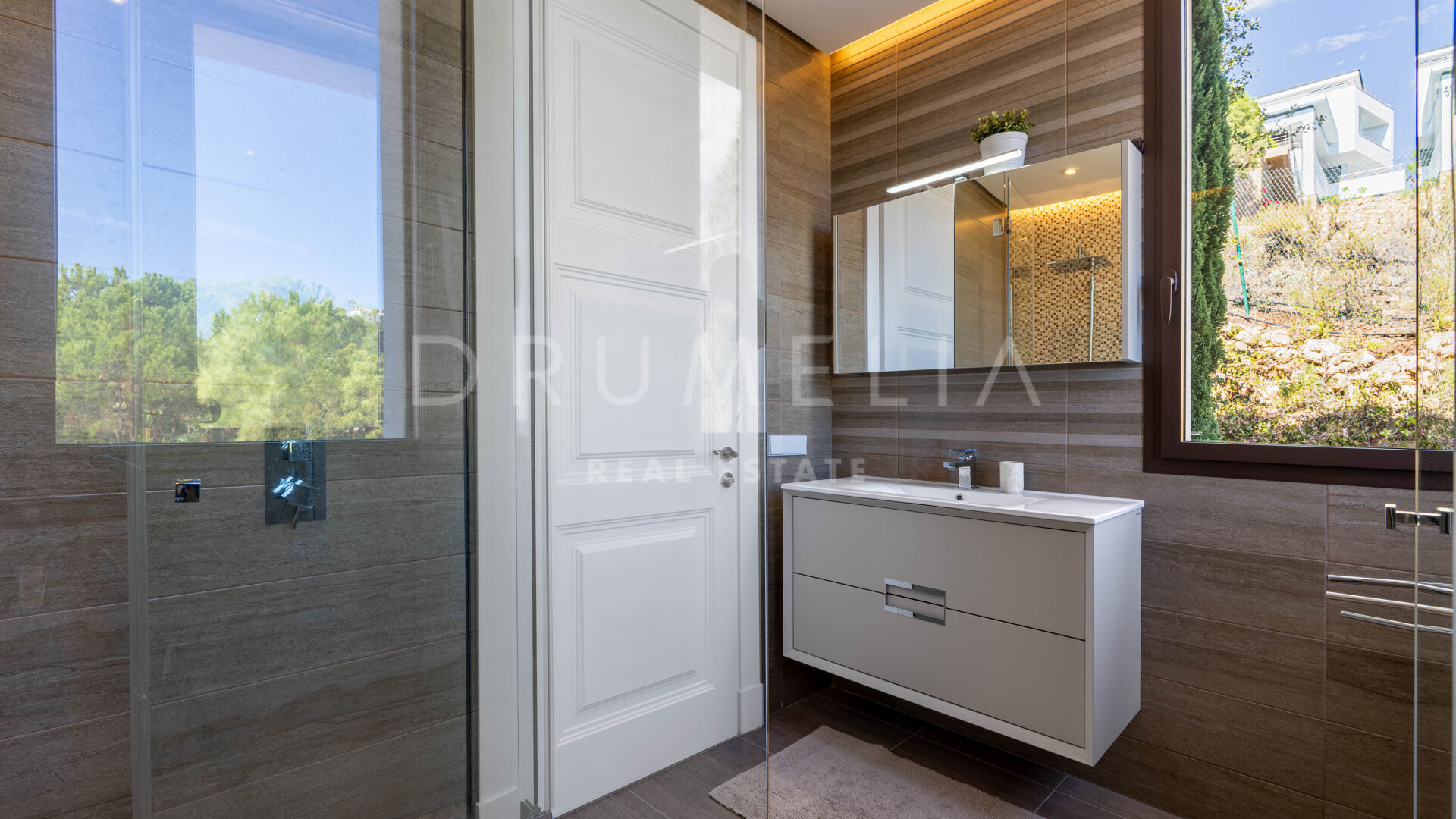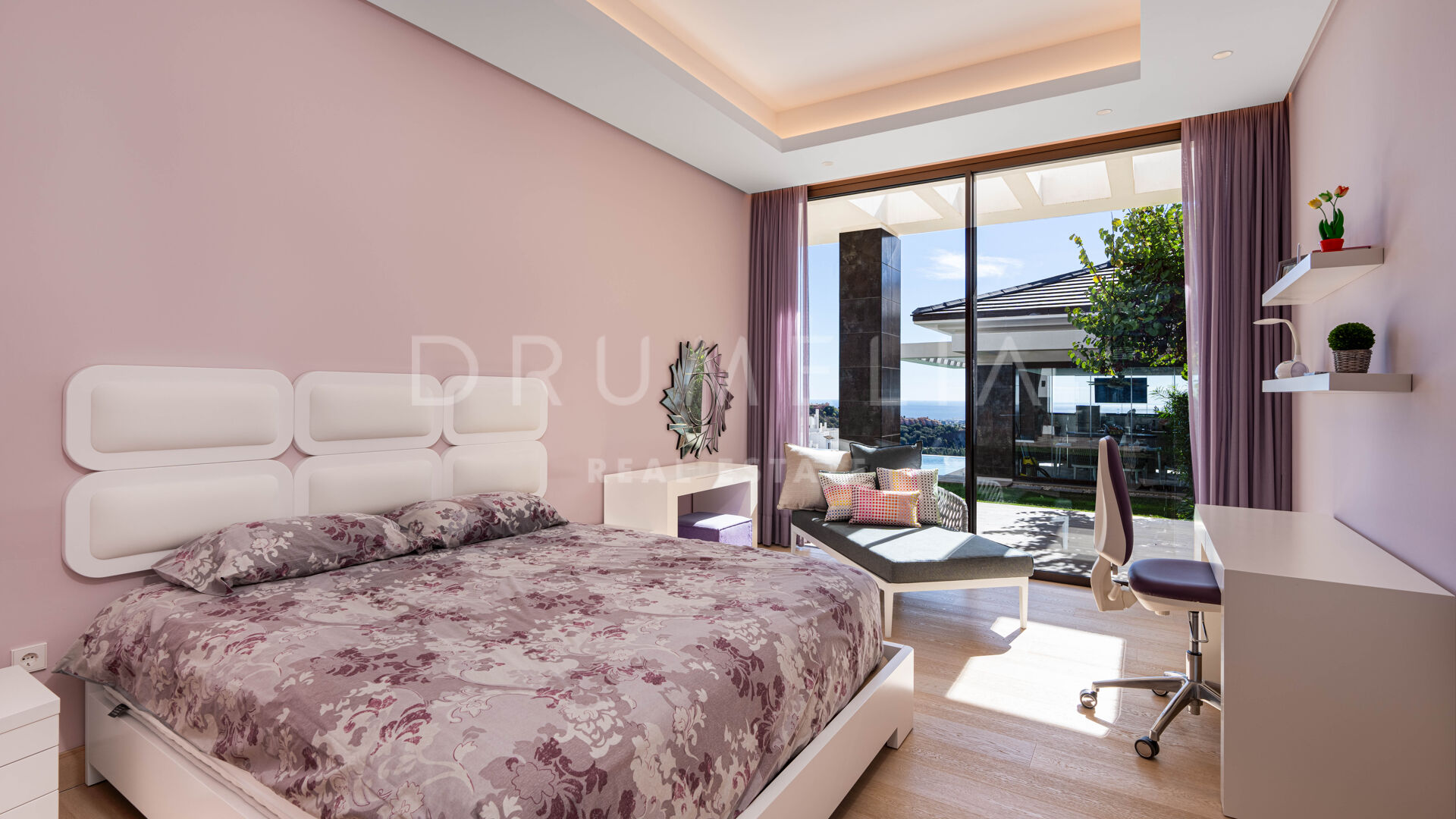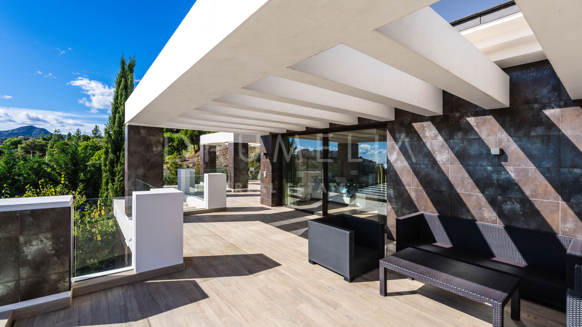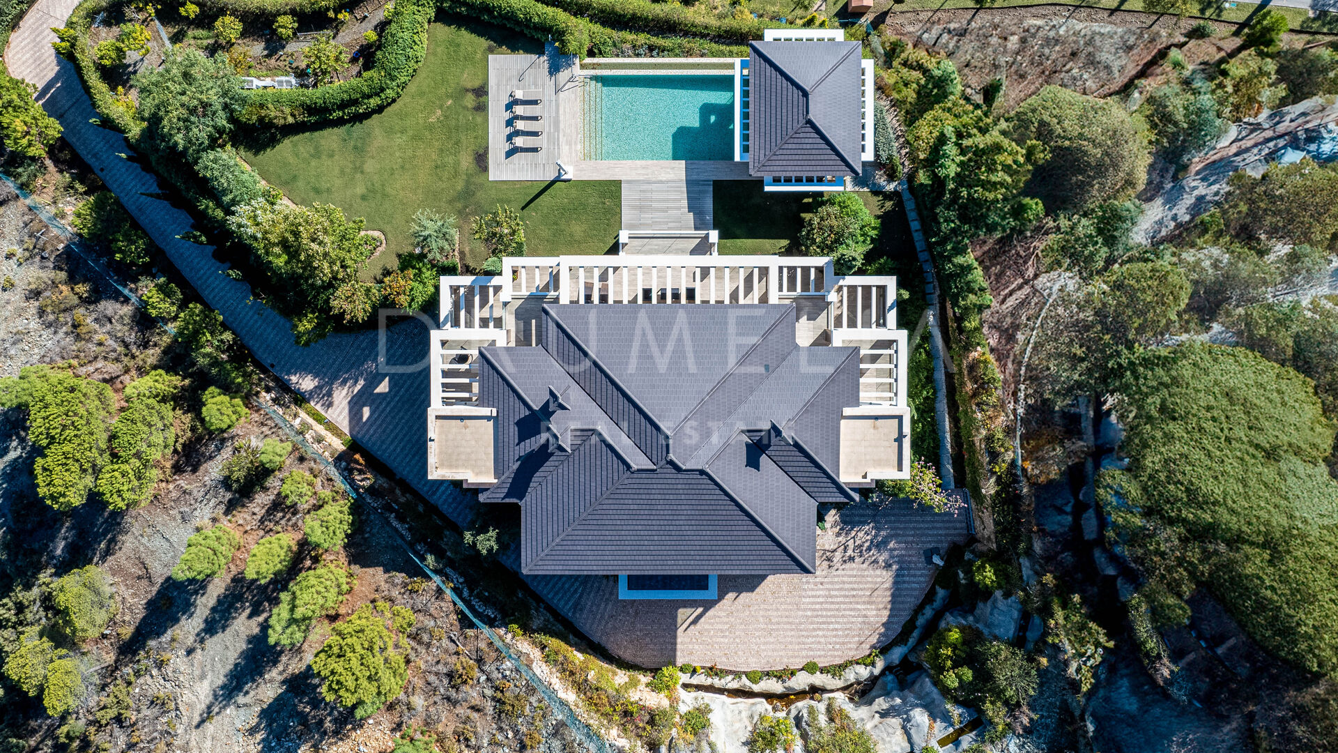 Glassdørene og de store vinduene slipper inn rikelig med naturlig lys i hele huset. Rommene vender ut mot de flotte terrassene, en subtropisk hage med grønne plener, anlagte områder og en solterrasse. Et imponerende svømmebasseng på 12×6 meter med sjøsaltfiltreringssystem innbyr til avkjøling på varme dager eller til storslåtte bassengfester året rundt. Marbella-området er kjent for det beste været på det europeiske kontinentet, og bassenget er oppvarmet. En innglasset paviljong og chill-out-område har et komplett kjøkken, ideelt for grilling og middager i det fri. En privat garasje har plass til fire biler. Denne eksklusive, moderne villaen er selve innbegrepet av luksus og har mange attraktive detaljer, blant annet heis, tregulv, gulvvarme og klimaanlegg i hele huset, garderober, LED-lys osv. Det nøytrale fargevalget skaper en virkelig rolig atmosfære. Ultramoderne møter avslapping i denne luksuriøse eiendommen, som tilbyr den perfekte blandingen av middelhavsnyanse og funksjonalitet!