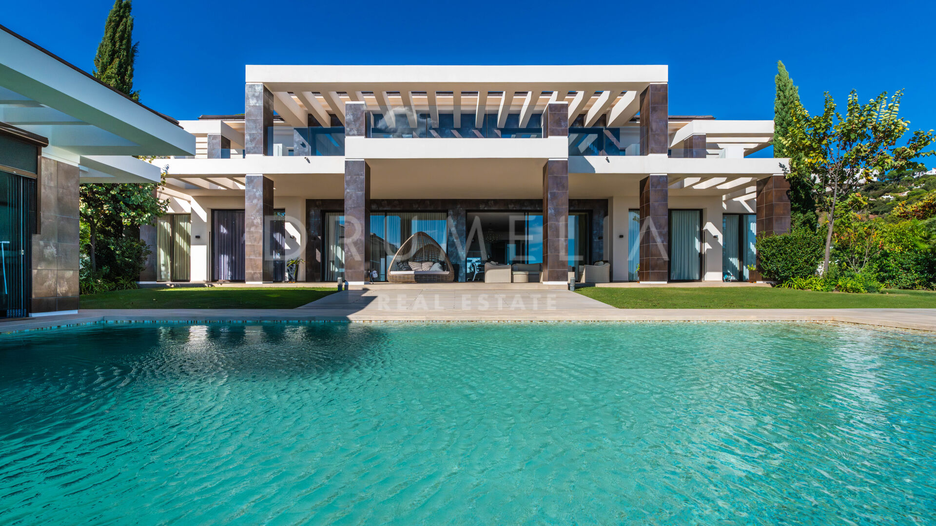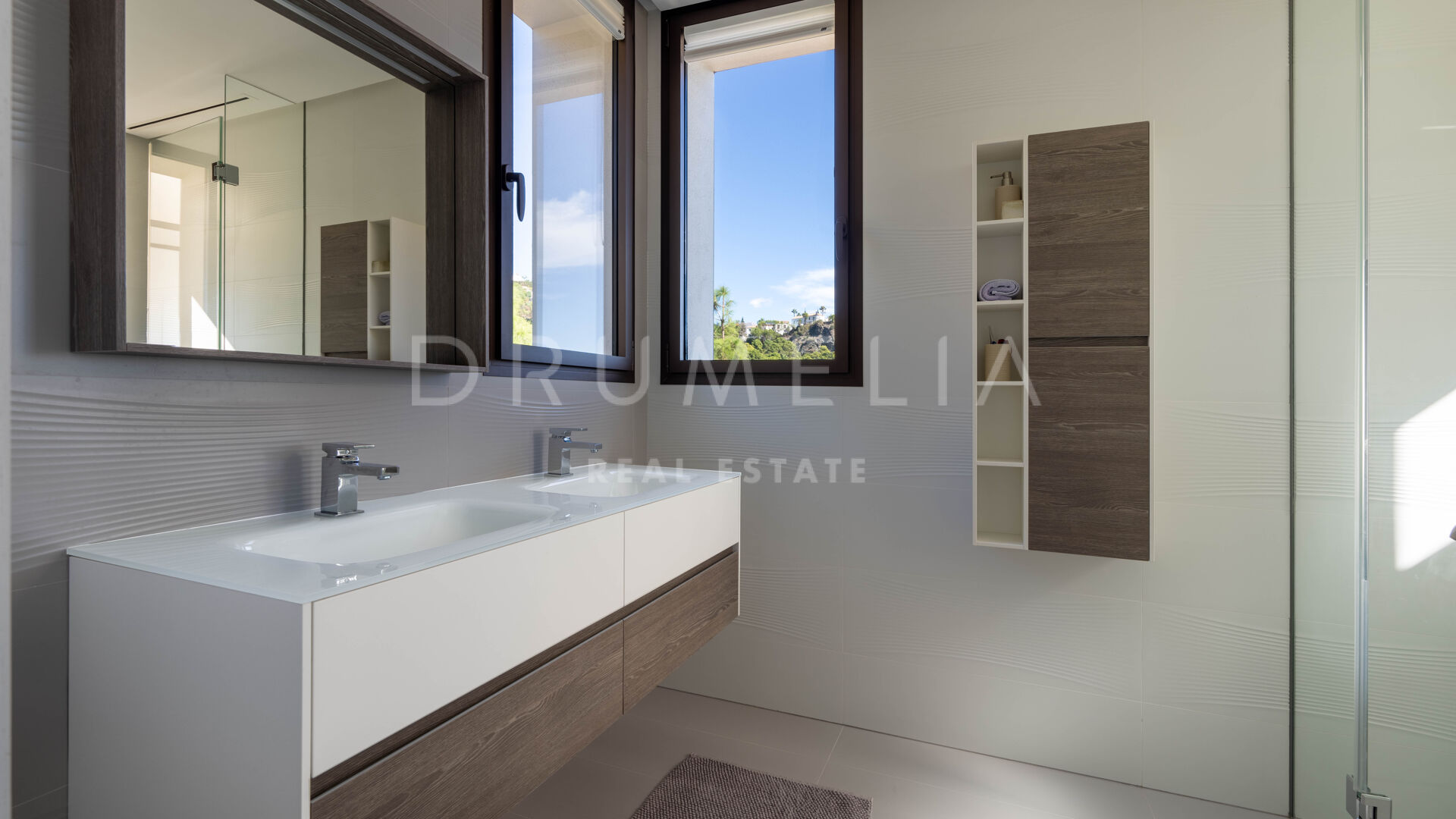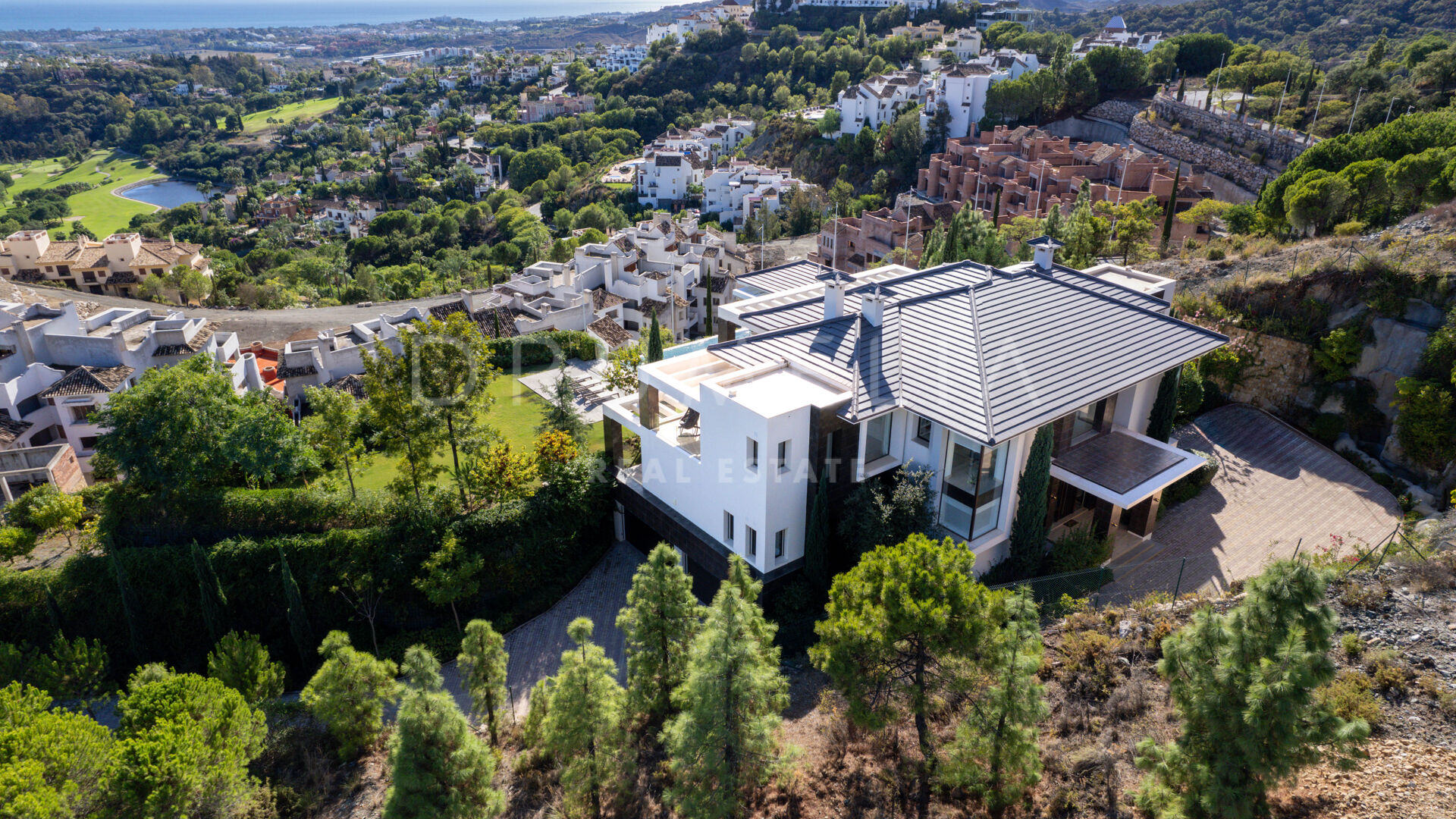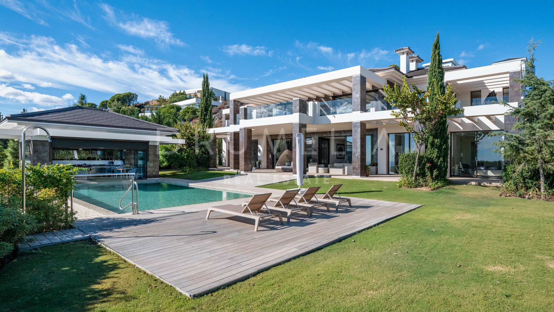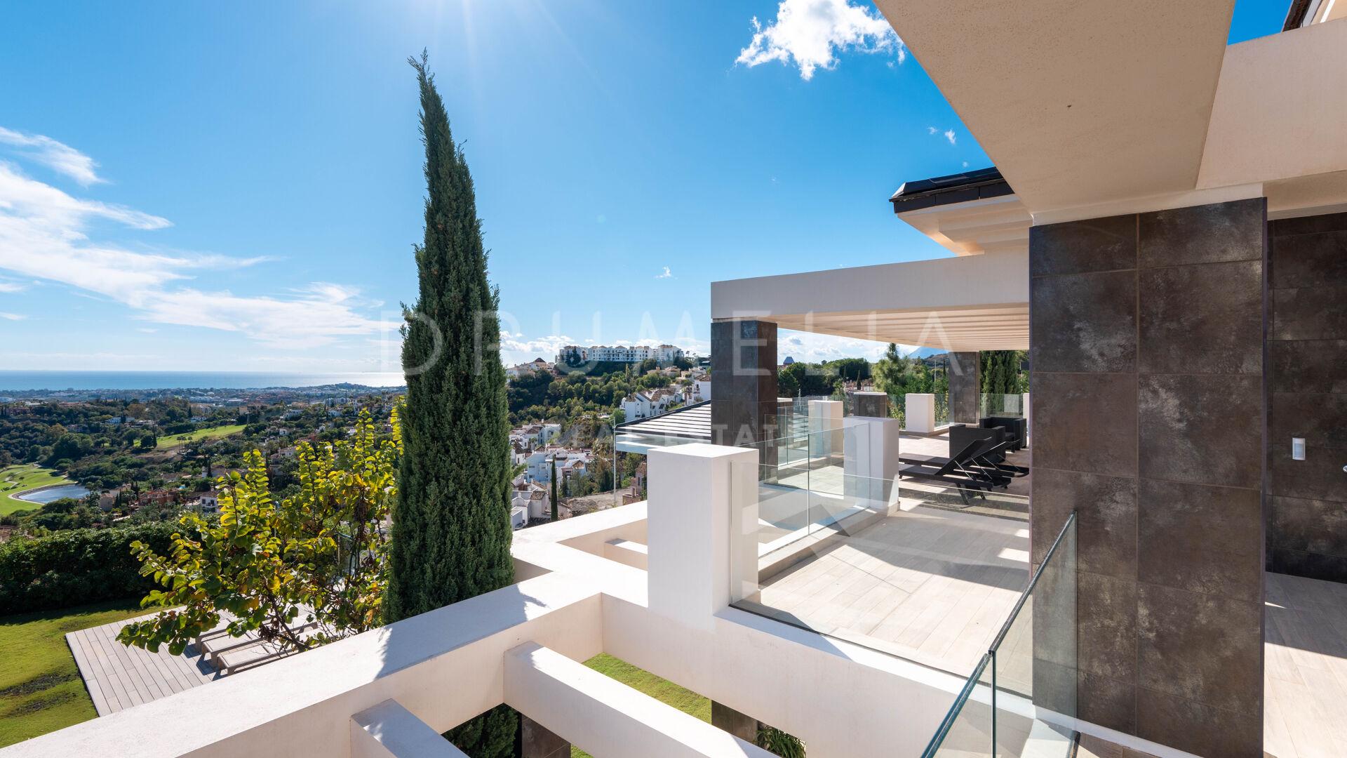 Glassdørene og de store vinduene slipper inn rikelig med naturlig lys i hele huset. Rommene vender ut mot de flotte terrassene, en subtropisk hage med grønne plener, anlagte områder og en solterrasse. Et imponerende svømmebasseng på 12×6 meter med sjøsaltfiltreringssystem innbyr til avkjøling på varme dager eller til storslåtte bassengfester året rundt. Marbella-området er kjent for det beste været på det europeiske kontinentet, og bassenget er oppvarmet. En innglasset paviljong og chill-out-område har et komplett kjøkken, ideelt for grilling og middager i det fri. En privat garasje har plass til fire biler. Denne eksklusive, moderne villaen er selve innbegrepet av luksus og har mange attraktive detaljer, blant annet heis, tregulv, gulvvarme og klimaanlegg i hele huset, garderober, LED-lys osv. Det nøytrale fargevalget skaper en virkelig rolig atmosfære. Ultramoderne møter avslapping i denne luksuriøse eiendommen, som tilbyr den perfekte blandingen av middelhavsnyanse og funksjonalitet!