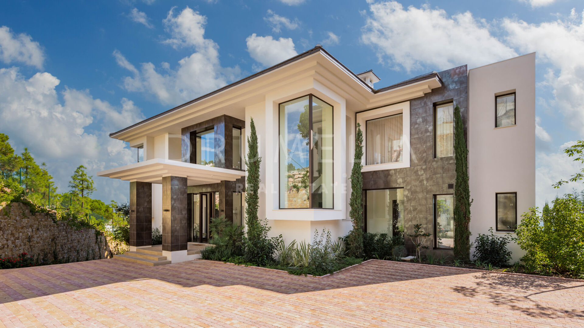 Denne spektakulære villaen på 1.158 m² ligger på en stor tomt på 3.560 m², omgitt av lignende eksklusive eiendommer og grøntområder i Benahavis. Det flotte huset oppfyller moderne krav og tilbyr en blanding av miljøbevissthet, fred, privatliv og luksus. Huset har vakker utsikt over Los Arqueros-golfbanen, grønne åser og fjell dekket av middelhavsfurutrær, og herlig panoramautsikt over kysten og havet helt til Afrika. Det stilfullt utformede arkitektoniske mesterverket med utsøkte elementer består av en første etasje, en andre etasje og en kjeller. Det imponerer med lyse og romslige oppholds- og spisestuer, et fullt utstyrt, elegant og moderne kjøkken, 298 m² store terrasser, 9 soverom med eget bad, vinkjeller og spillrom. I tillegg til oppholds-, representasjons- og resepsjonsområder har dette huset også vaskerom, vaskerom og bod, en walk-in-garderobe, to gjestetoaletter og et komplett bad for vedlikeholdspersonalet.