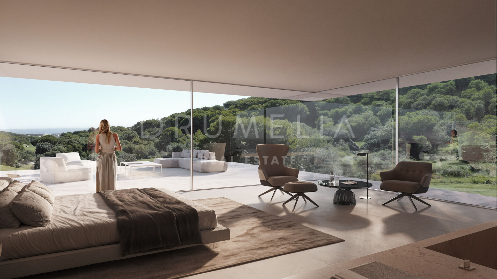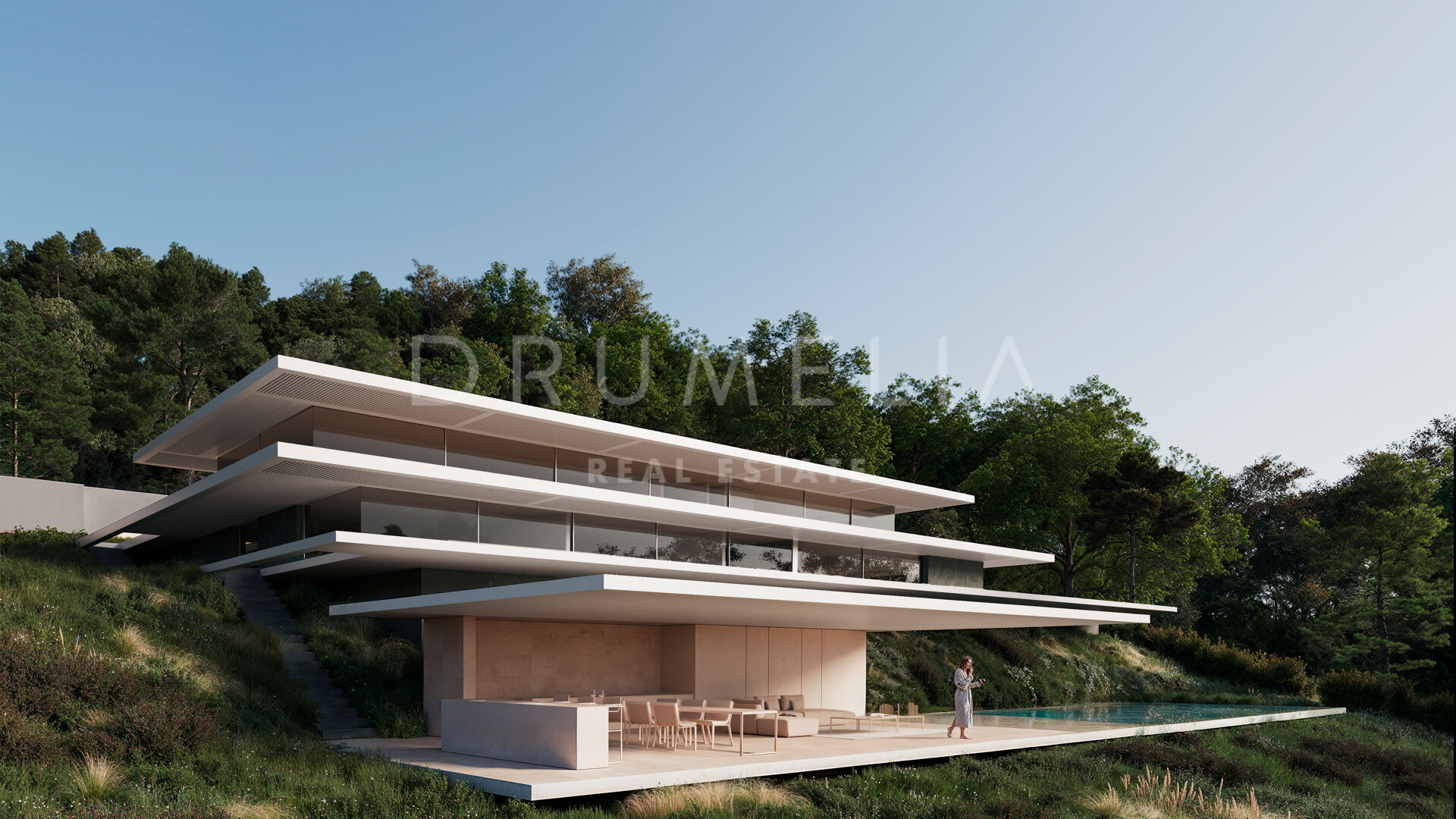 Denne eiendommen har en slående modernistisk design med rene linjer og store terrasser som smelter sømløst sammen med det naturlige landskapet. Den nivådelte strukturen maksimerer utsikten og det naturlige lyset, og skaper en harmonisk forbindelse mellom inne- og uterom. Store vindusflater og strategisk utformede uteområder sørger for at du alltid har utsyn til de fantastiske omgivelsene, slik at du kan nyte den uforstyrrede utsikten over golfbanen og Middelhavet.