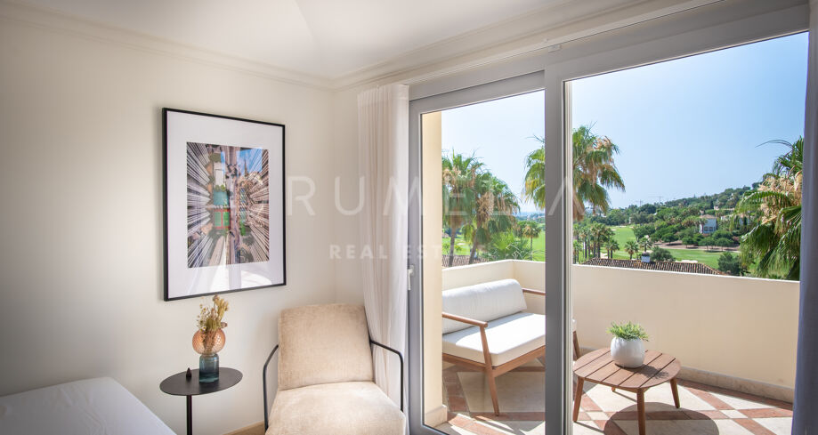 Denne eksepsjonelle toppleiligheten over to plan med 3 soverom og 2,5 bad ligger i det prestisjefylte inngjerdede området Las Alamandas, midt i hjertet av Golfdalen i Nueva Andalucía. Med spektakulær utsikt over de grønne golfbanene tilbyr denne smakfullt møblerte eiendommen en perfekt kombinasjon av eleganse, komfort og stil.