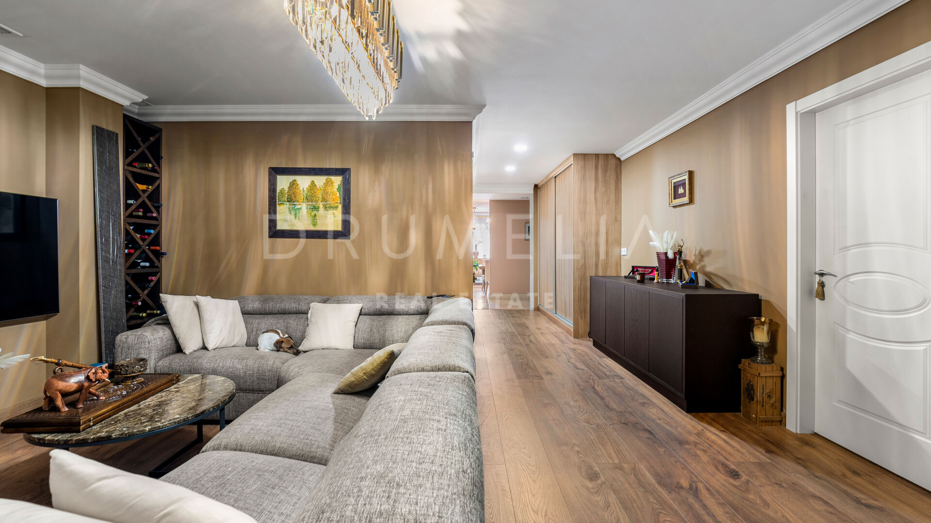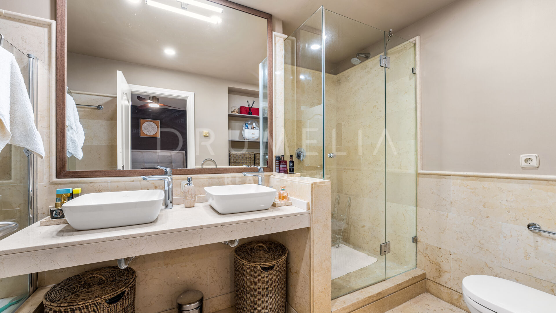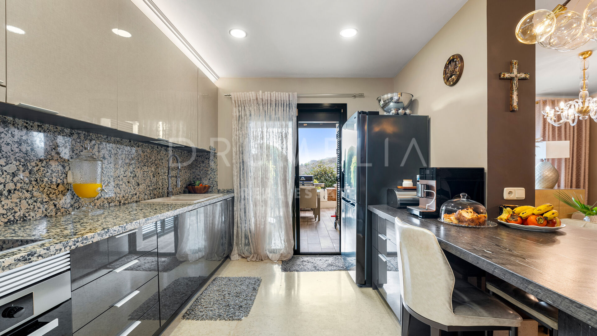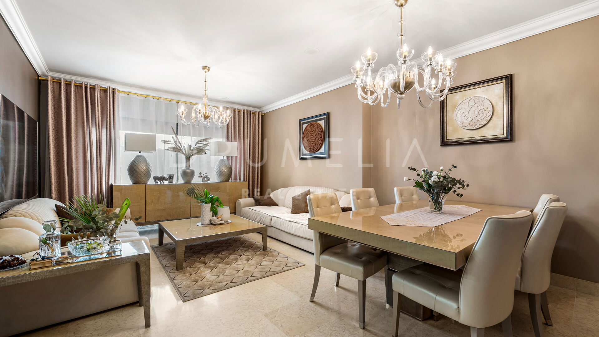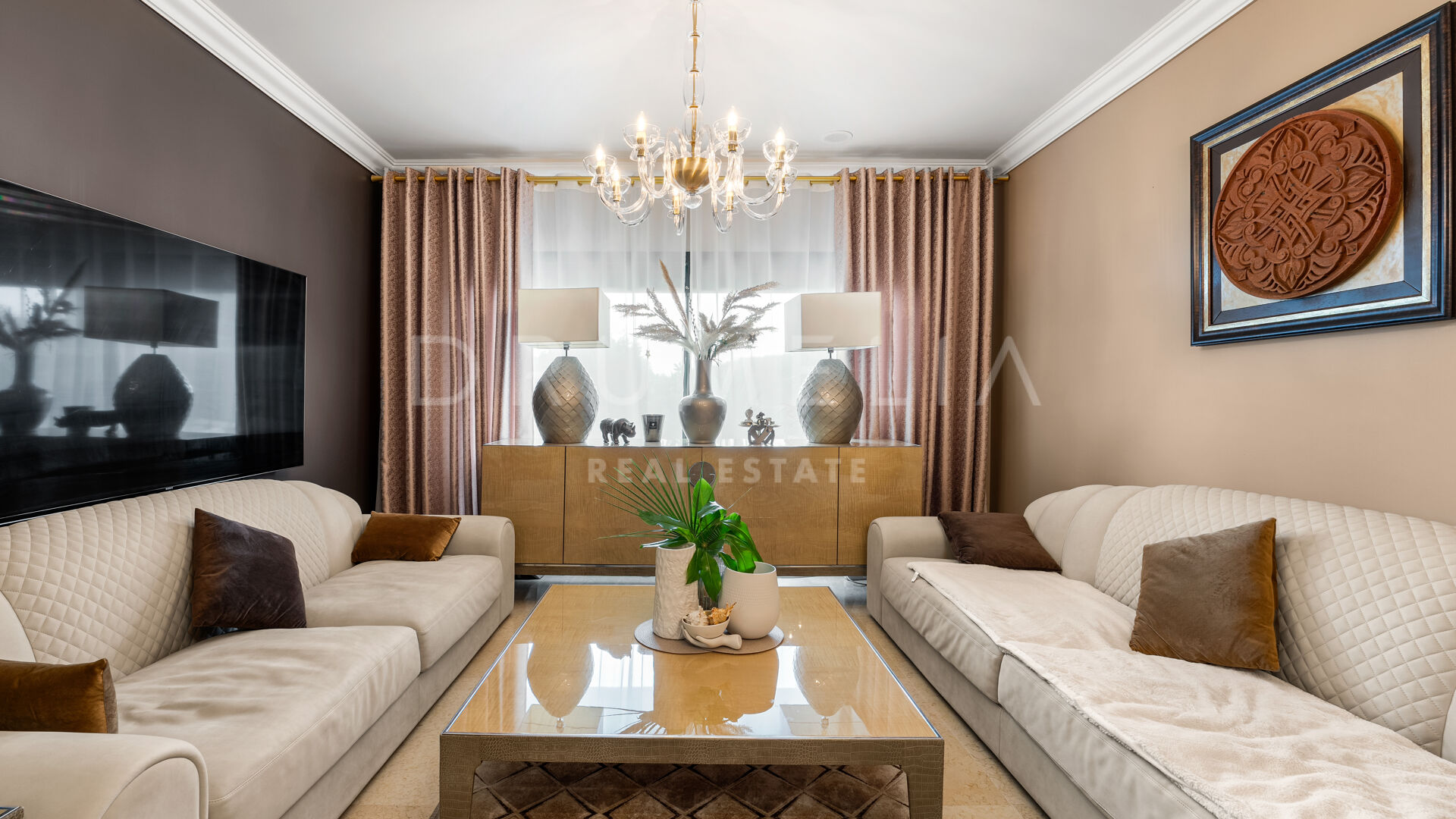 Denne utsøkte leiligheten med 5 soverom og 5 bad, som ligger i det prestisjetunge området Los Capanes del Golf i Benahavís, er en sann perle av moderne luksus. Med 284 m² smakfullt designet boareal og sørøstlig orientering, er boligen fylt med naturlig lys og tilbyr fantastisk utsikt over fjellene og landskapet rundt. Nylig renovert til høyeste standard, kombinerer dette hjemmet tidløs eleganse med moderne oppgraderinger, og skaper en oase av komfort og stil.