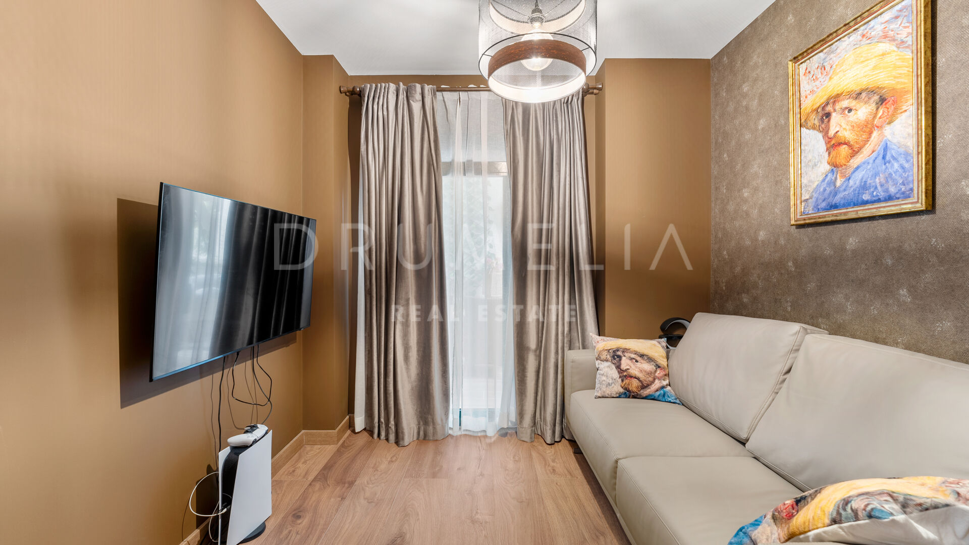 Hvert eneste detalj i denne leiligheten utstråler raffinement. Det fullt utstyrte kjøkkenet og de elegante interiørene kompletteres med luksuriøse innslag som gulvvarme på badene og klimaanlegg gjennom hele boligen. Nyt fredelige øyeblikk på din private terrasse eller balkong, eller arranger minneverdige sammenkomster på den overbygde terrassen med grillområde, omgitt av frodige hager.