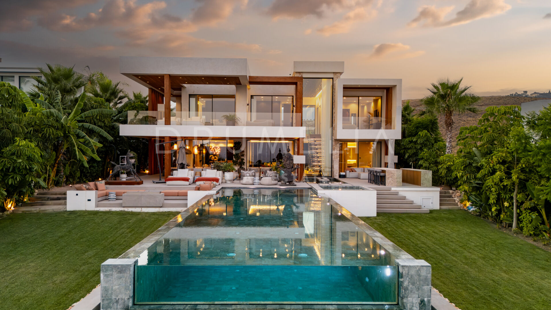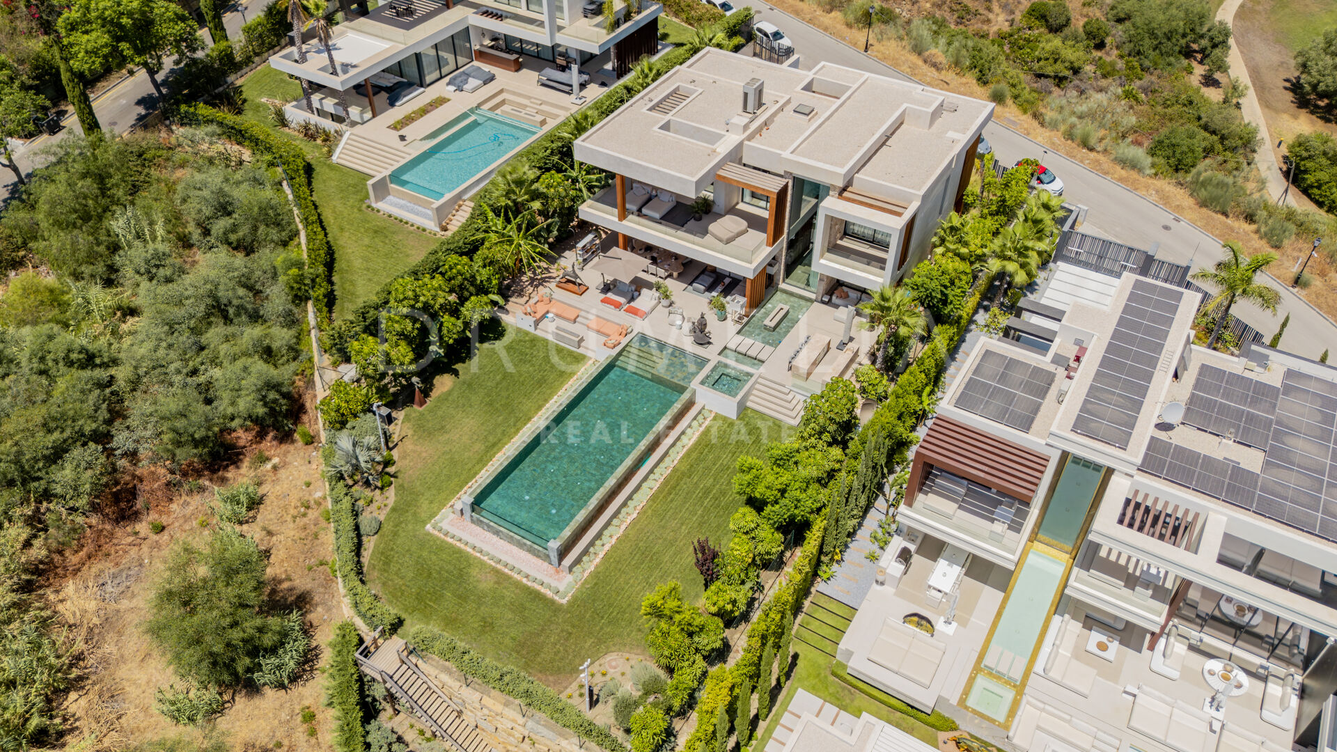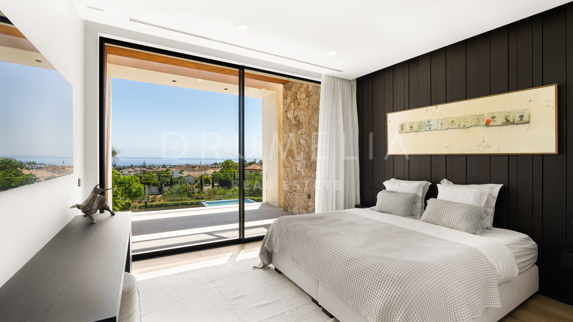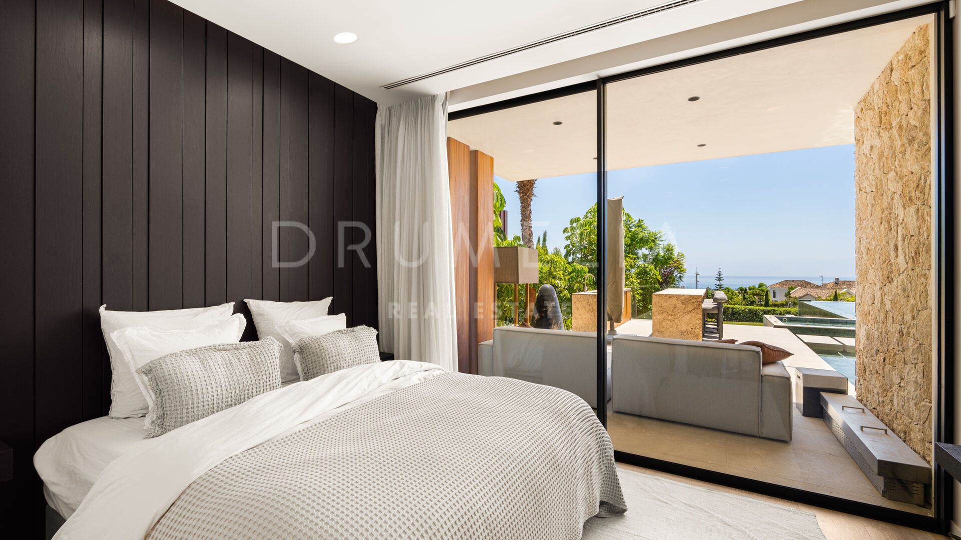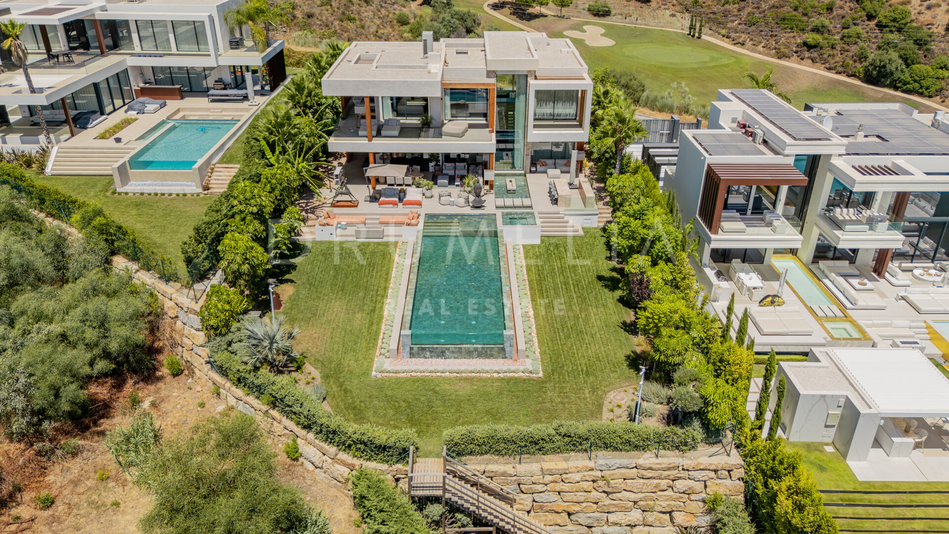 Med en privilegert, forhøyet beliggenhet vendt mot sør, har villaen vidstrakt panoramautsikt over Middelhavet, den frodige Los Flamingos golfbanen og det imponerende evighetsbassenget. Med 496 m² fordelt på tre nivåer, viser hjemmet frem banebrytende, moderne arkitektur med en åpen planløsning designet for å maksimere naturlig lys og flyt mellom inne- og uteområder gjennom store vinduer fra gulv til tak.