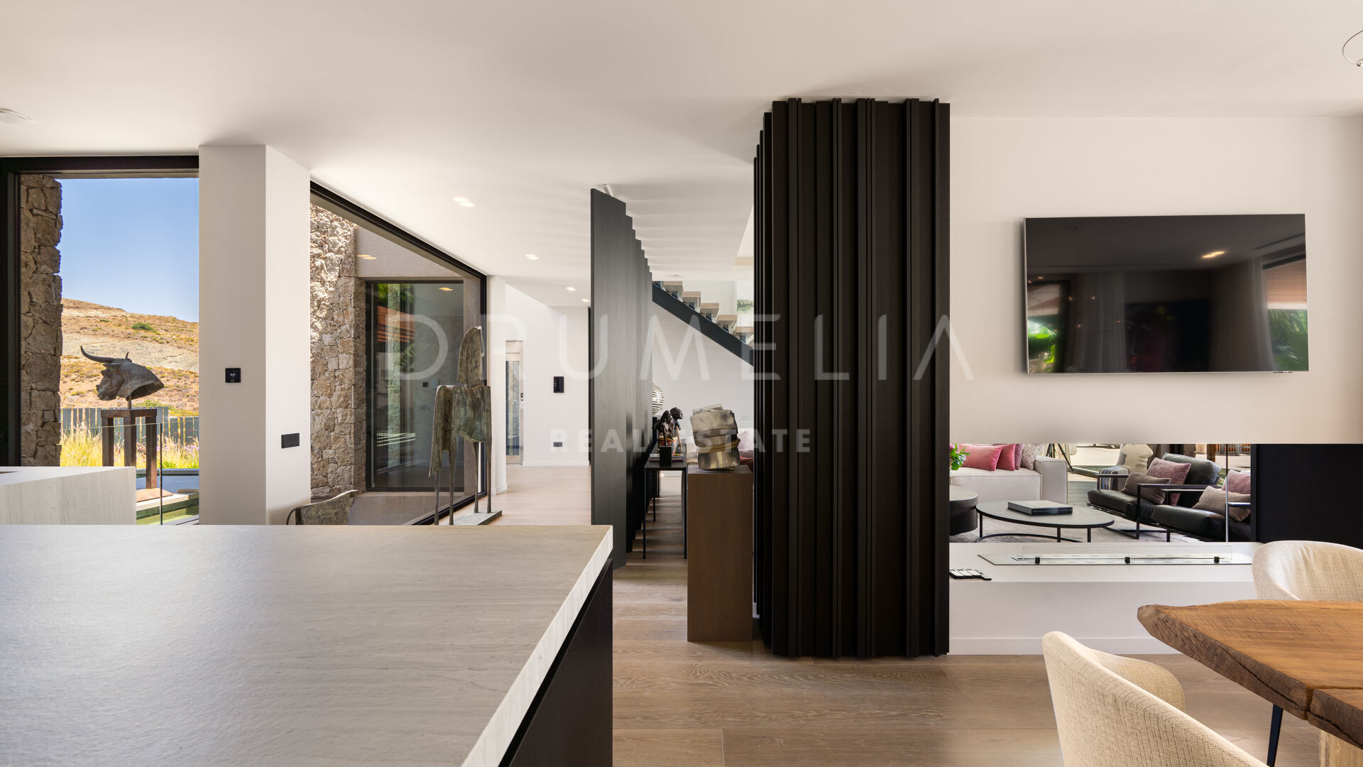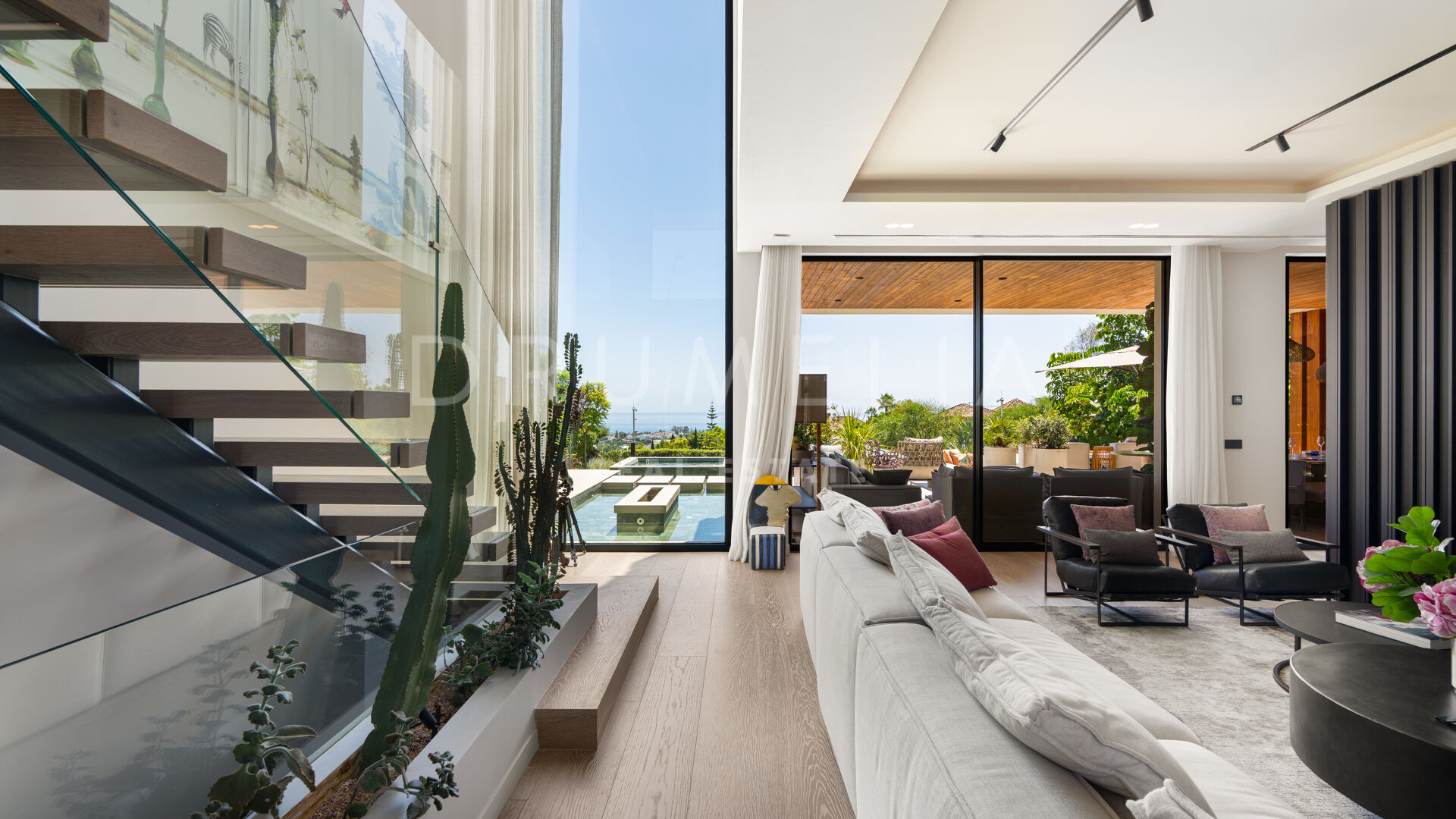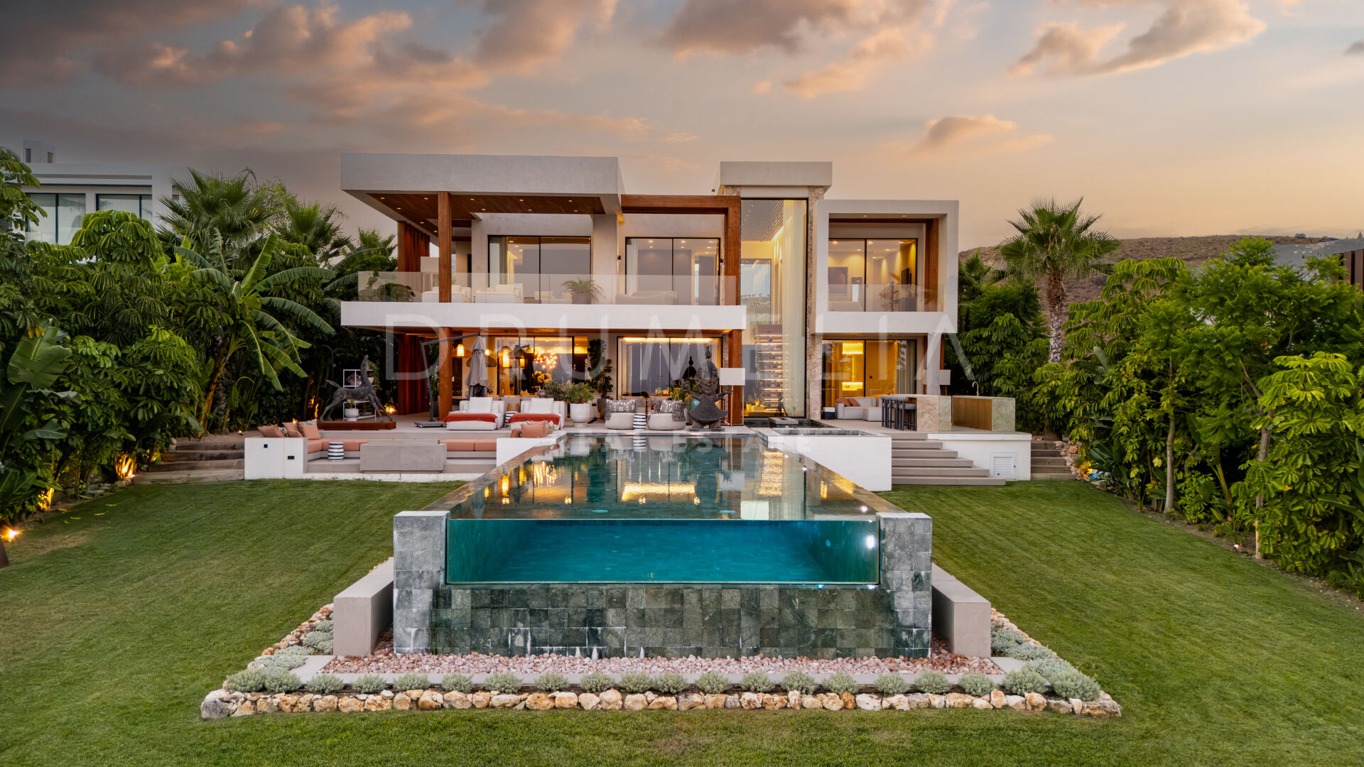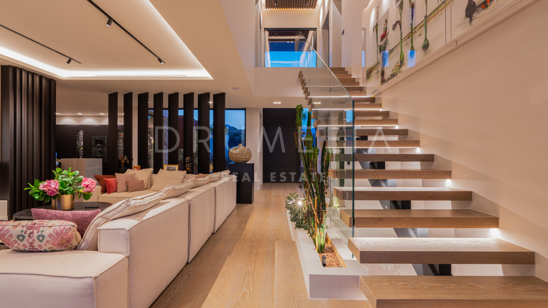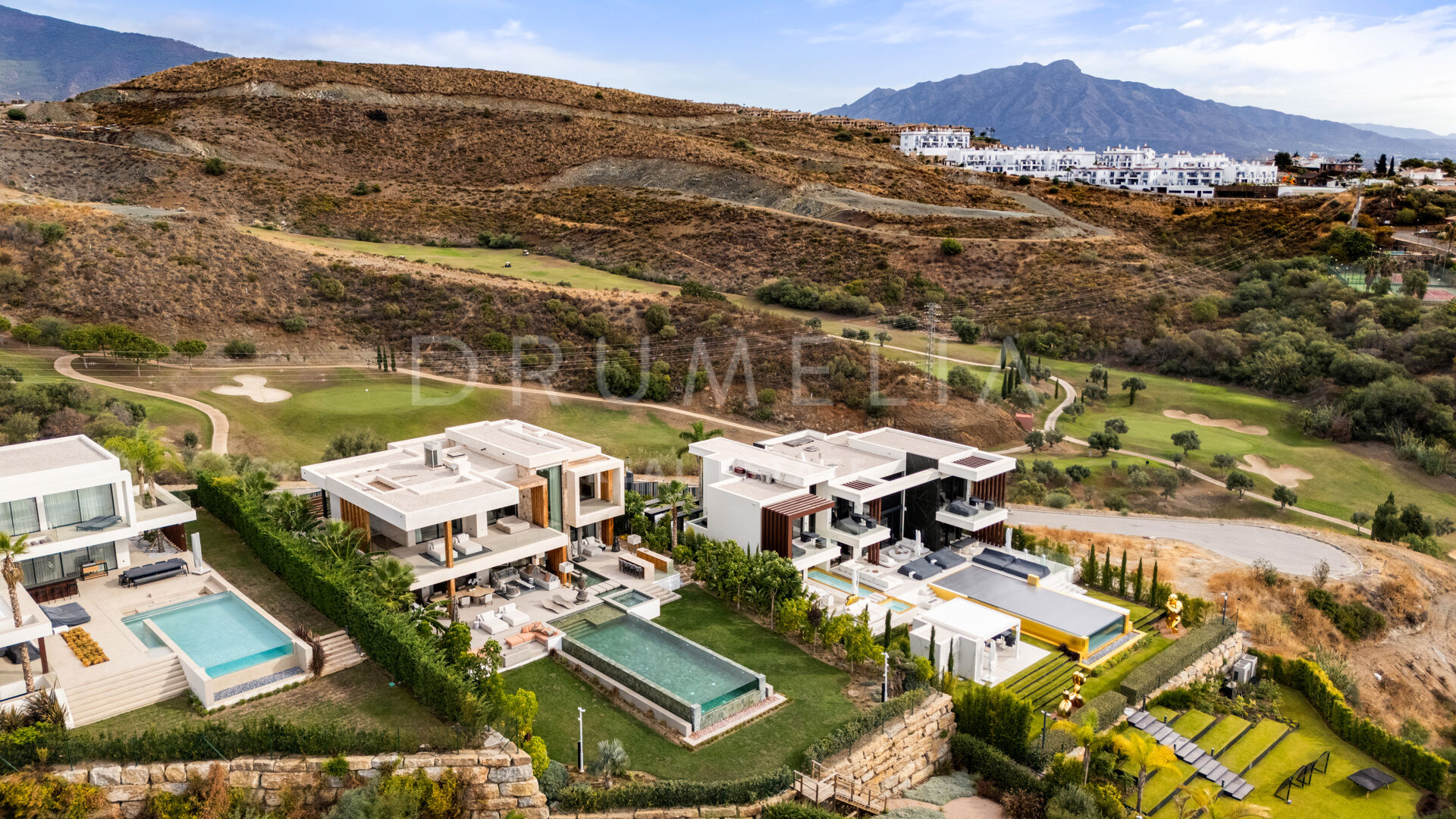 Med en privilegert, forhøyet beliggenhet vendt mot sør, har villaen vidstrakt panoramautsikt over Middelhavet, den frodige Los Flamingos golfbanen og det imponerende evighetsbassenget. Med 496 m² fordelt på tre nivåer, viser hjemmet frem banebrytende, moderne arkitektur med en åpen planløsning designet for å maksimere naturlig lys og flyt mellom inne- og uteområder gjennom store vinduer fra gulv til tak.