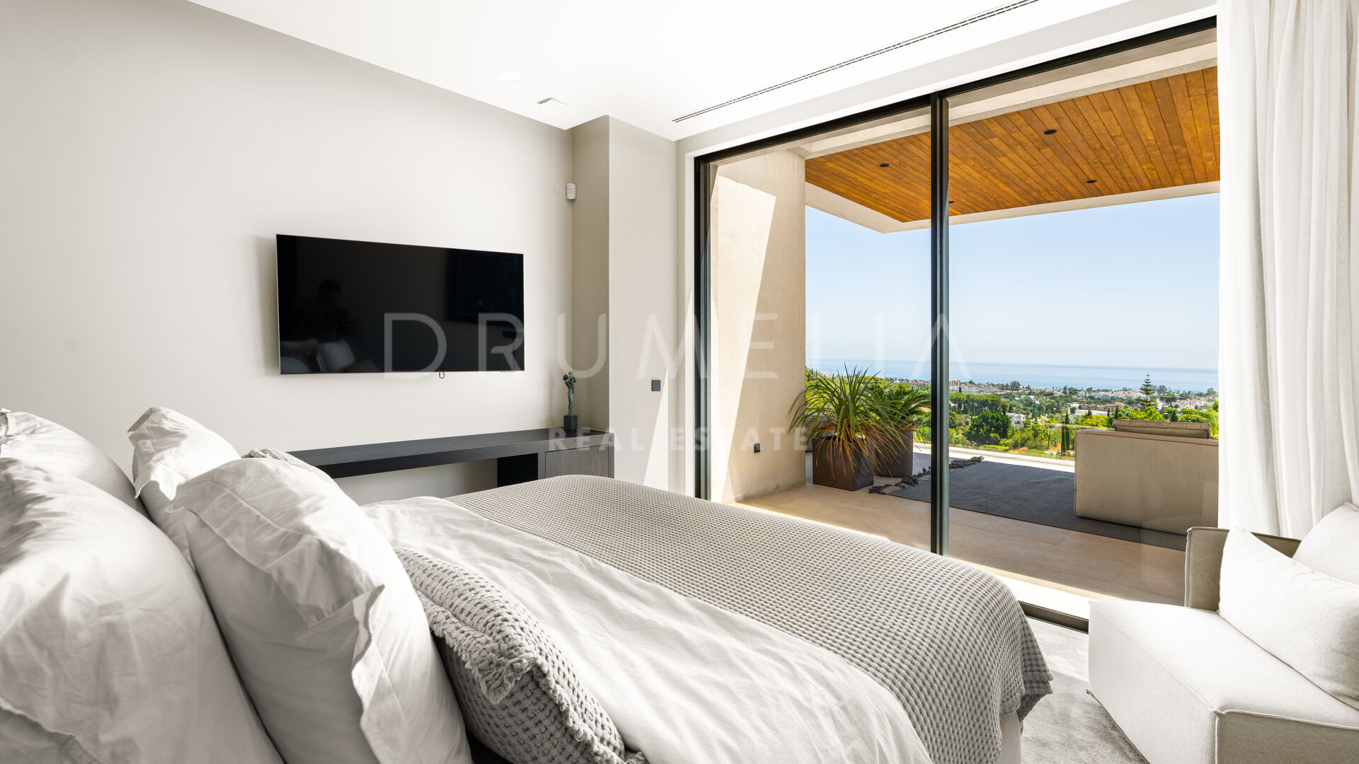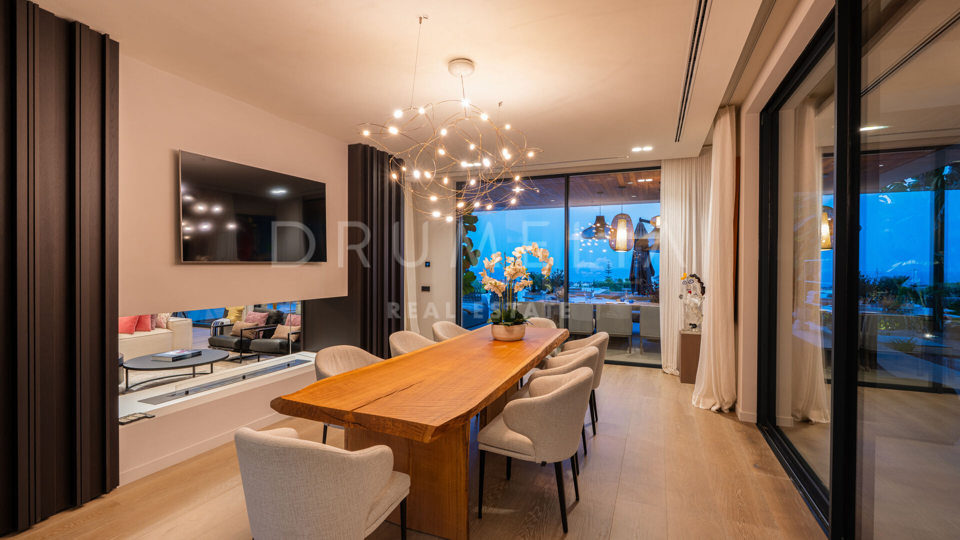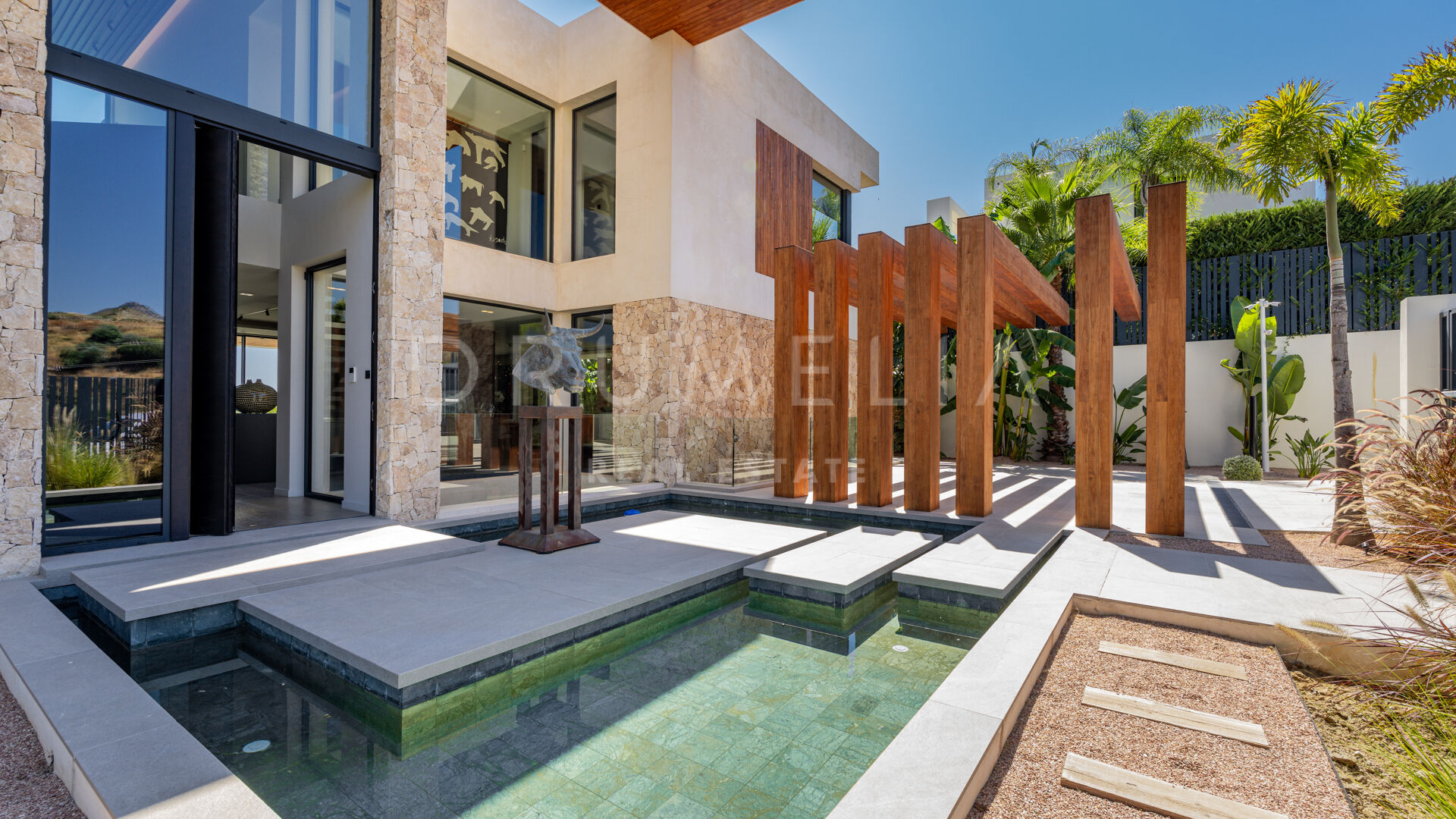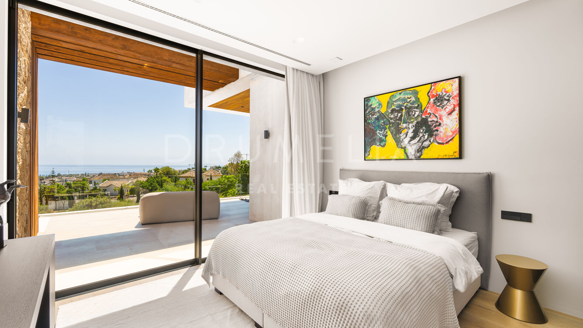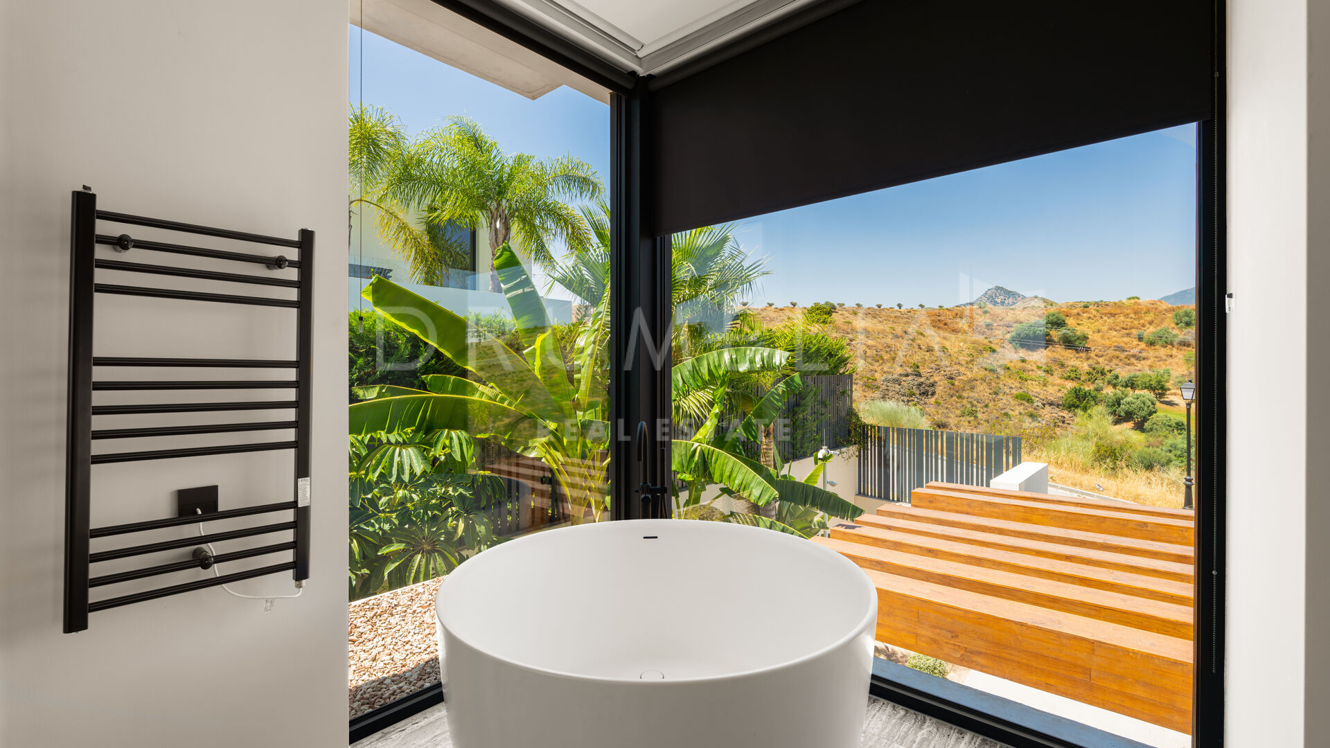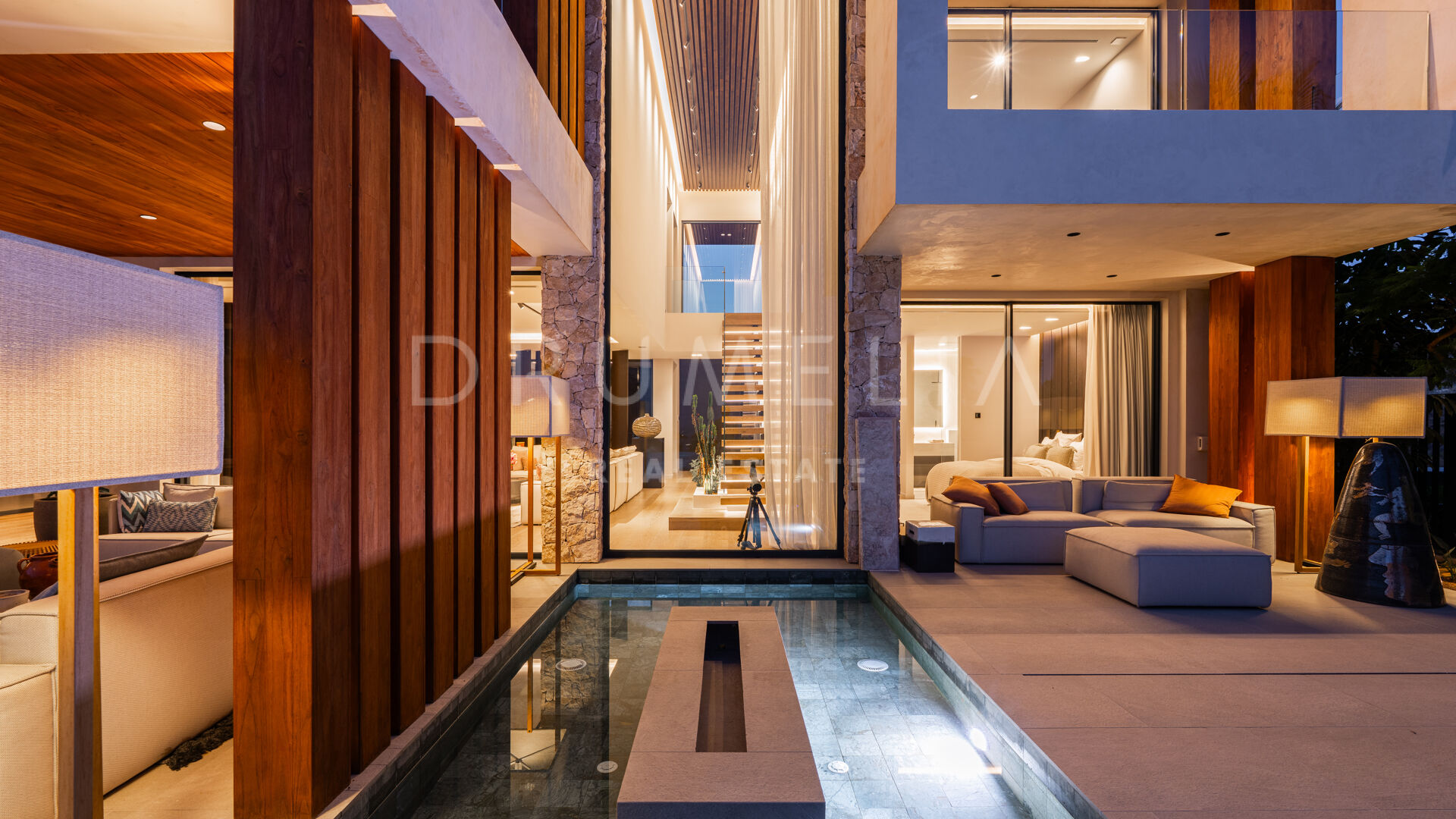 Med en privilegert, forhøyet beliggenhet vendt mot sør, har villaen vidstrakt panoramautsikt over Middelhavet, den frodige Los Flamingos golfbanen og det imponerende evighetsbassenget. Med 496 m² fordelt på tre nivåer, viser hjemmet frem banebrytende, moderne arkitektur med en åpen planløsning designet for å maksimere naturlig lys og flyt mellom inne- og uteområder gjennom store vinduer fra gulv til tak.