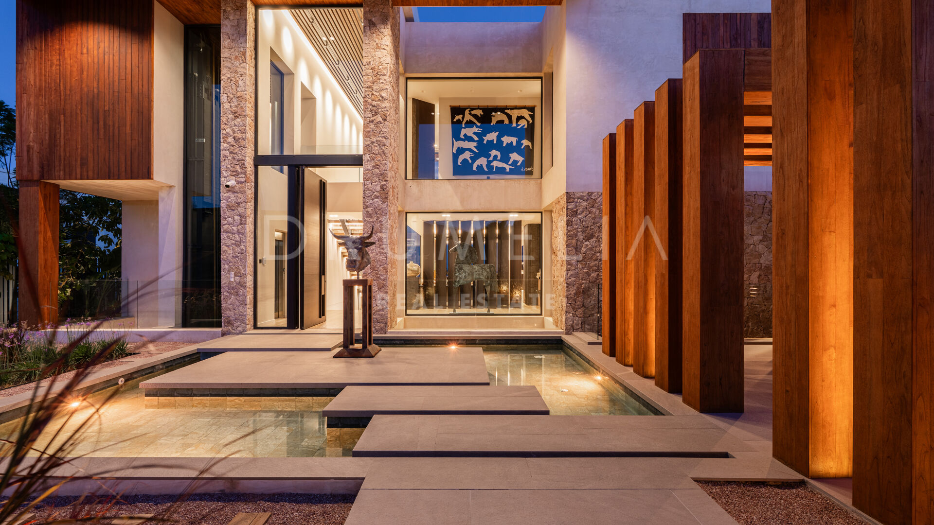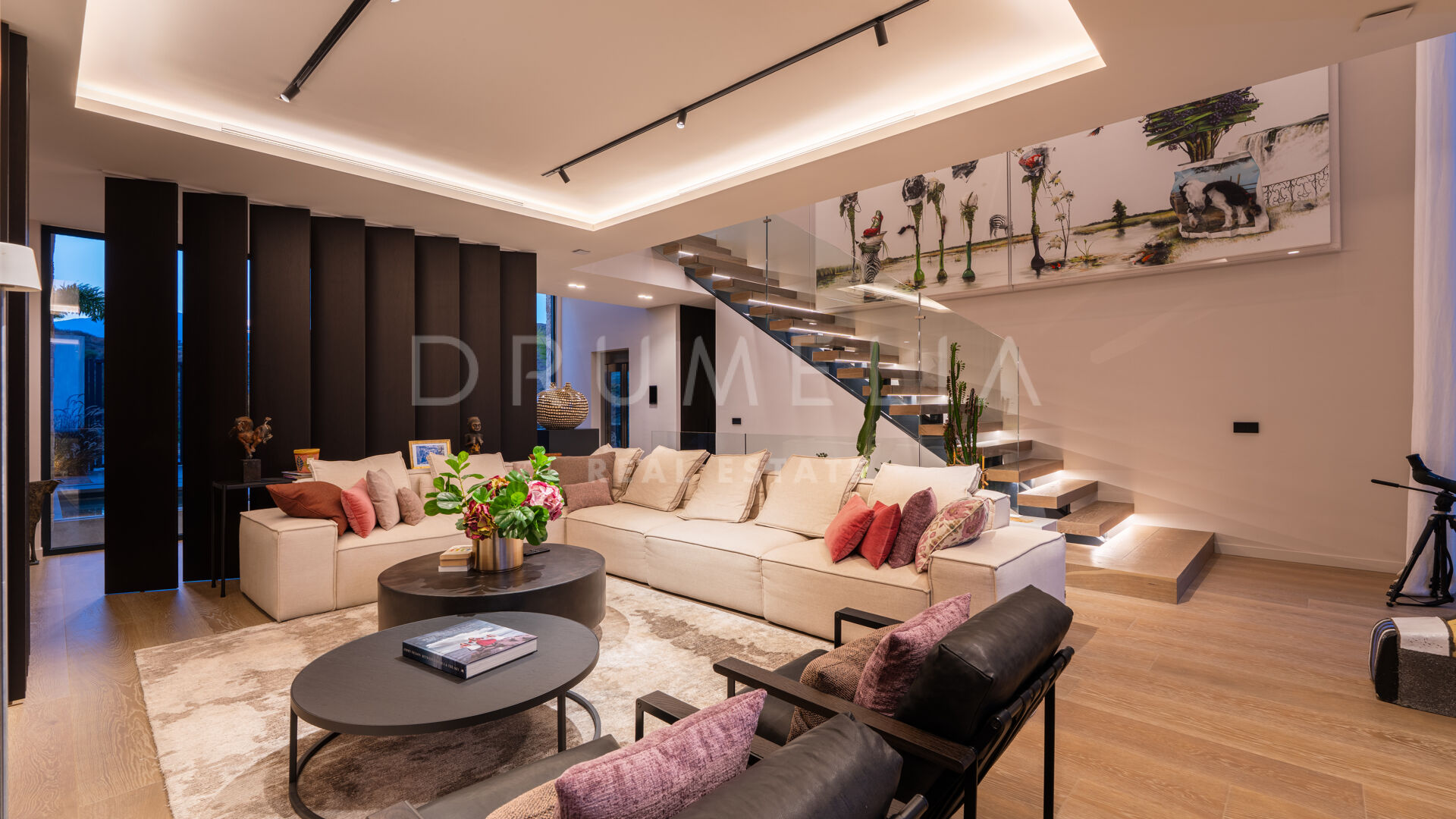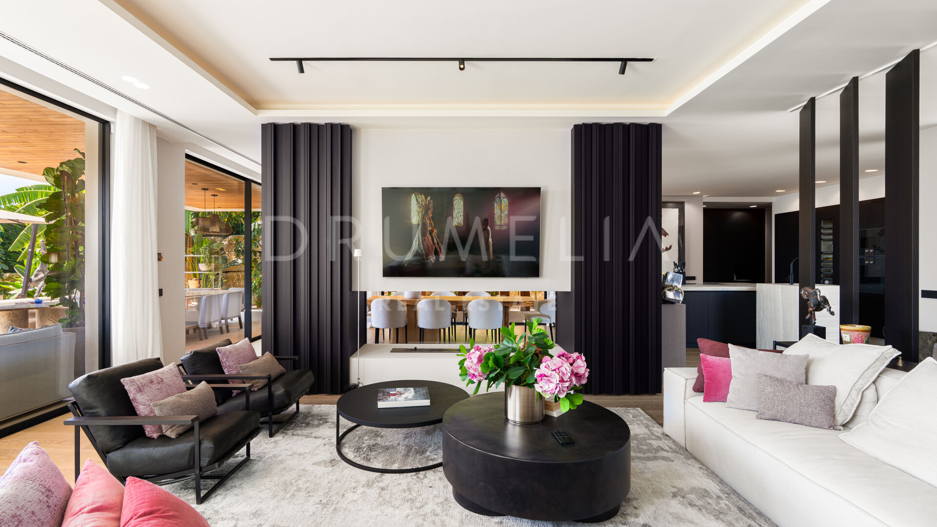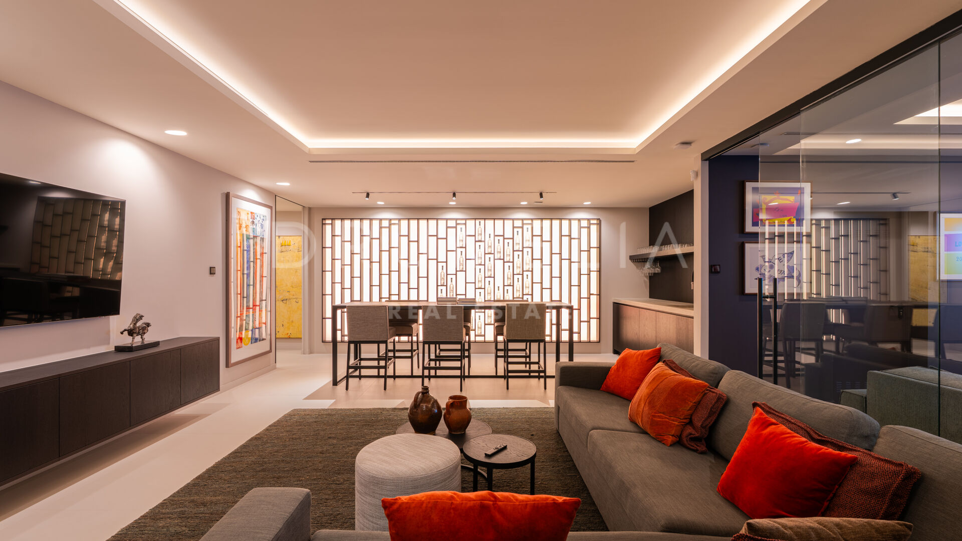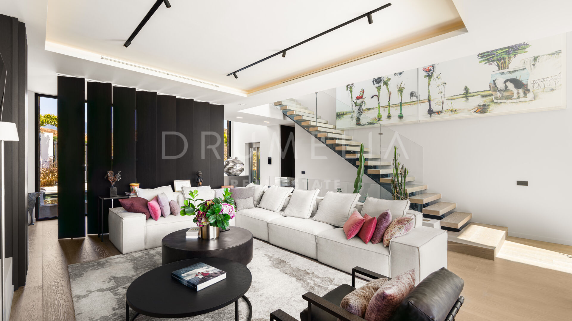 Med en privilegert, forhøyet beliggenhet vendt mot sør, har villaen vidstrakt panoramautsikt over Middelhavet, den frodige Los Flamingos golfbanen og det imponerende evighetsbassenget. Med 496 m² fordelt på tre nivåer, viser hjemmet frem banebrytende, moderne arkitektur med en åpen planløsning designet for å maksimere naturlig lys og flyt mellom inne- og uteområder gjennom store vinduer fra gulv til tak.