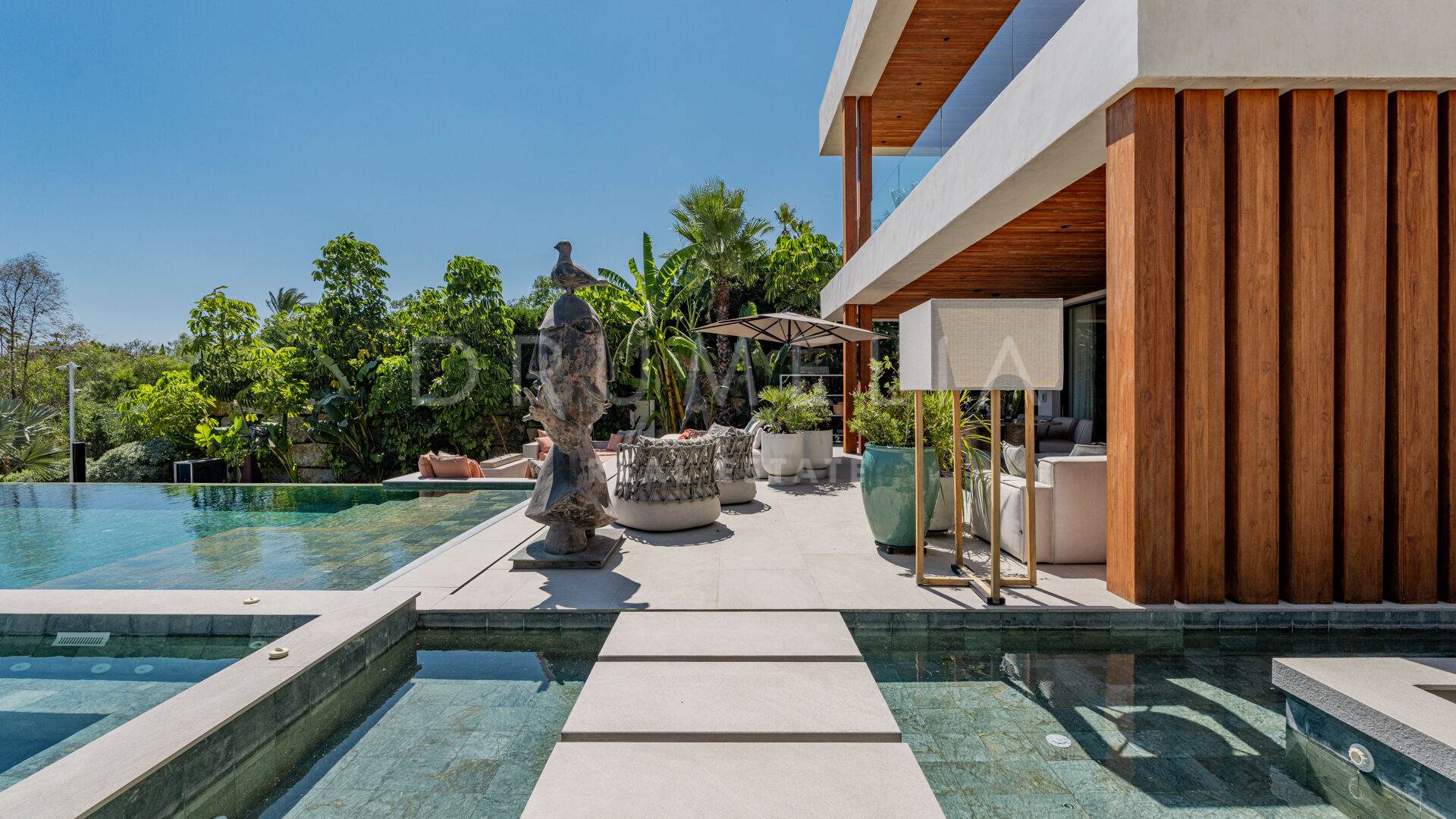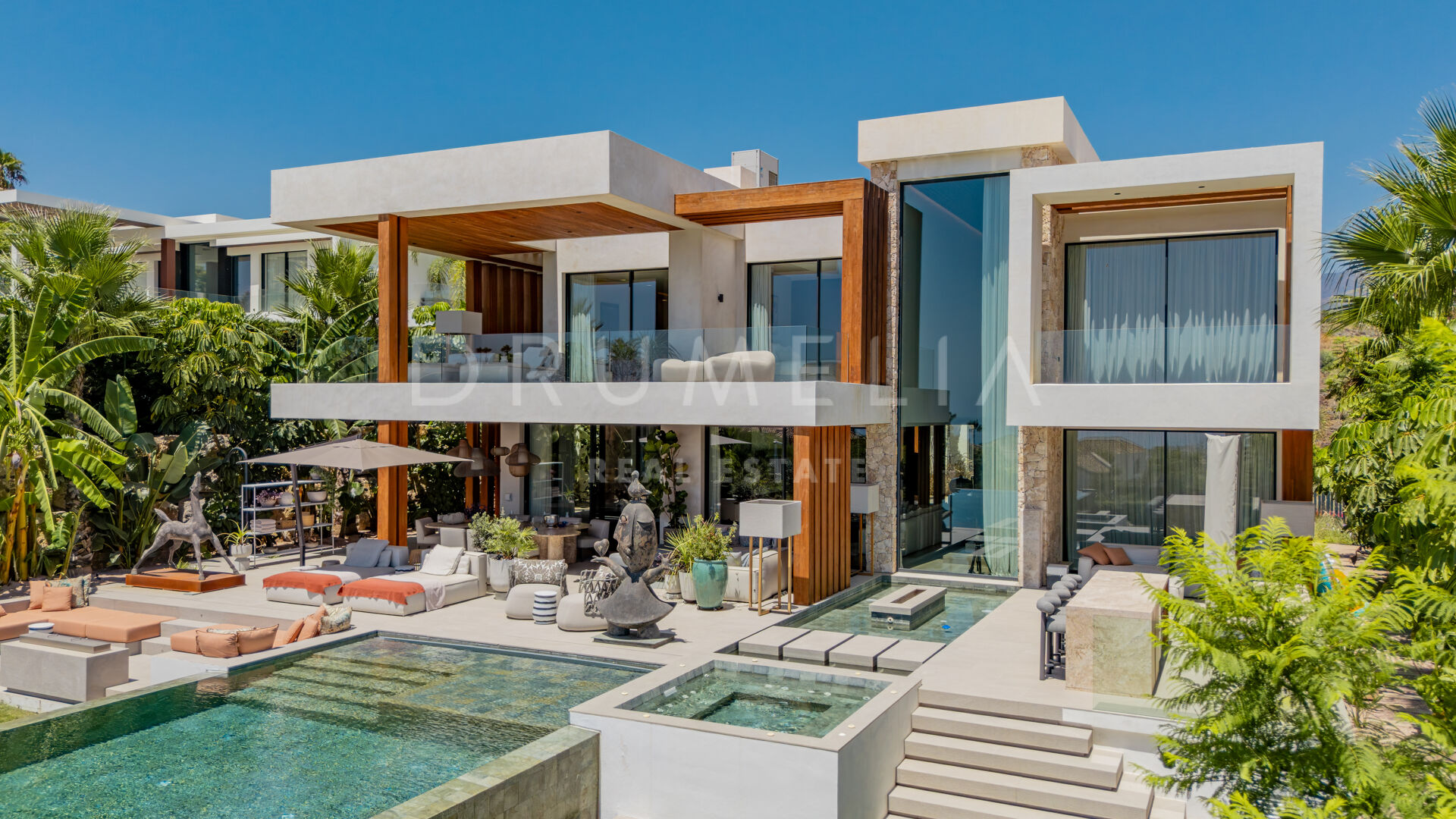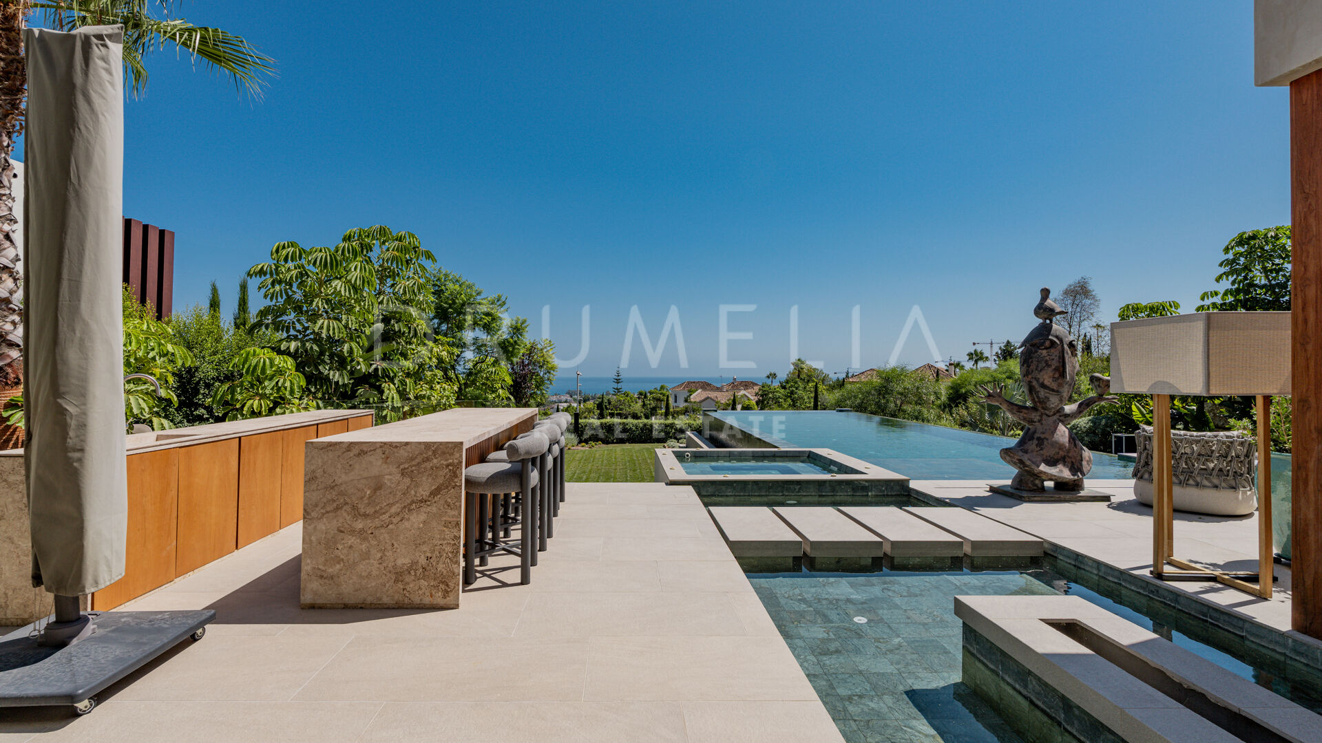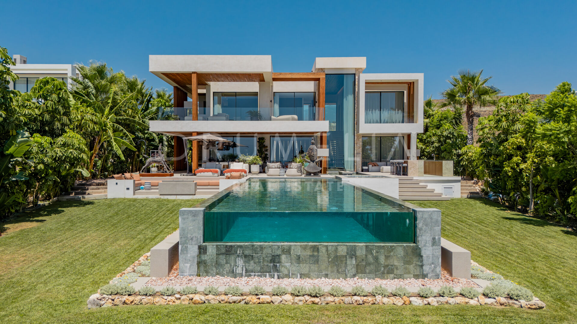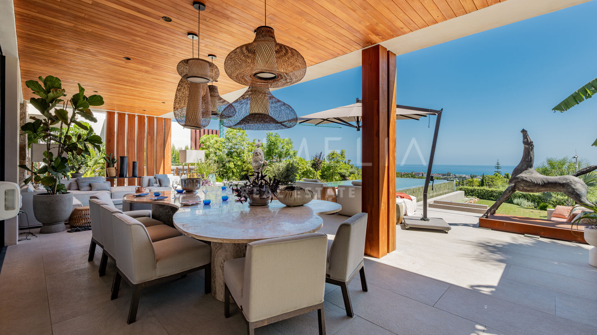 Terrassene, totalt 183 m², tilbyr en perfekt blanding av overbygde og åpne områder, alle designet for å utnytte den utrolige utsikten. Evighetsbassenget fungerer som et slående midtpunkt og skaper en ideell setting for både avslapning og sosiale sammenkomster.
