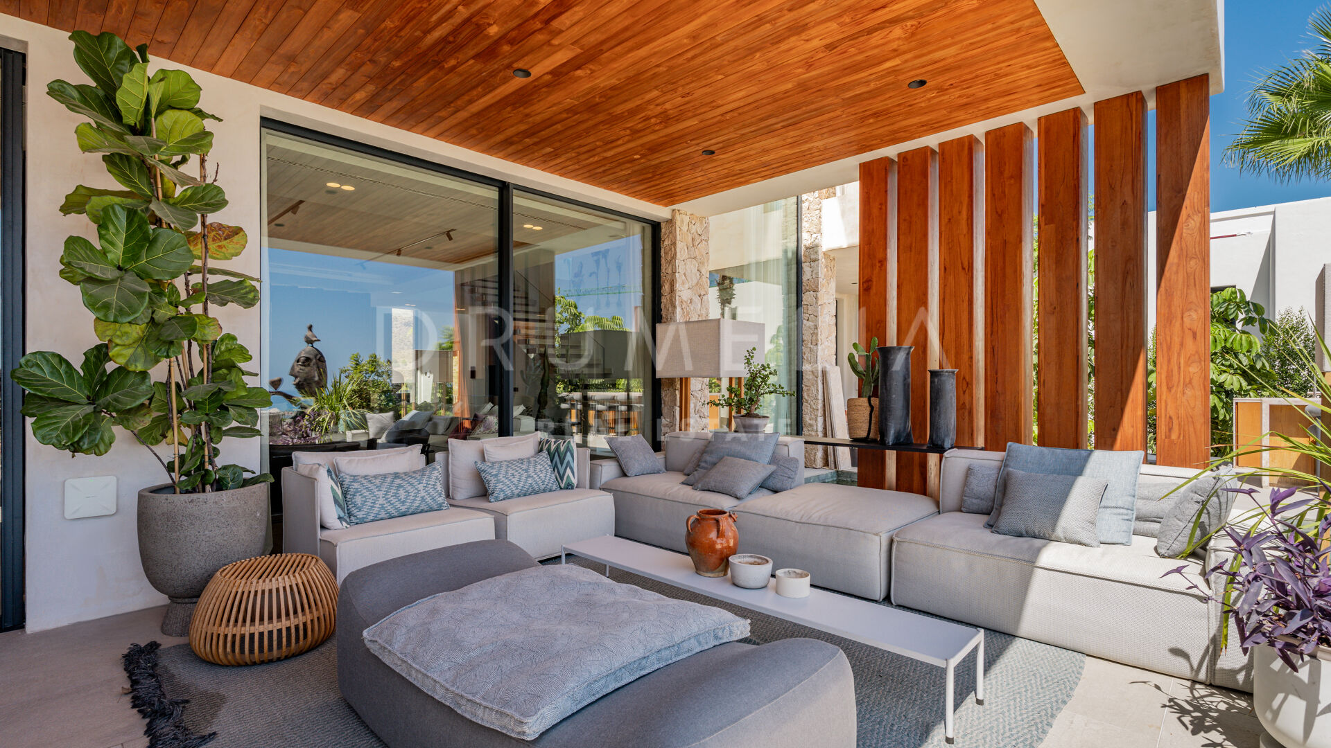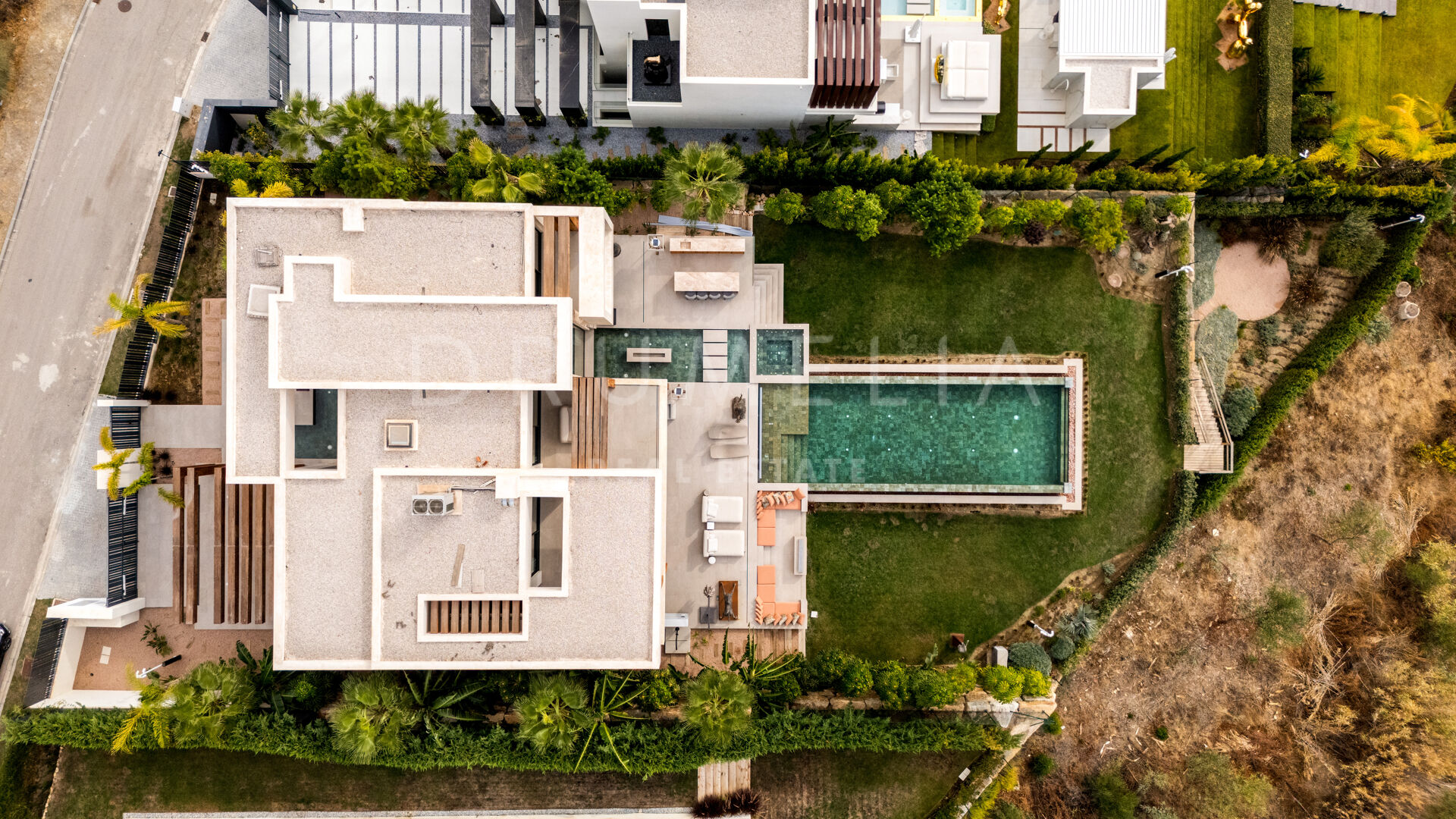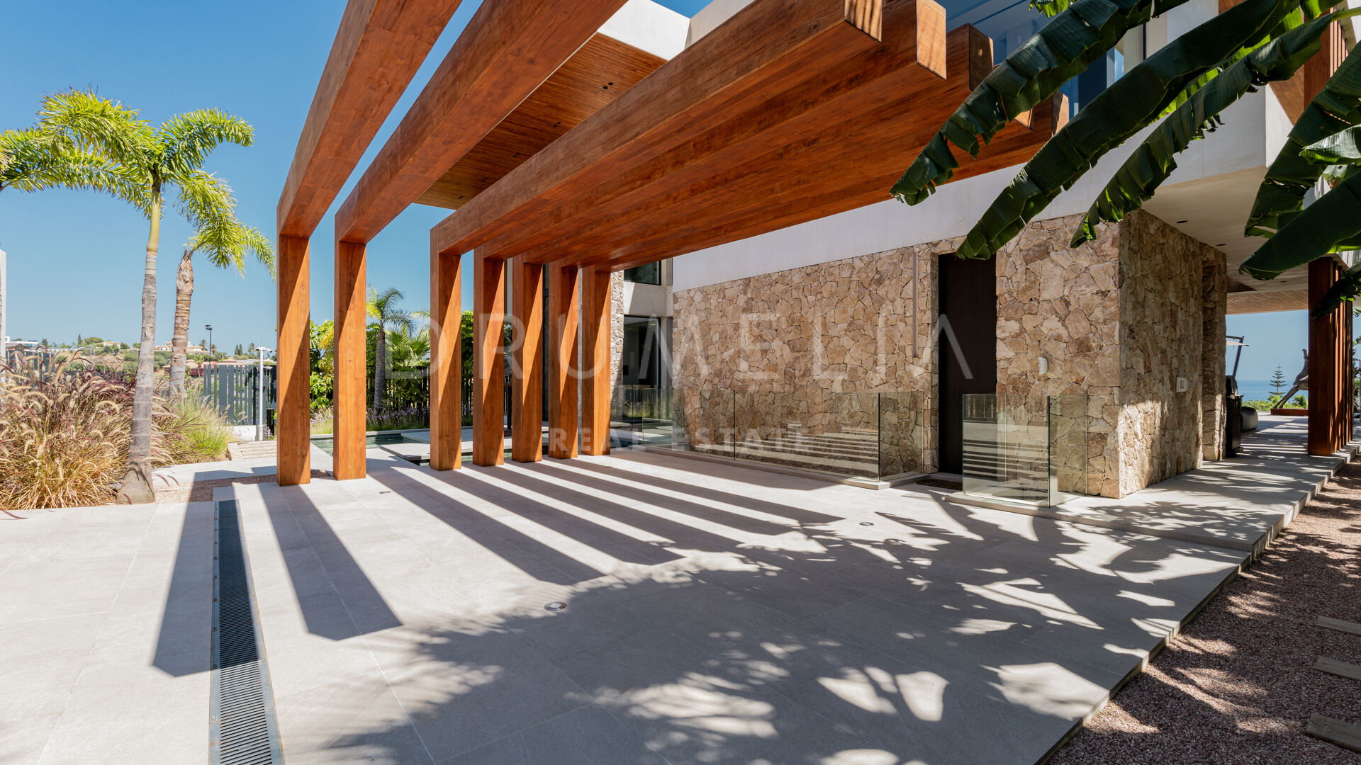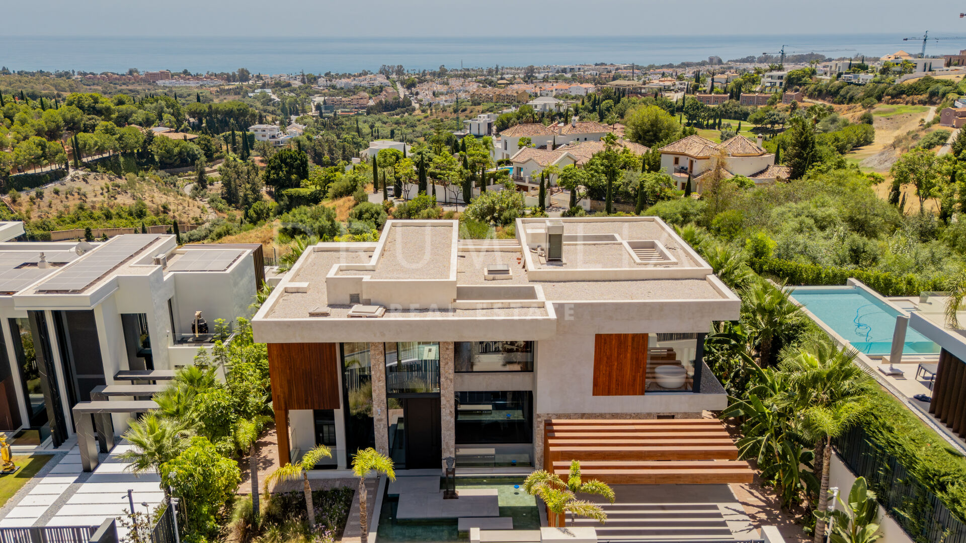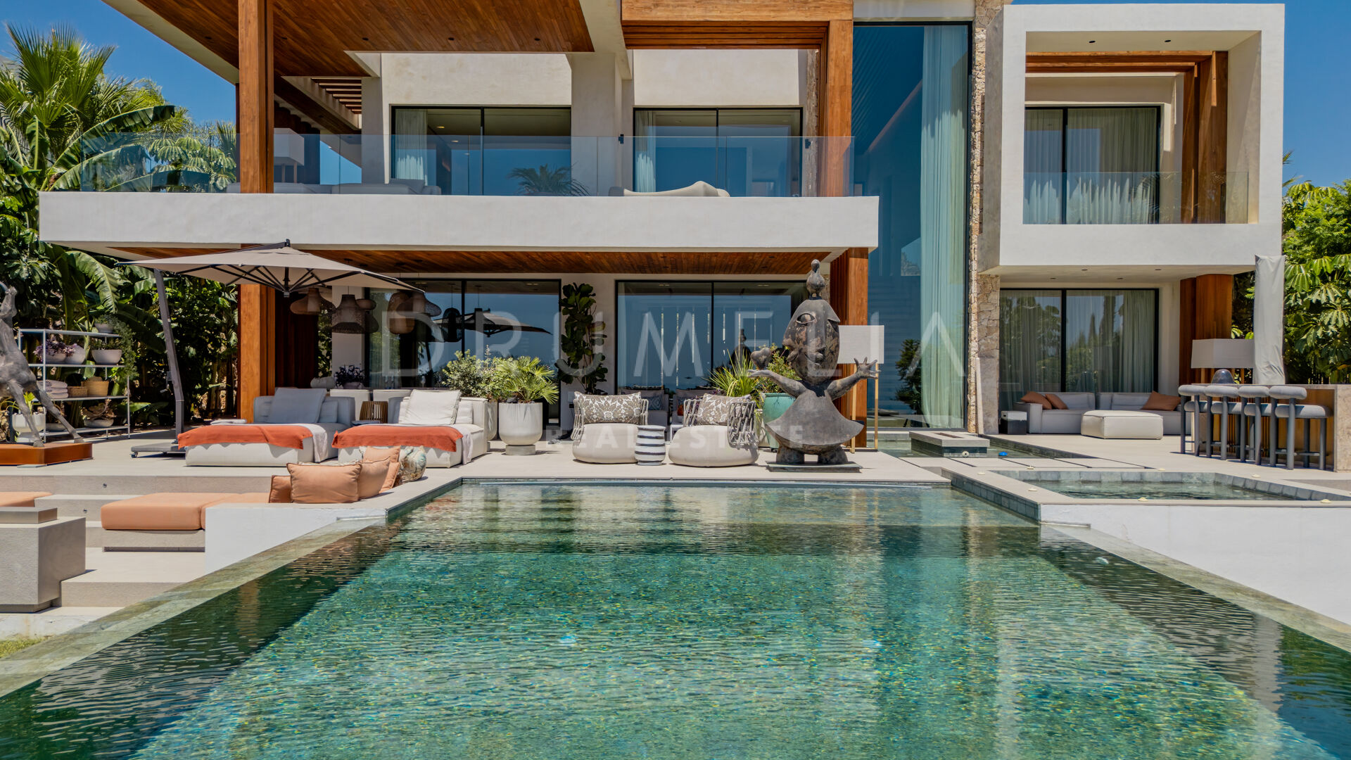 Terrassene, totalt 183 m², tilbyr en perfekt blanding av overbygde og åpne områder, alle designet for å utnytte den utrolige utsikten. Evighetsbassenget fungerer som et slående midtpunkt og skaper en ideell setting for både avslapning og sosiale sammenkomster.