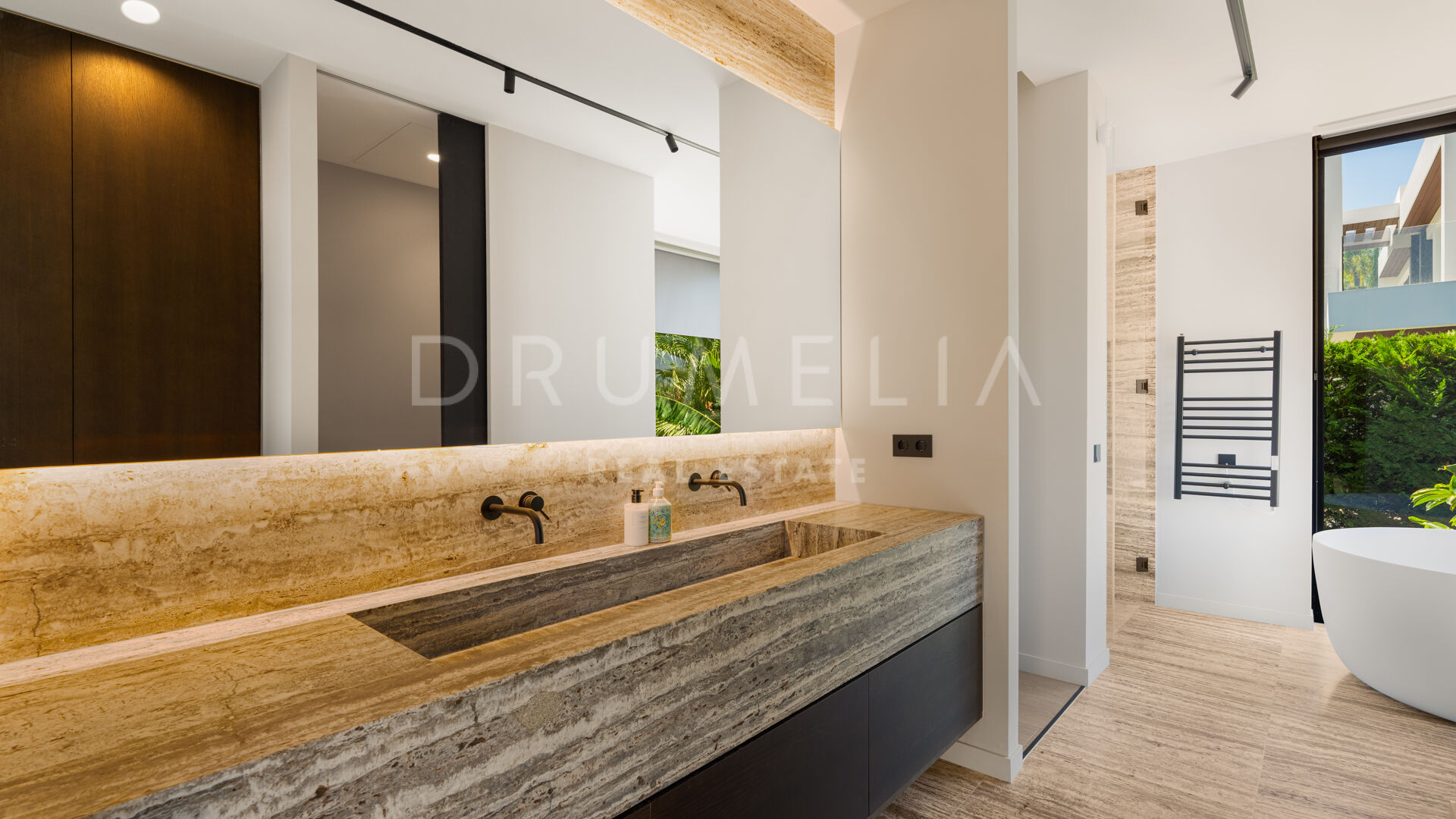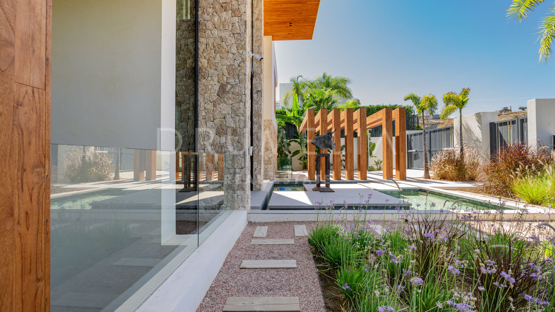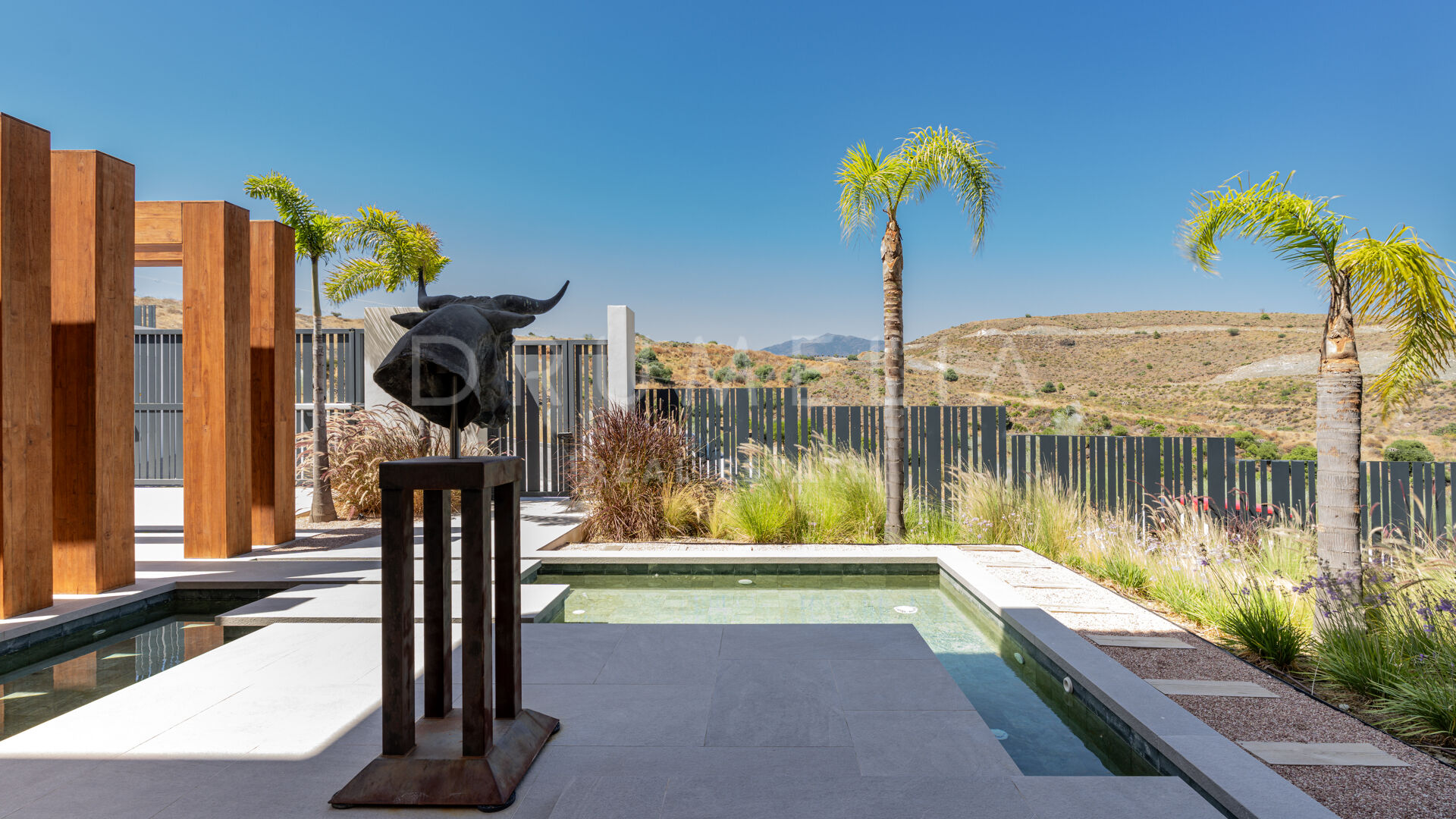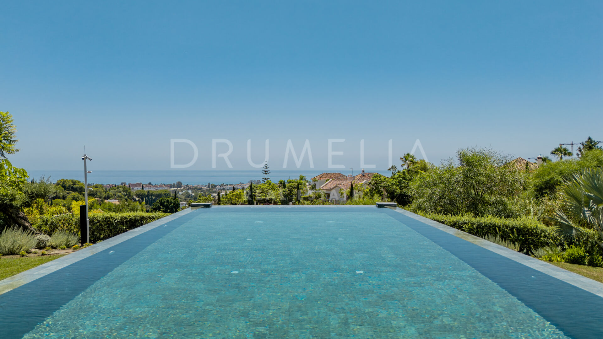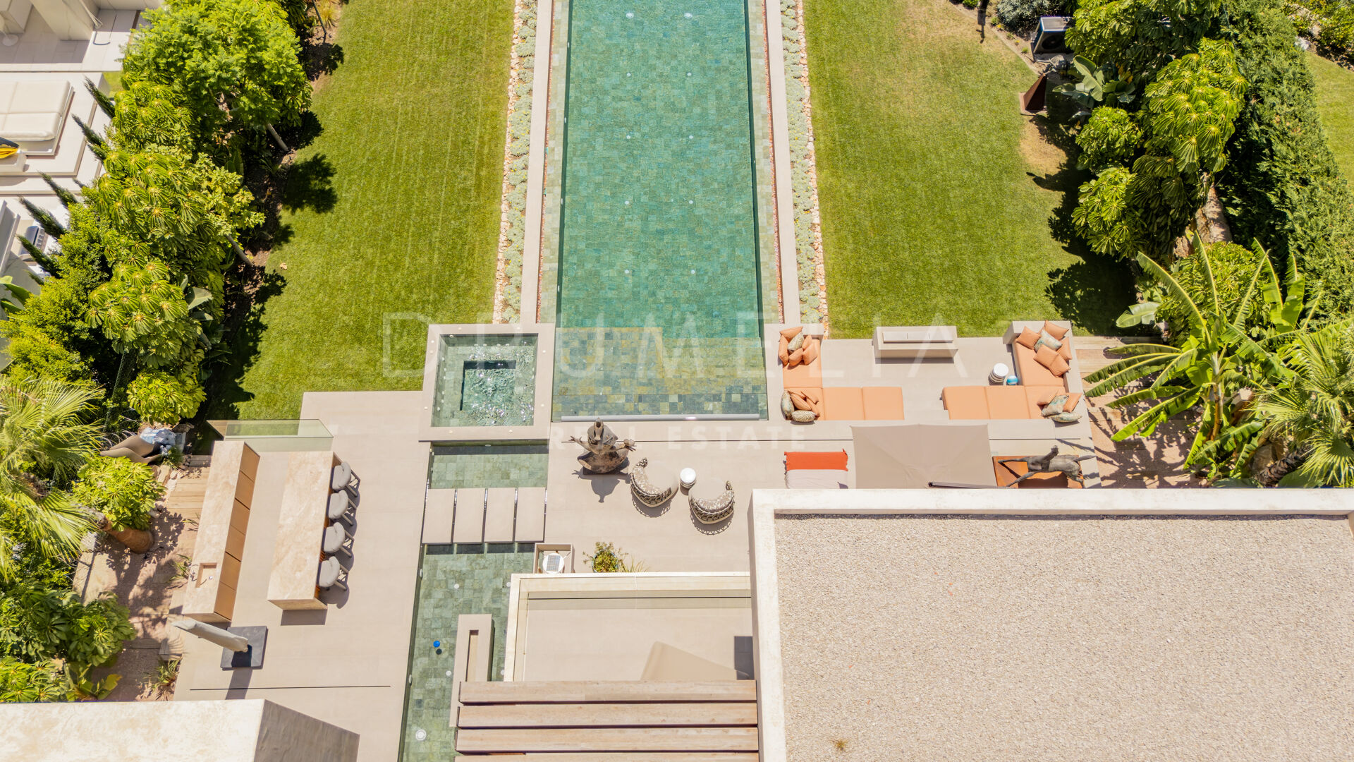 Terrassene, totalt 183 m², tilbyr en perfekt blanding av overbygde og åpne områder, alle designet for å utnytte den utrolige utsikten. Evighetsbassenget fungerer som et slående midtpunkt og skaper en ideell setting for både avslapning og sosiale sammenkomster.