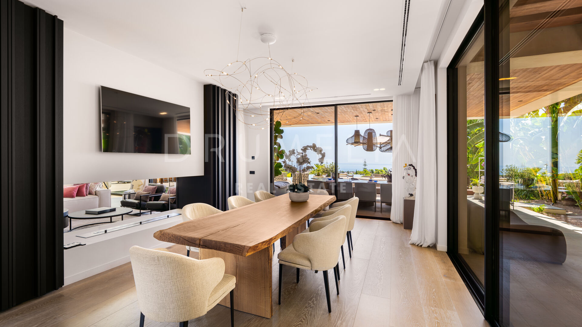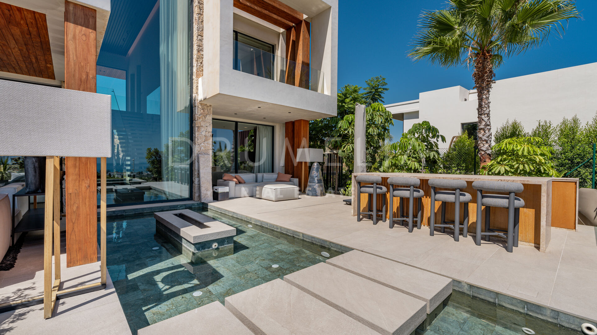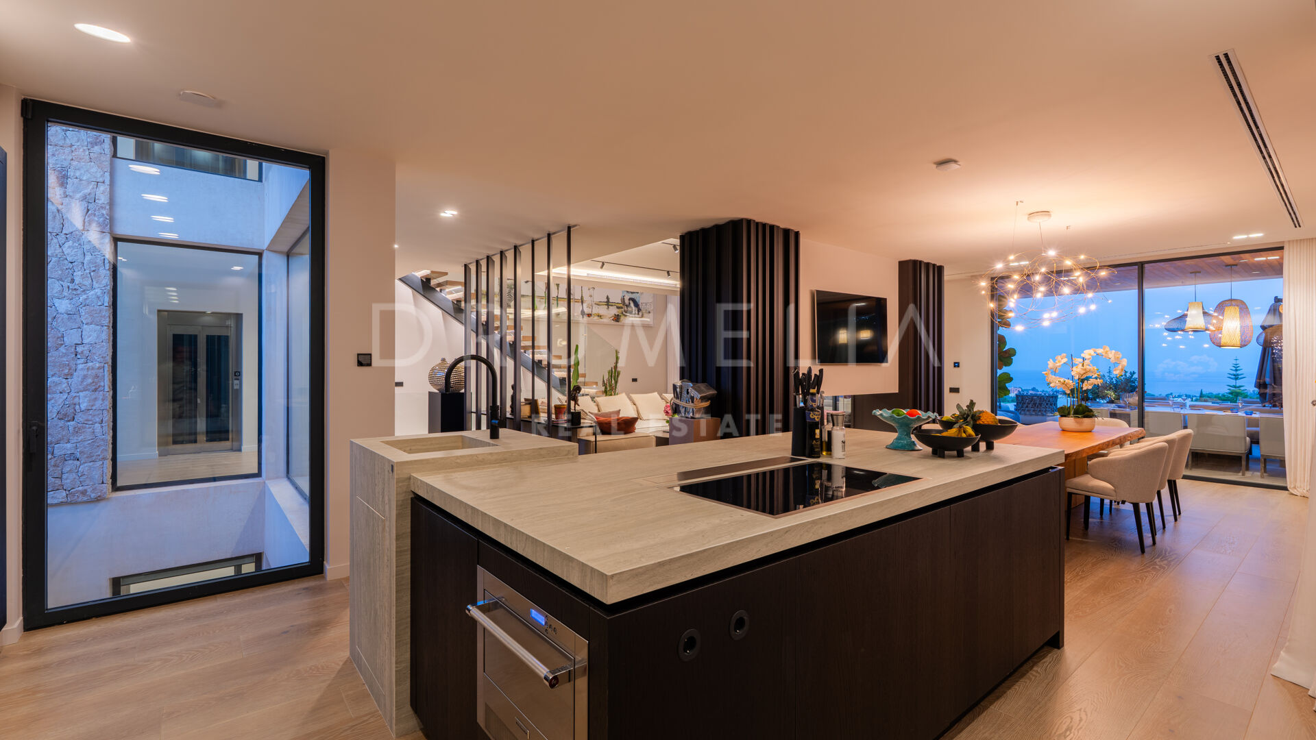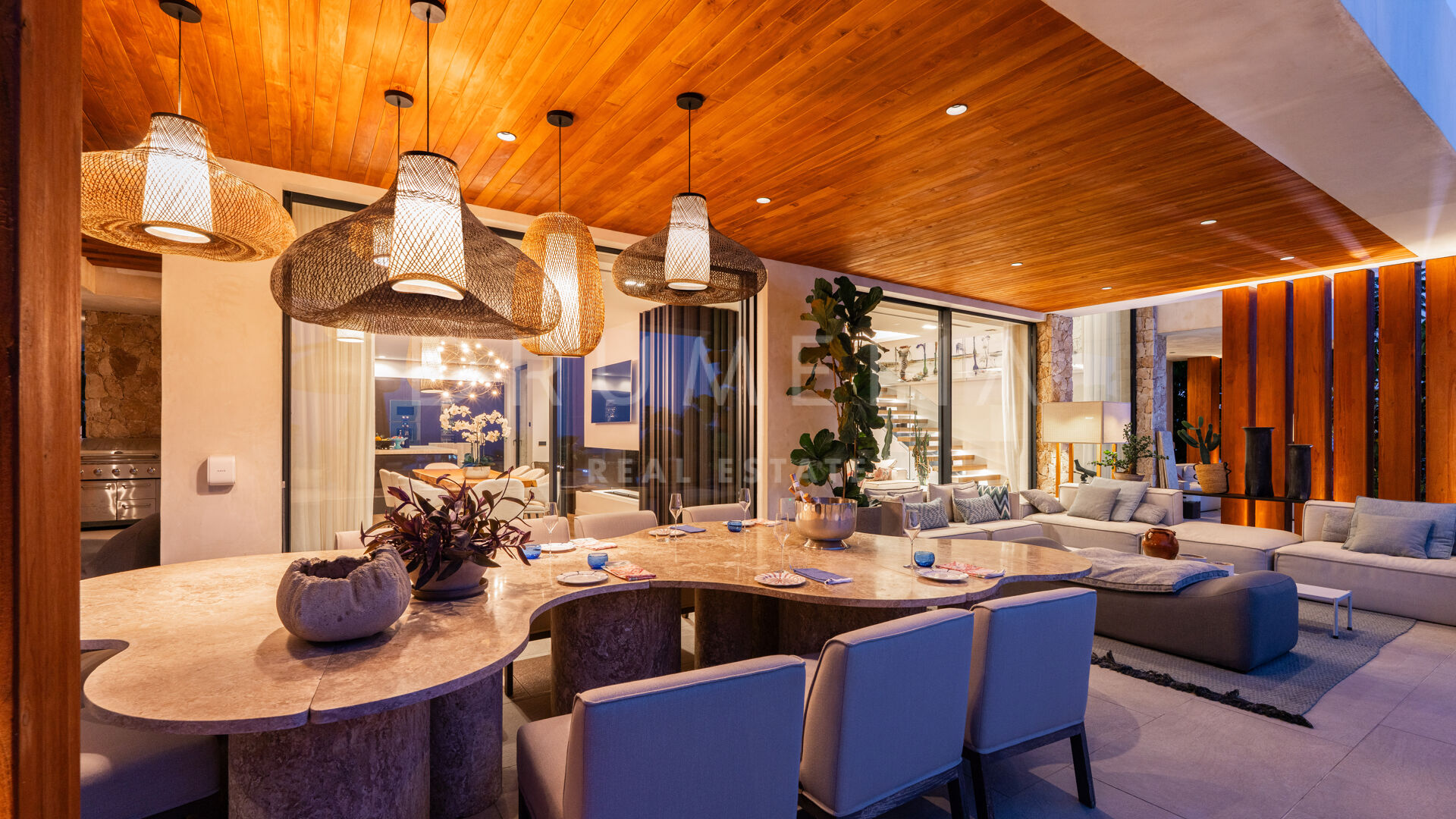 Hovedetasjen har et elegant designerkjøkken, fullt utstyrt og sømløst integrert i de romslige spise- og oppholdsrommene — perfekt for avslappet familieliv eller stilfull underholdning. Dette området åpner ut mot en overbygd terrasse med utendørs bar, ideelt for middager under åpen himmel og sommerarrangementer.