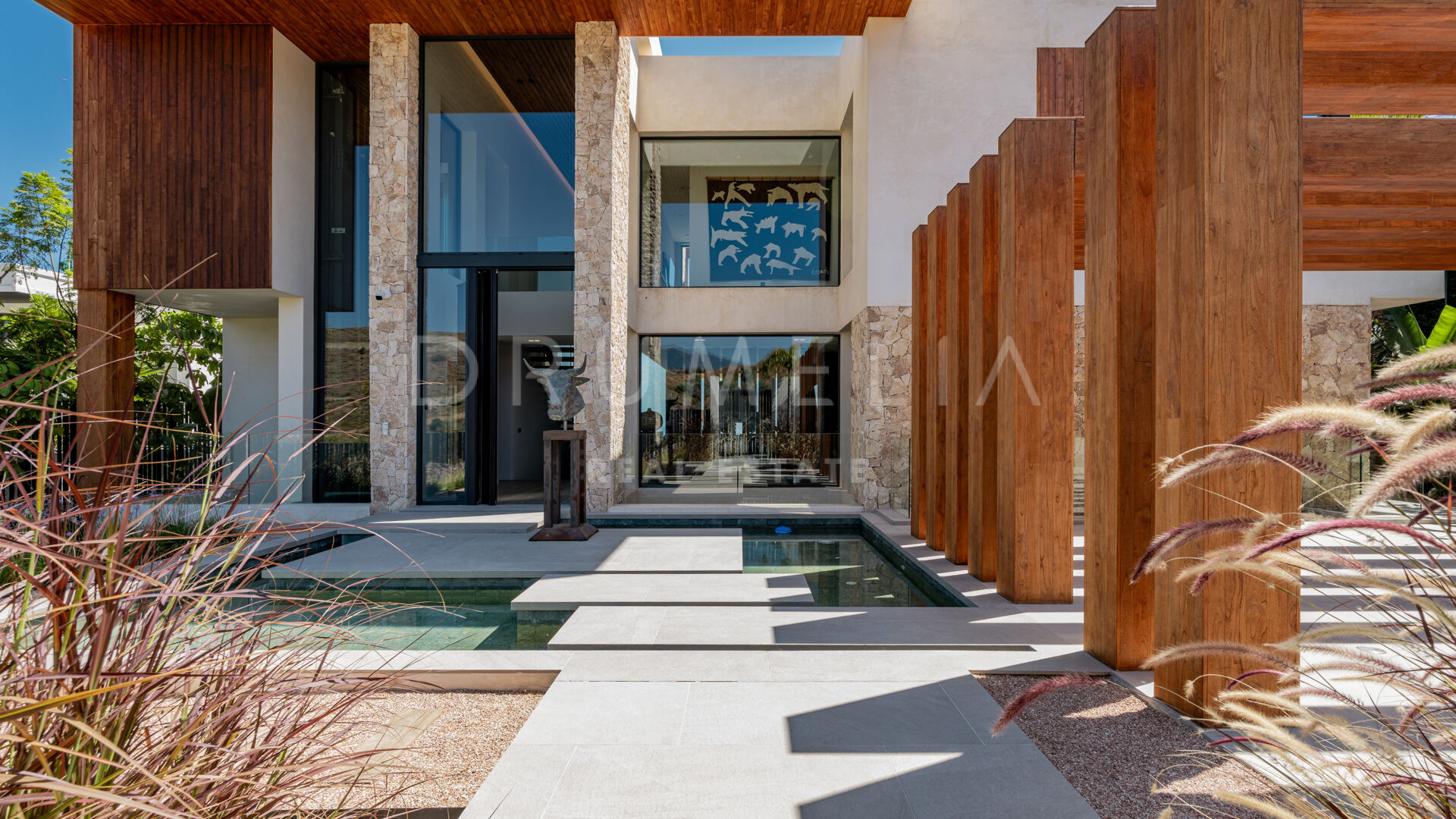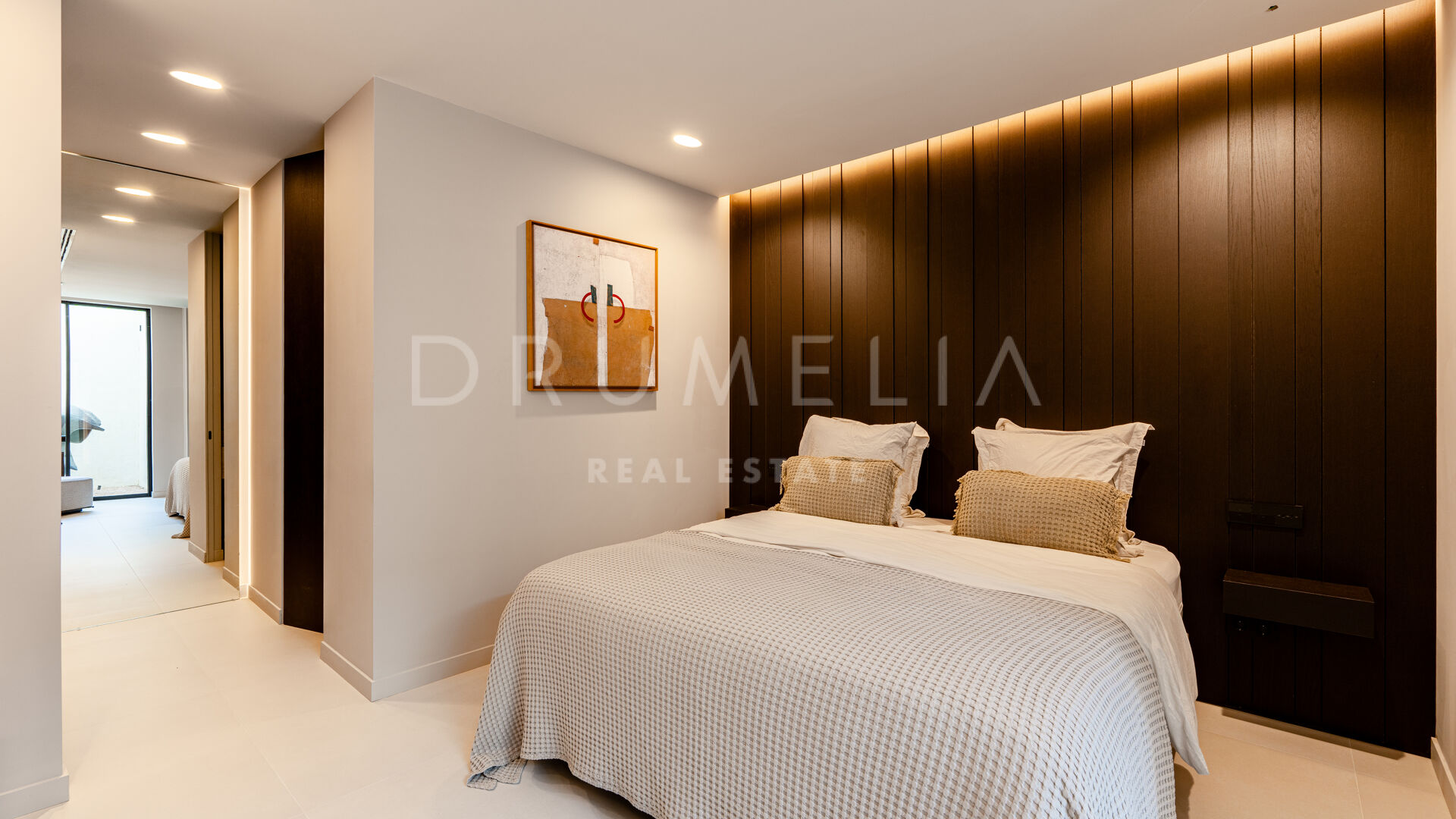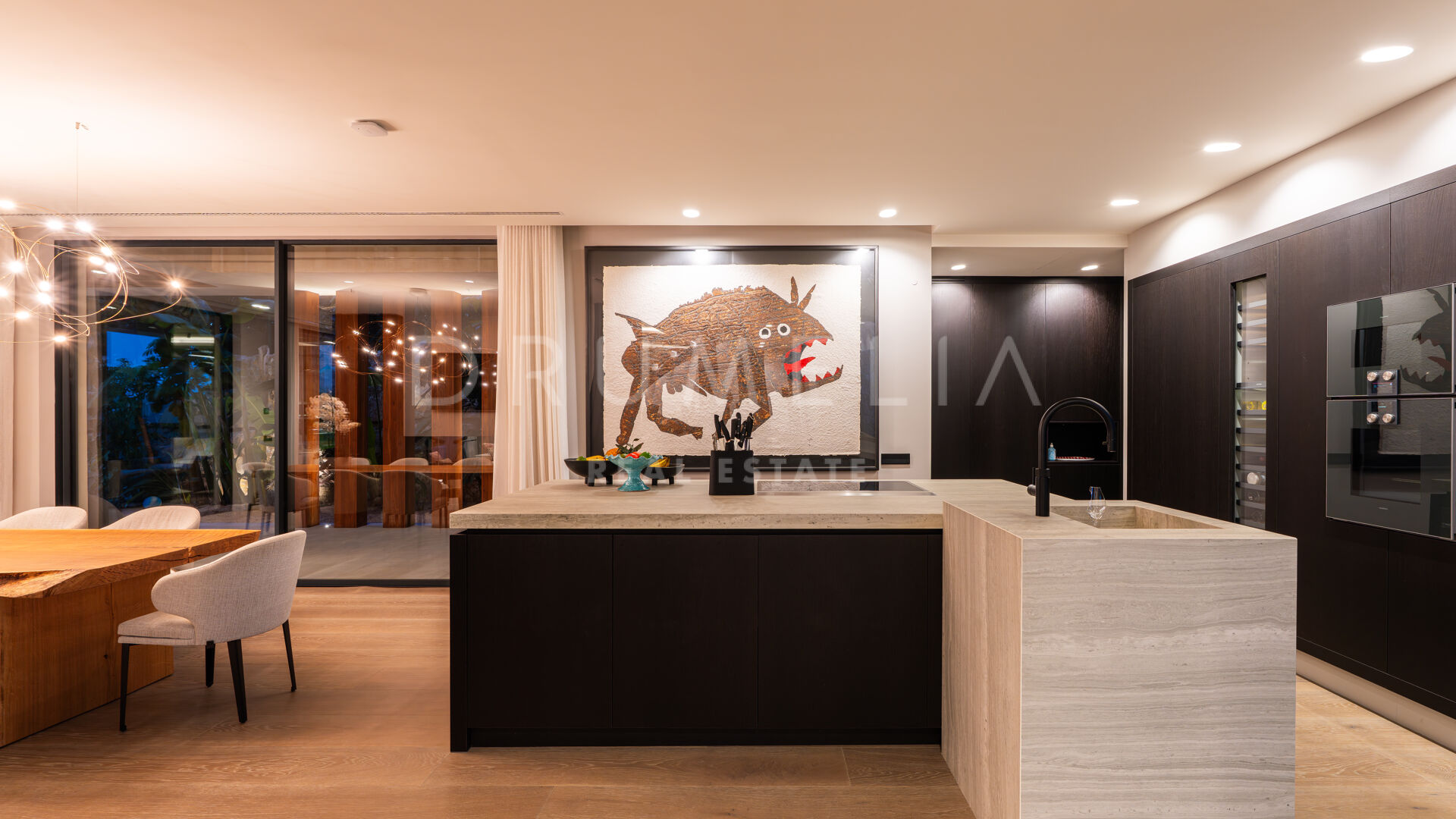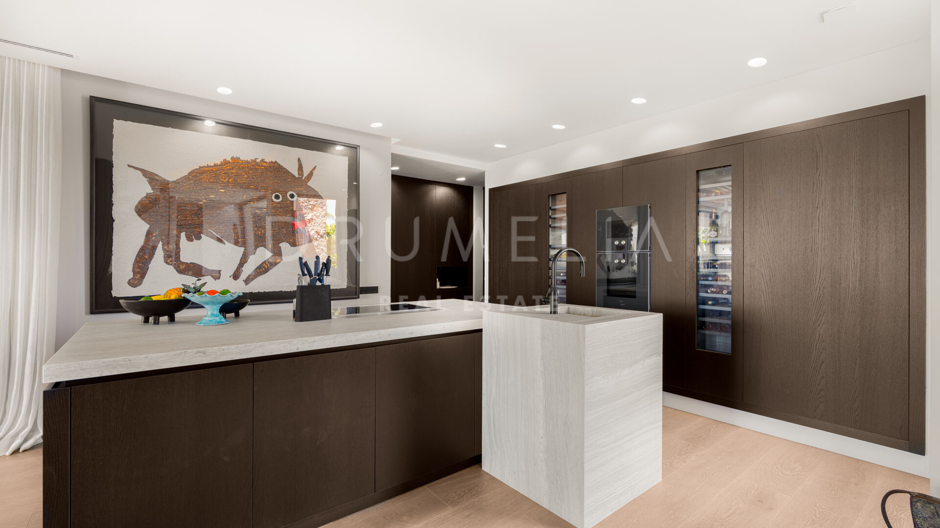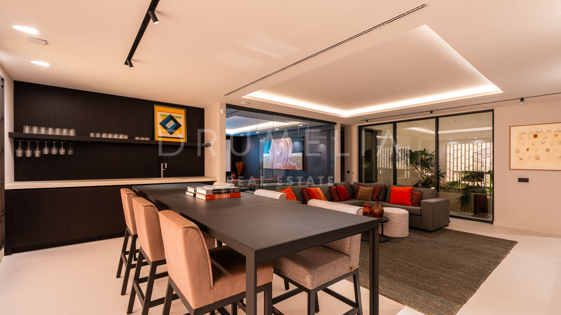 Hovedetasjen har et elegant designerkjøkken, fullt utstyrt og sømløst integrert i de romslige spise- og oppholdsrommene — perfekt for avslappet familieliv eller stilfull underholdning. Dette området åpner ut mot en overbygd terrasse med utendørs bar, ideelt for middager under åpen himmel og sommerarrangementer.