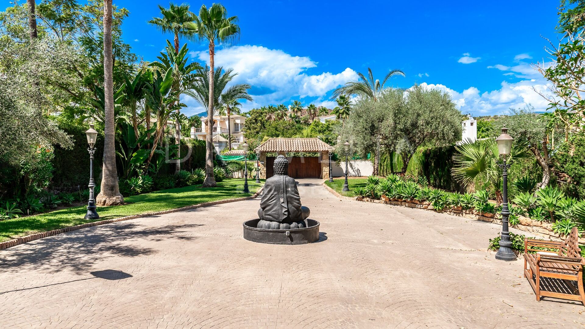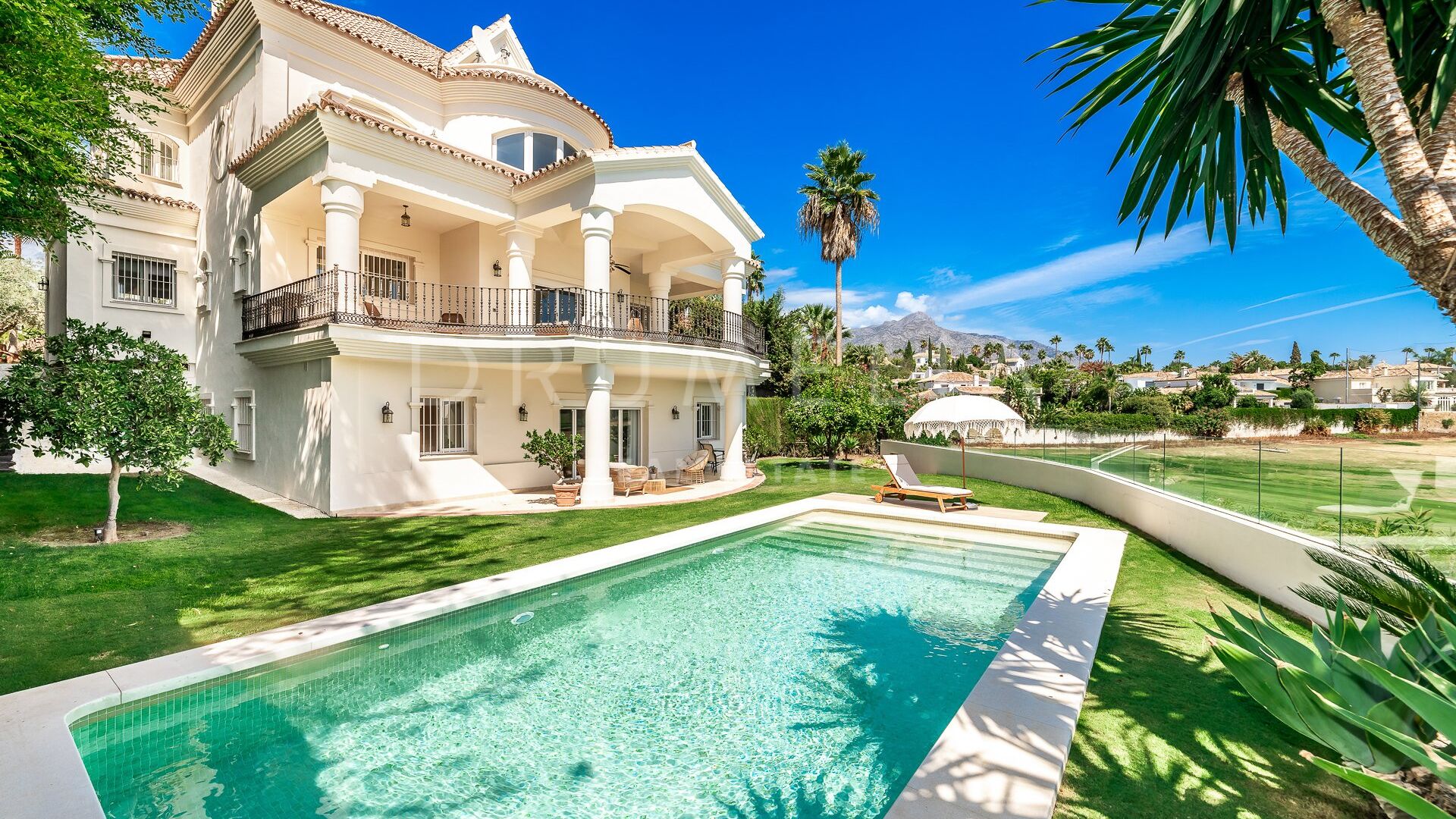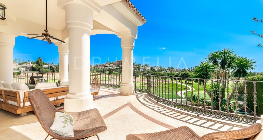 Denne edle og elegante villaen med 7 soverom og betagende utsikt over fairwayen er til salgs i Nueva Andalucia, det største og mest ettertraktede området i Marbella. Dette er et vakkert nabolag med velutviklet infrastruktur og kosmopolitisk atmosfære. Området tar vare på sine andalusiske røtter og sin kulturarv. Naturen viser seg også i all sin prakt. Den vakre Lago de los Tortugas (skilpaddesjøen) er et av stedene med stor økologisk verdi, og et interessant møtested for en dag med barn og piknik med venner og familie.