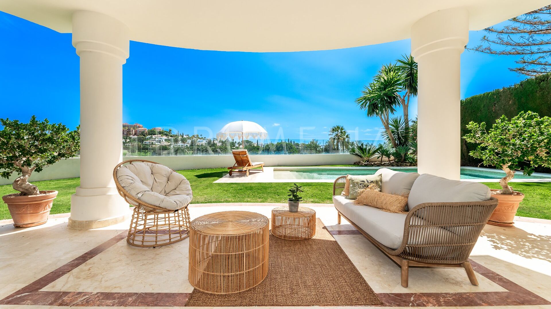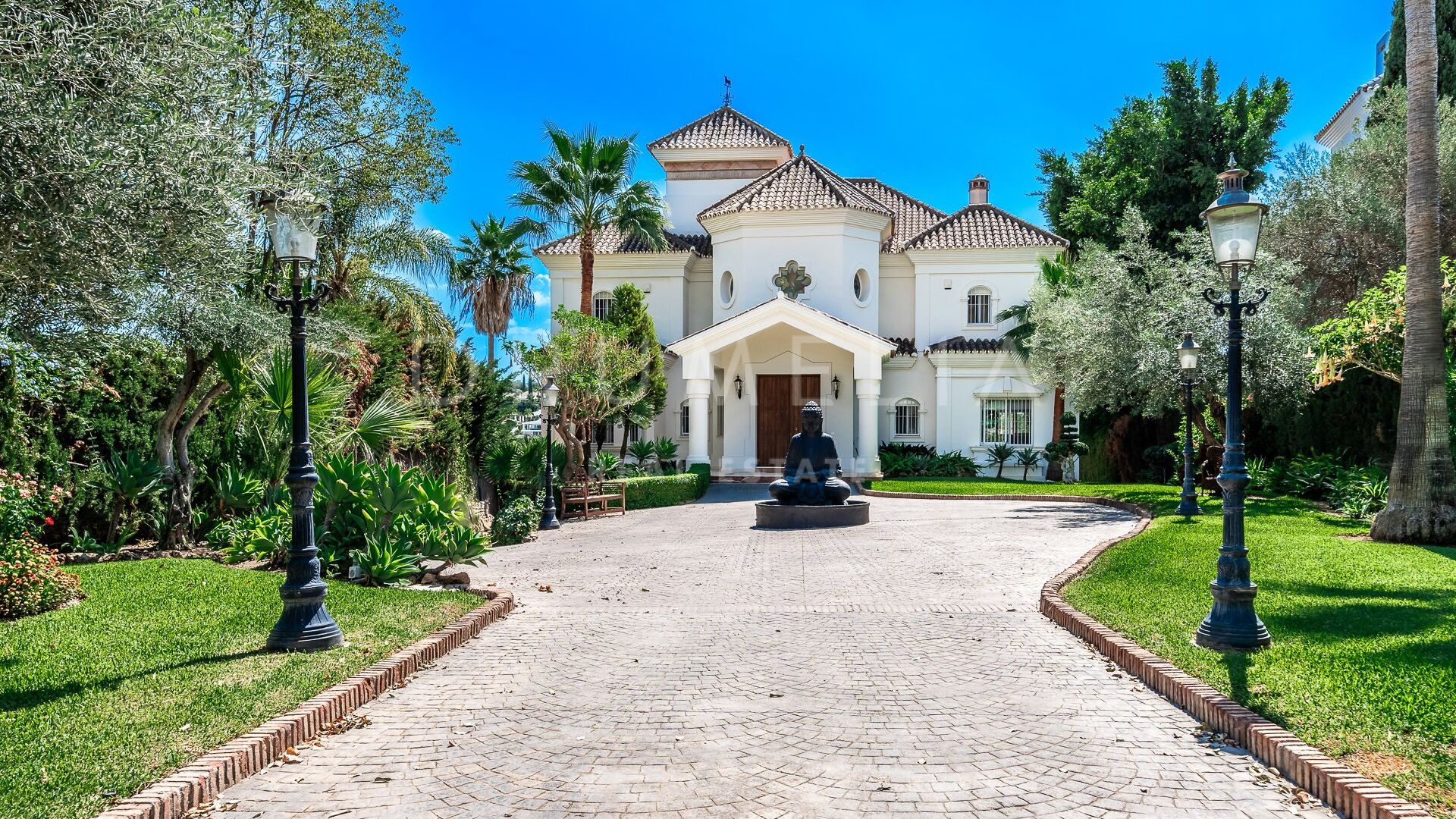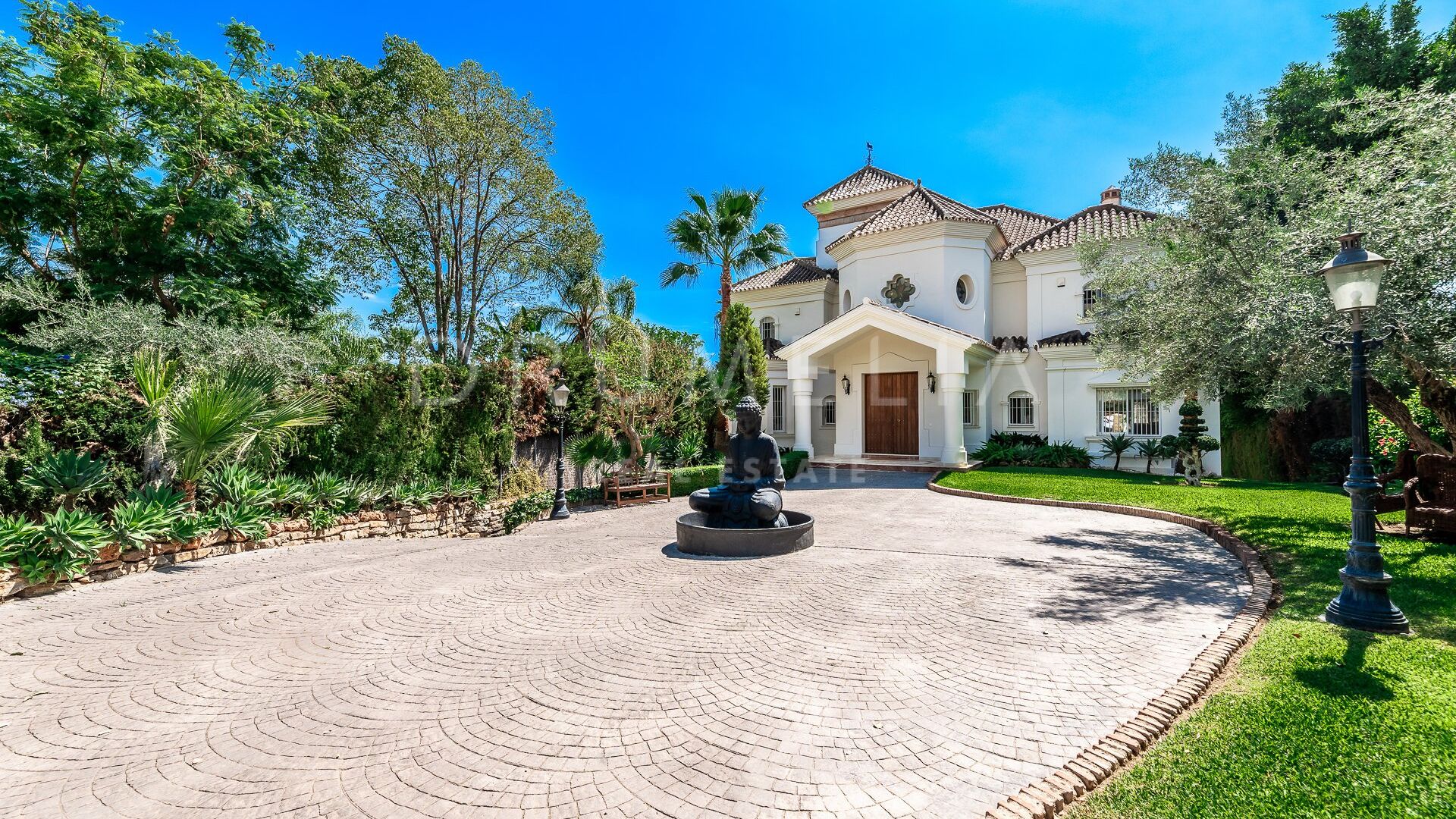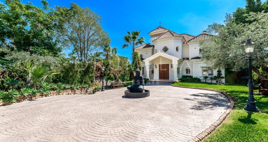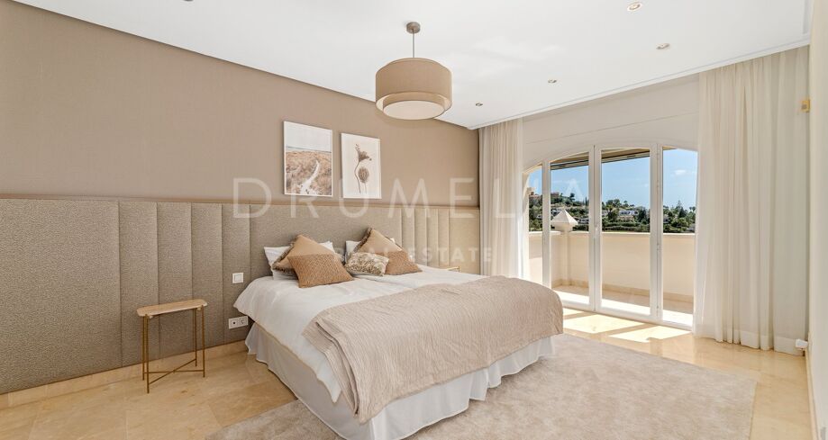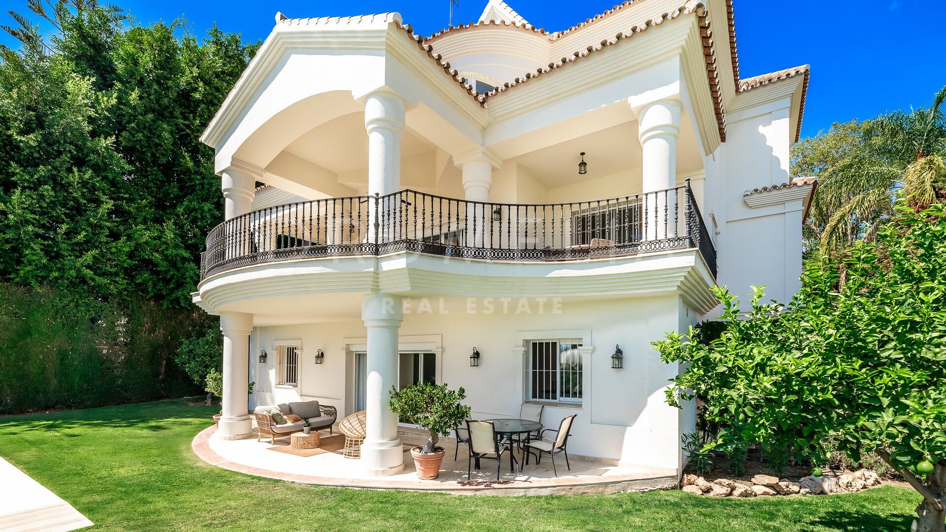 Denne nyrenoverte villaen på 800 m² har en umiskjennelig middelhavsstil og ligger på en 1 425 m² stor tomt med utsikt over golfbanen og fjellene. Her kombineres tidløs klassisk eleganse med ergonomi og raffinert komfort. Eiendommen bærer preg av en klar kulturell preferanse for den historiske og tradisjonelle opplevelsen. Det imponerer med sin eksepsjonelt stilfulle arkitektur, subtropiske hager og imponerende asfalterte innkjørsel. Betydelige middelhavselementer forskjønner bygningen: Spanske takstein, treelementer, aksentvegger, fine marmorgulv, buede glassdører, søyler osv. De myke og nøytrale fargene er inspirert av naturen og skaper en beroligende og behagelig atmosfære. Rommene har private balkonger, overbygde og åpne terrasser.