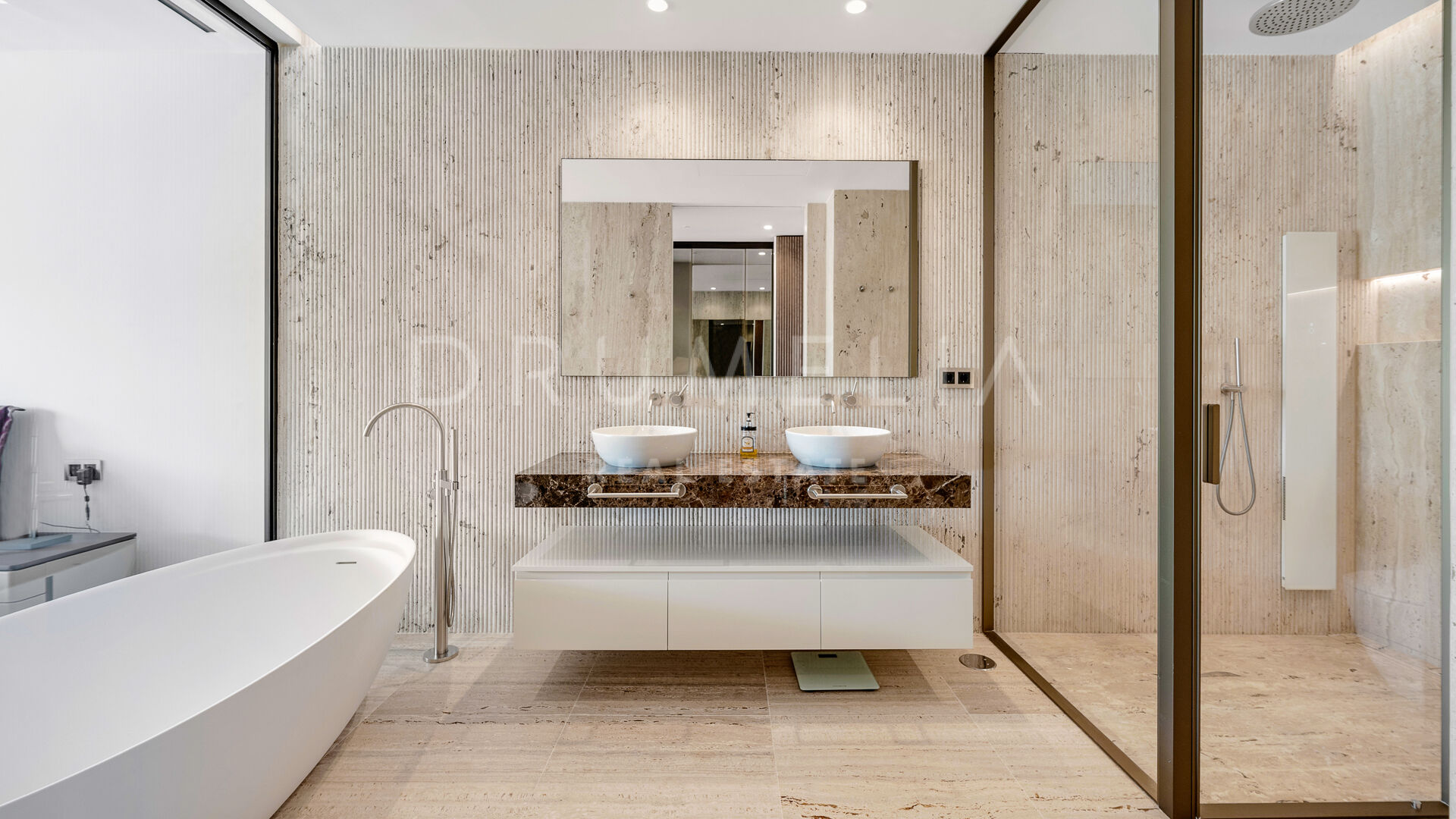 Interiøret har en raffinert estetikk med naturlige toner, rene linjer og materialer av høy kvalitet. Stue og kjøkken i åpen planløsning fører ut til en stor sørvestvendt terrasse med utsikt over hager og felles bassengområder. Fra terrassen og solariumet skaper havutsikten en unik middelhavsfølelse. Soverommene har vinduer fra gulv til tak, spesialtilpassede garderober og egne bad med naturstein, doble vasker og regndusjer.