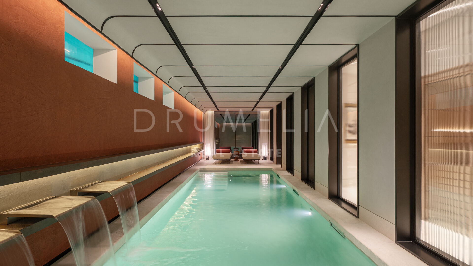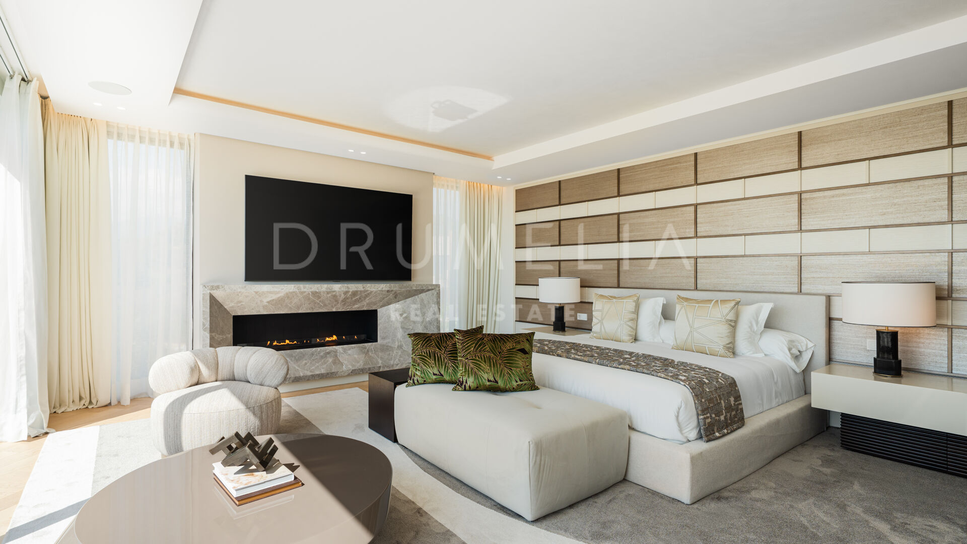 Villaen strekker seg over tre etasjer, koblet sammen med heis. Hovedetasjen har lyse, åpne oppholdsrom hvor kjøkken, spisestue og stue flyter sømløst ut mot en stor terrasse med utsikt over hagen og bassenget. Et fullt utstyrt sekundært kjøkken og to gjesterom med eget bad kompletterer etasjen. Hvert element gjenspeiler Pedro Peñas elegante interiørdesign, med skreddersydde møbler, myke teksturer og utvalgte kunstverk.