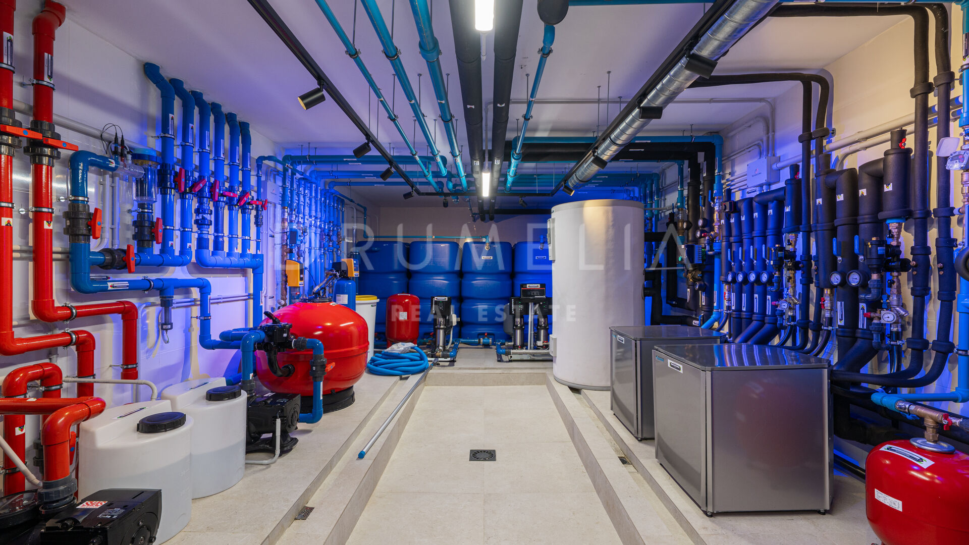 Nedre etasje er designet for velvære og avslapning, med gjesterom, barlounge, privat spa med oppvarmet innendørsbasseng og badstue, samt et fullt utstyrt treningsrom. Et spesialbygd teknisk rom fra Proinsermant sikrer effektivitet og diskresjon.