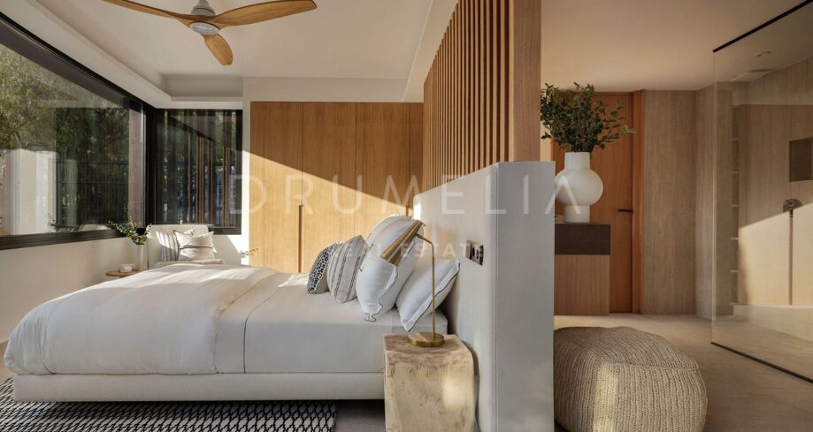 Hver soveromssuite har innebygde garderober og eget eget eget eget bad, noe som gjør eiendommen praktisk for store familier eller vertsgrupper. Soverommet har et konsistent designspråk i hele: teksturerte veggpaneler i varme tretoner, lin møbler og takvifter som supplerer villaens organiske materiale palett. Layout fungerer som enten fem eller seks soverom avhengig av behov.