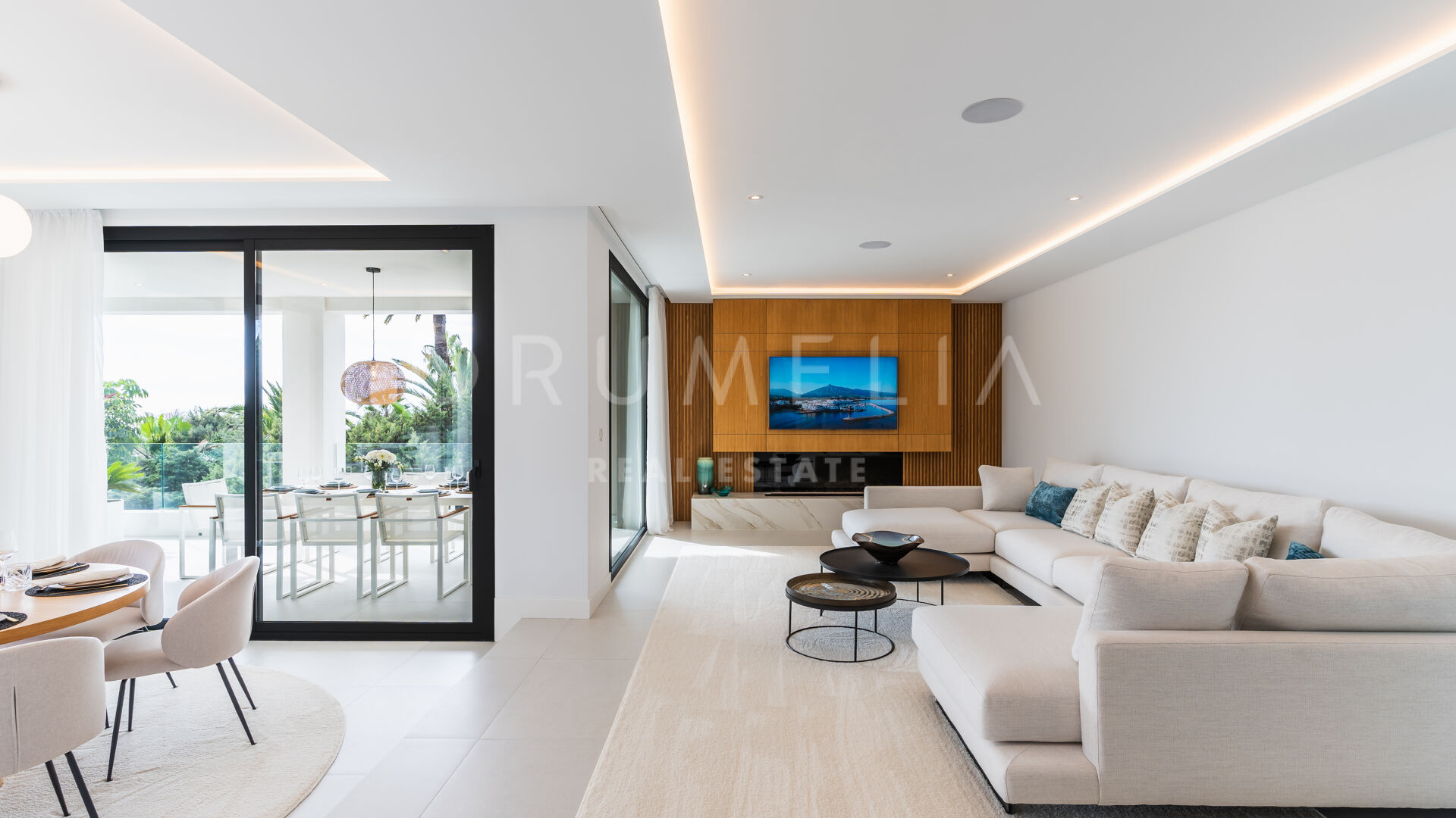 Boligen er fullt møblert med utsøkte interiør- og eksteriørelementer og er innflyttingsklar, noe som sikrer en nøkkelferdig livsstil. Et banebrytende lydsystem med flere soner innendørs og utendørs forsterker alle rom og gir den perfekte stemningen for underholdning eller avslapning.