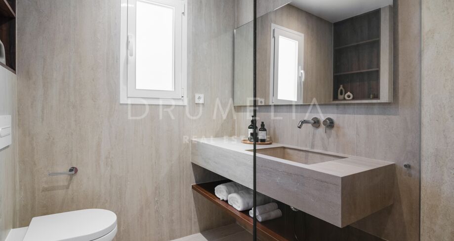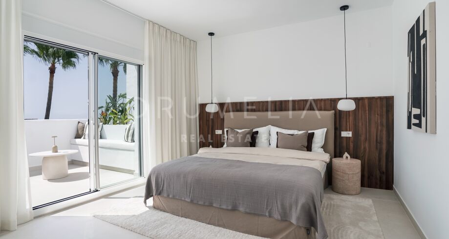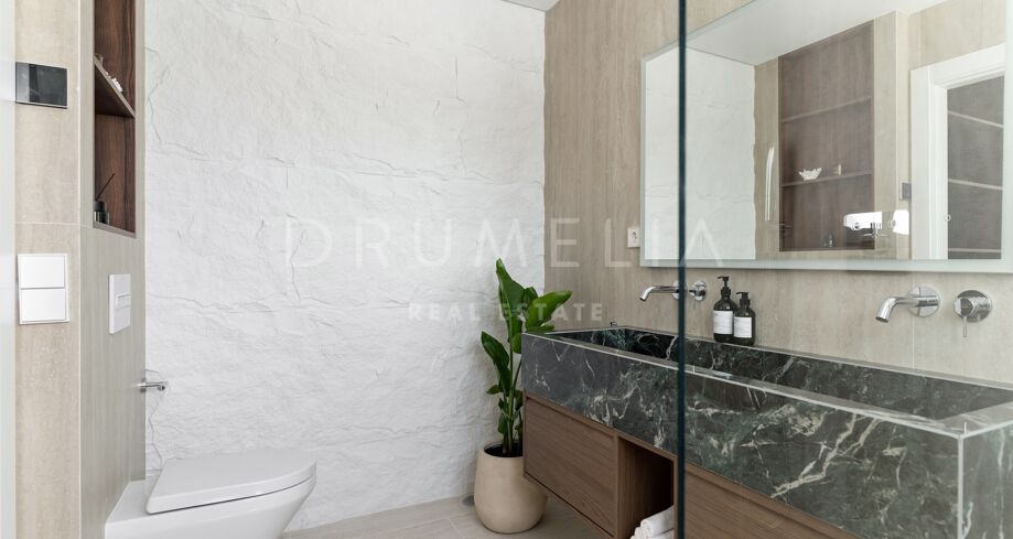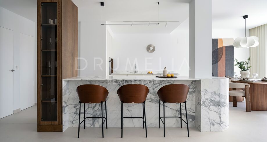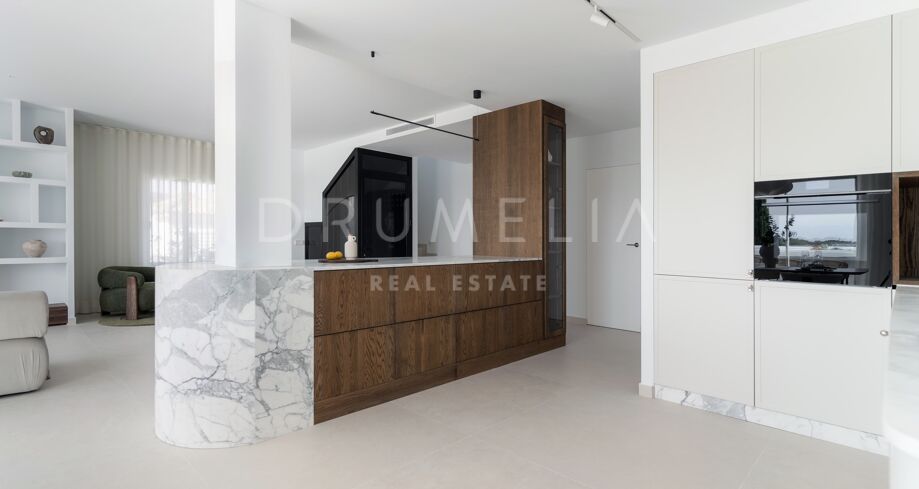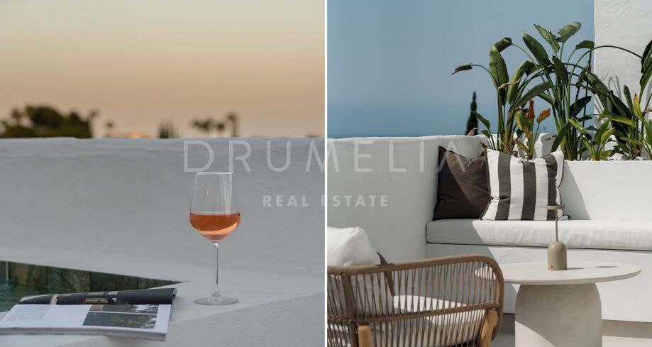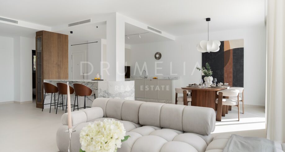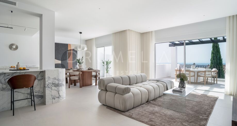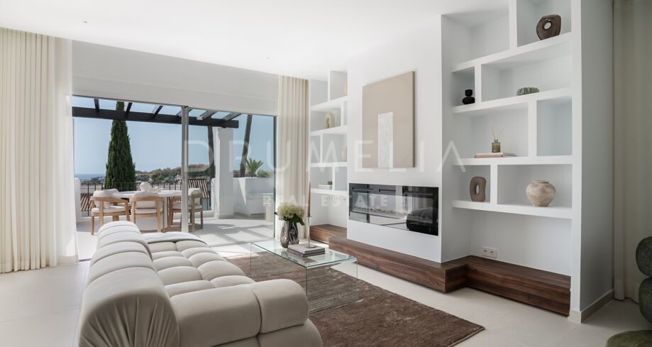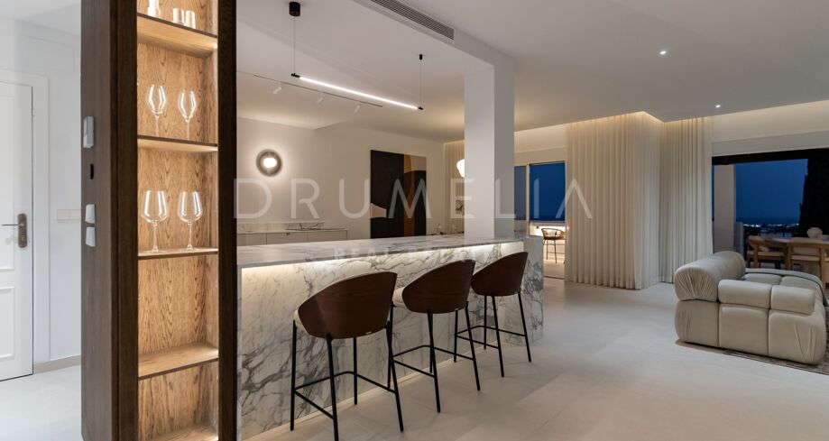 Hjørnepenthouse totalrenovert i elegant skandinavisk stil, beliggende i et av Marbellas mest ettertraktede områder: Nueva Andalucía, bare noen minutter fra Puerto Banús og omgitt av kjente golfbaner.