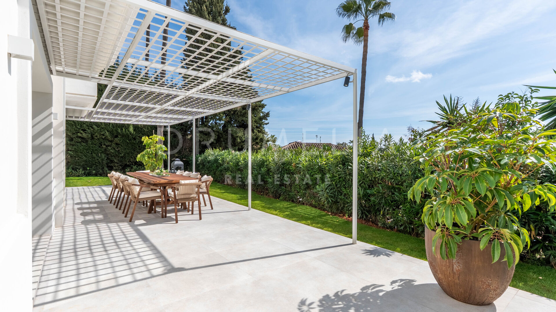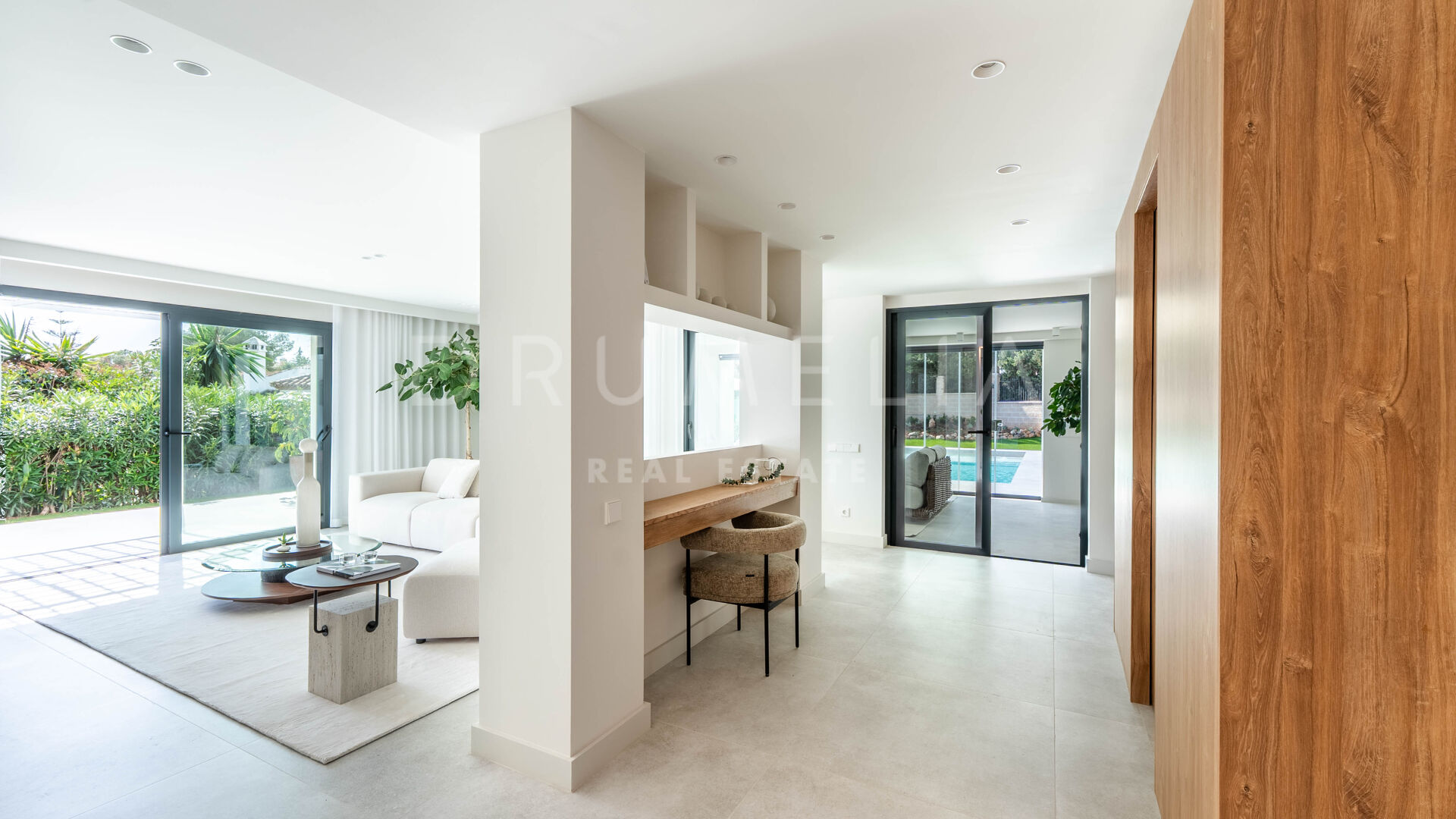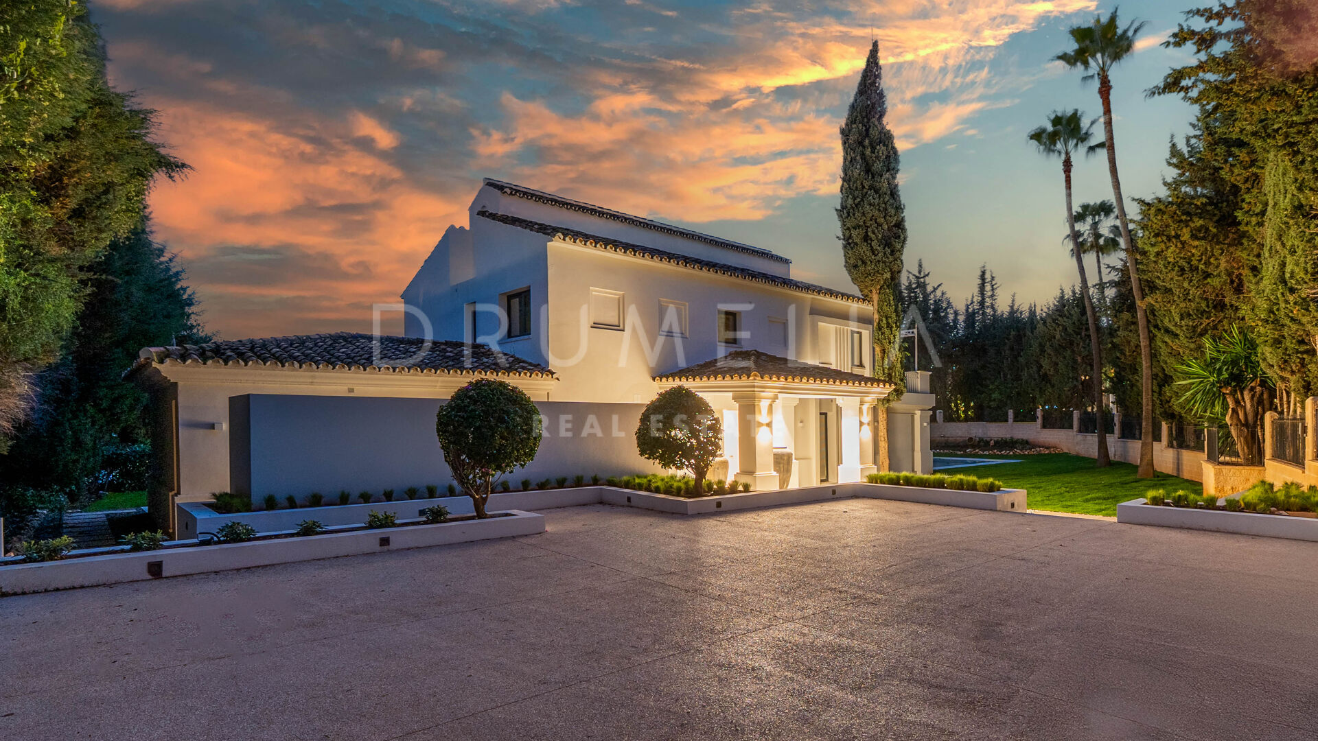 Denne luksuriøse villaen med 4 soverom, som er fullstendig renovert og innflyttingsklar i desember 2023, er til salgs i det ettertraktede Nueva Andalucia-området, et av de mest etablerte nabolagene i Marbella på Costa del Sol. Det prestisjefylte området tilbyr alt du trenger for en komfortabel livsstil, inkludert utmerkede golfbaner, treningssentre, tennis- og padlebaner, internasjonale skoler, anerkjente restauranter, økologiske kafeer og sportsbarer, supermarkeder og butikker, medisinske fasiliteter, konsertarena, kasino, friluftsmarked og mye mer. Du bor i kort avstand fra strendene med blått flagg, de trendy strandklubbene og nattelivet i verdensberømte Puerto Banus og Marbellas Golden Mile. Både Malagas og Gibraltars internasjonale flyplasser ligger mindre enn en time unna.