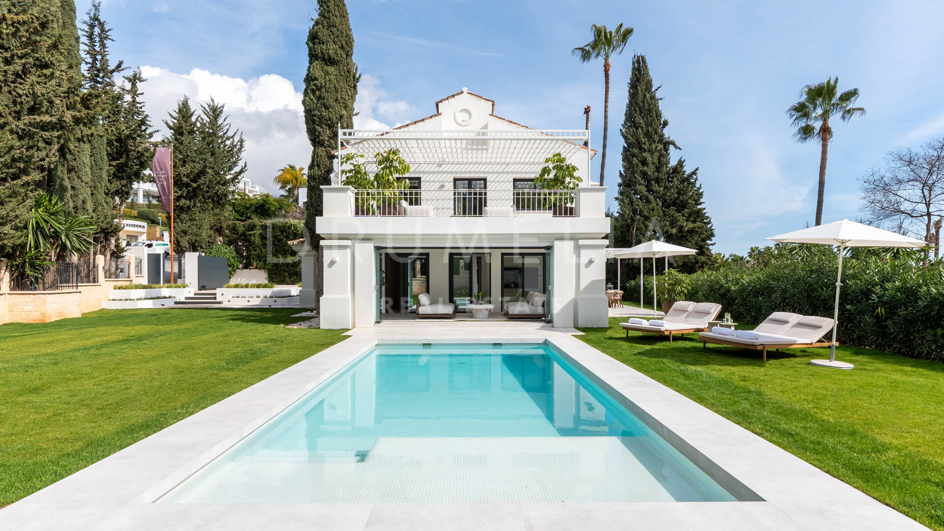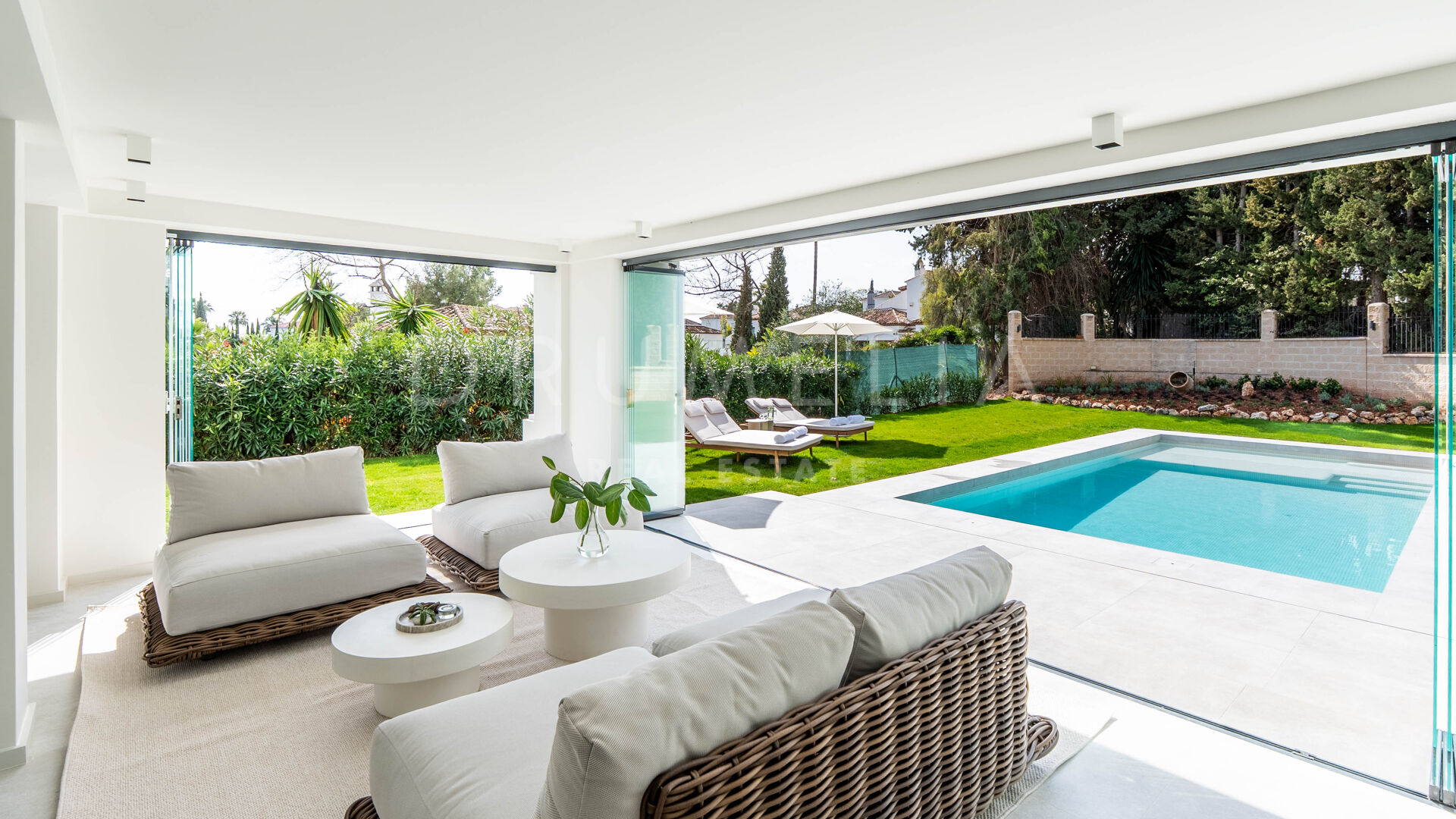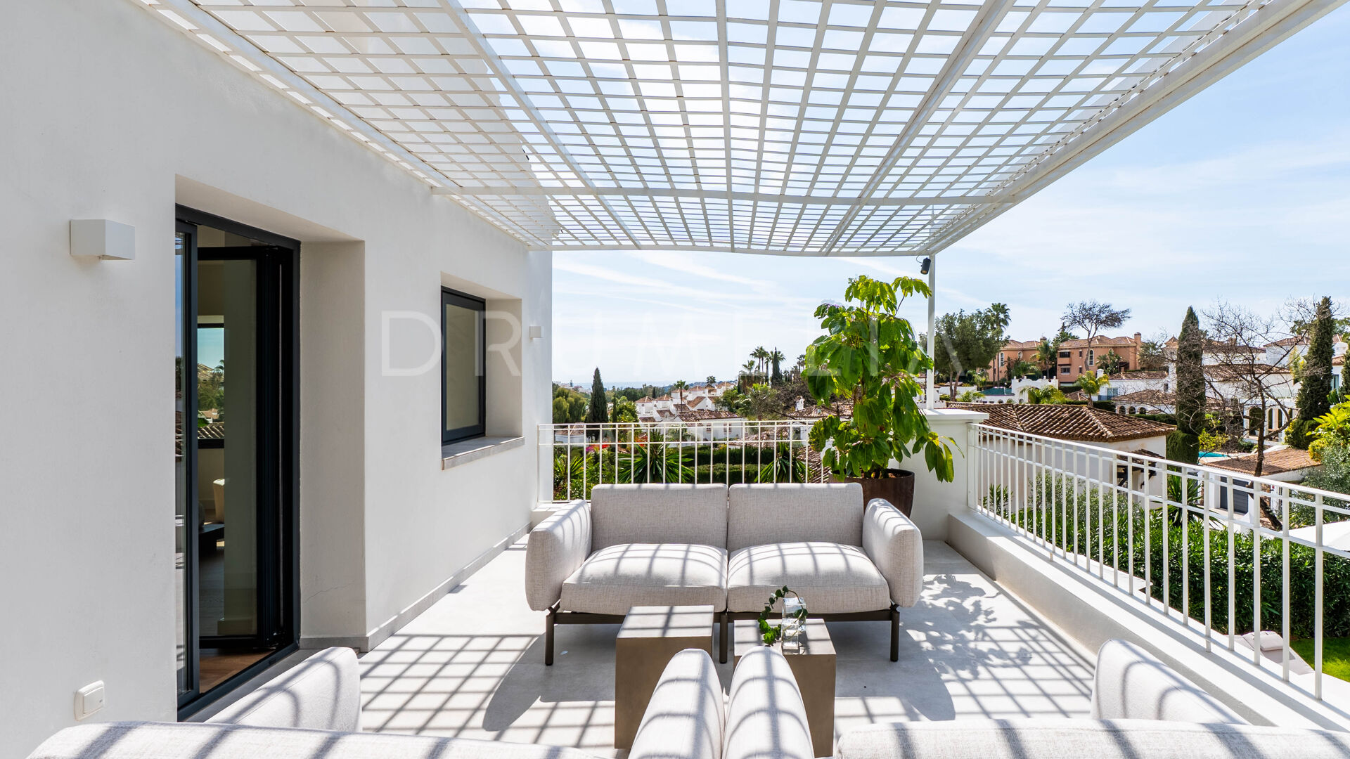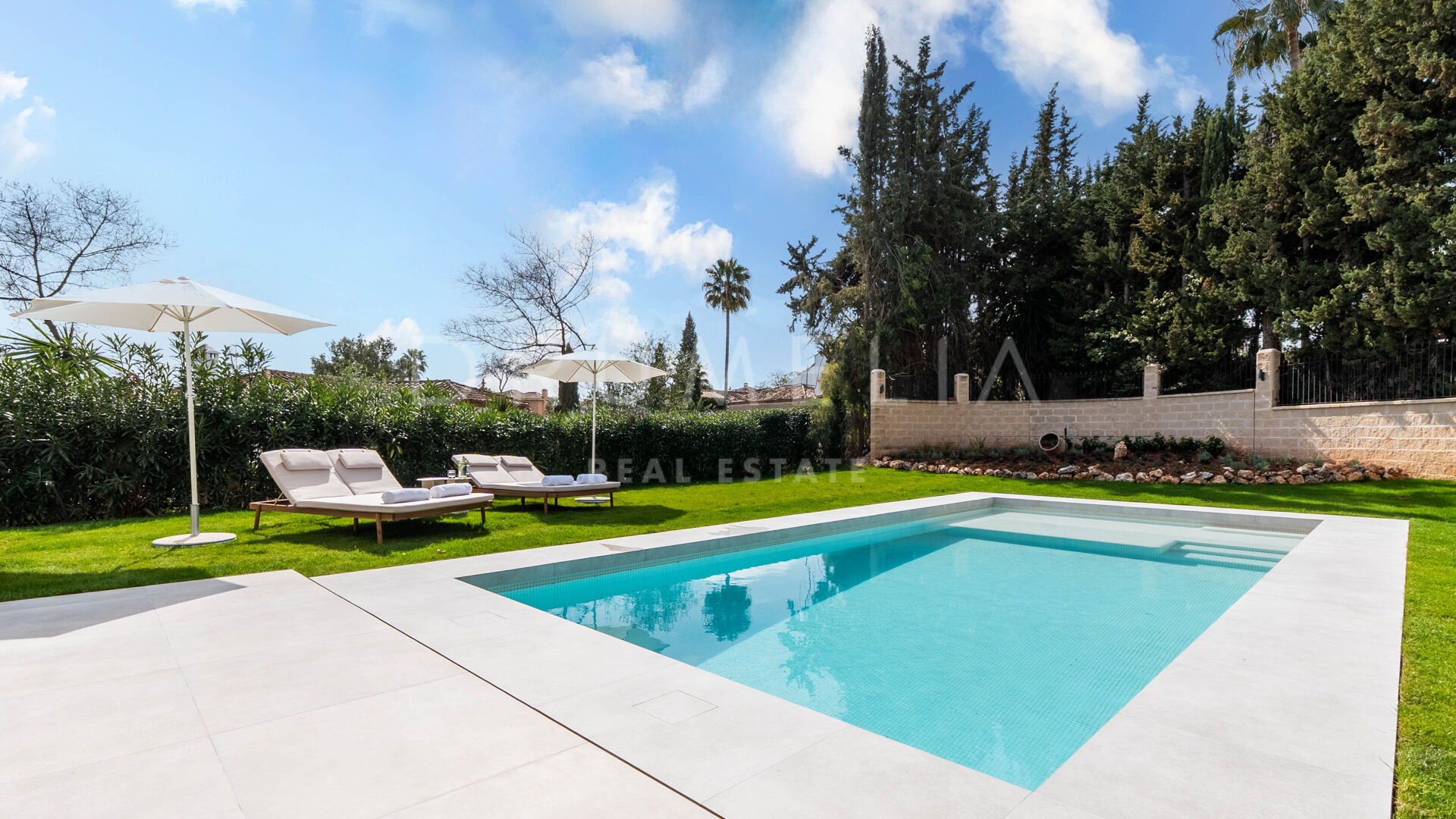 Denne luksuriøse villaen med 4 soverom, som er fullstendig renovert og innflyttingsklar i desember 2023, er til salgs i det ettertraktede Nueva Andalucia-området, et av de mest etablerte nabolagene i Marbella på Costa del Sol. Det prestisjefylte området tilbyr alt du trenger for en komfortabel livsstil, inkludert utmerkede golfbaner, treningssentre, tennis- og padlebaner, internasjonale skoler, anerkjente restauranter, økologiske kafeer og sportsbarer, supermarkeder og butikker, medisinske fasiliteter, konsertarena, kasino, friluftsmarked og mye mer. Du bor i kort avstand fra strendene med blått flagg, de trendy strandklubbene og nattelivet i verdensberømte Puerto Banus og Marbellas Golden Mile. Både Malagas og Gibraltars internasjonale flyplasser ligger mindre enn en time unna.