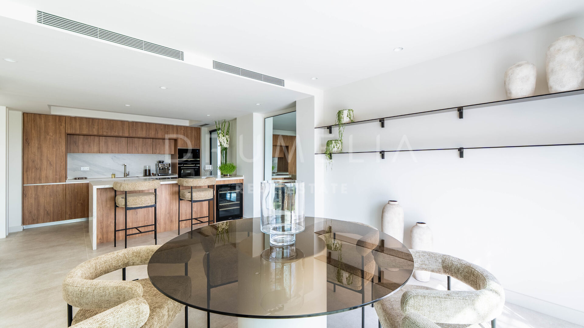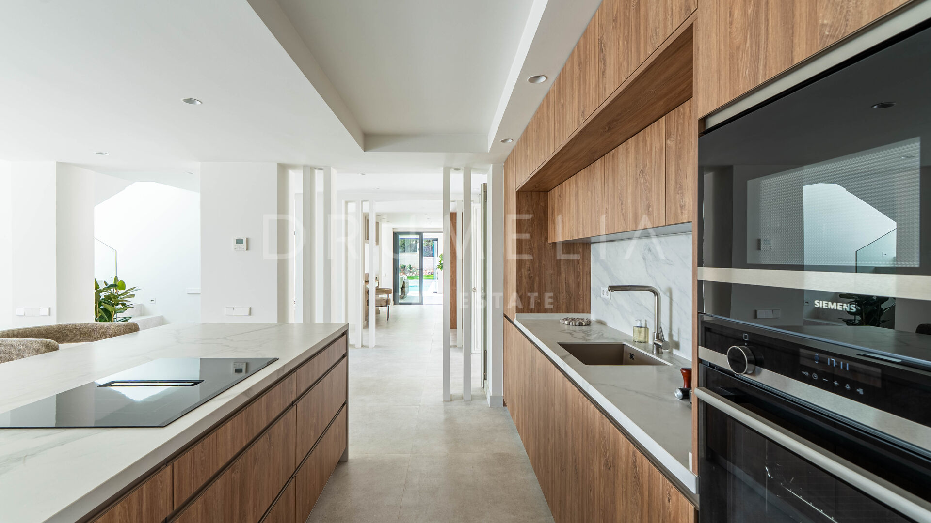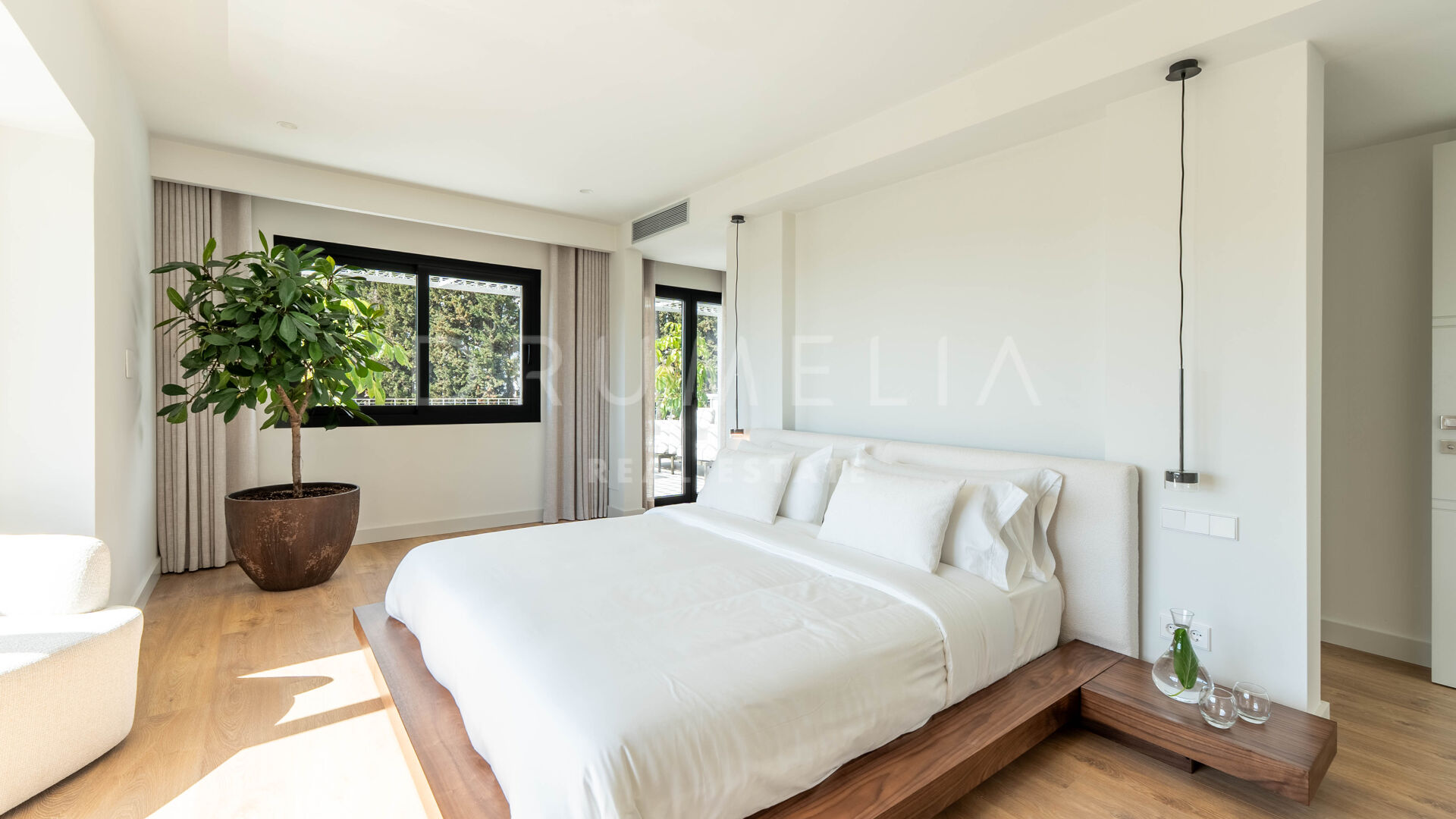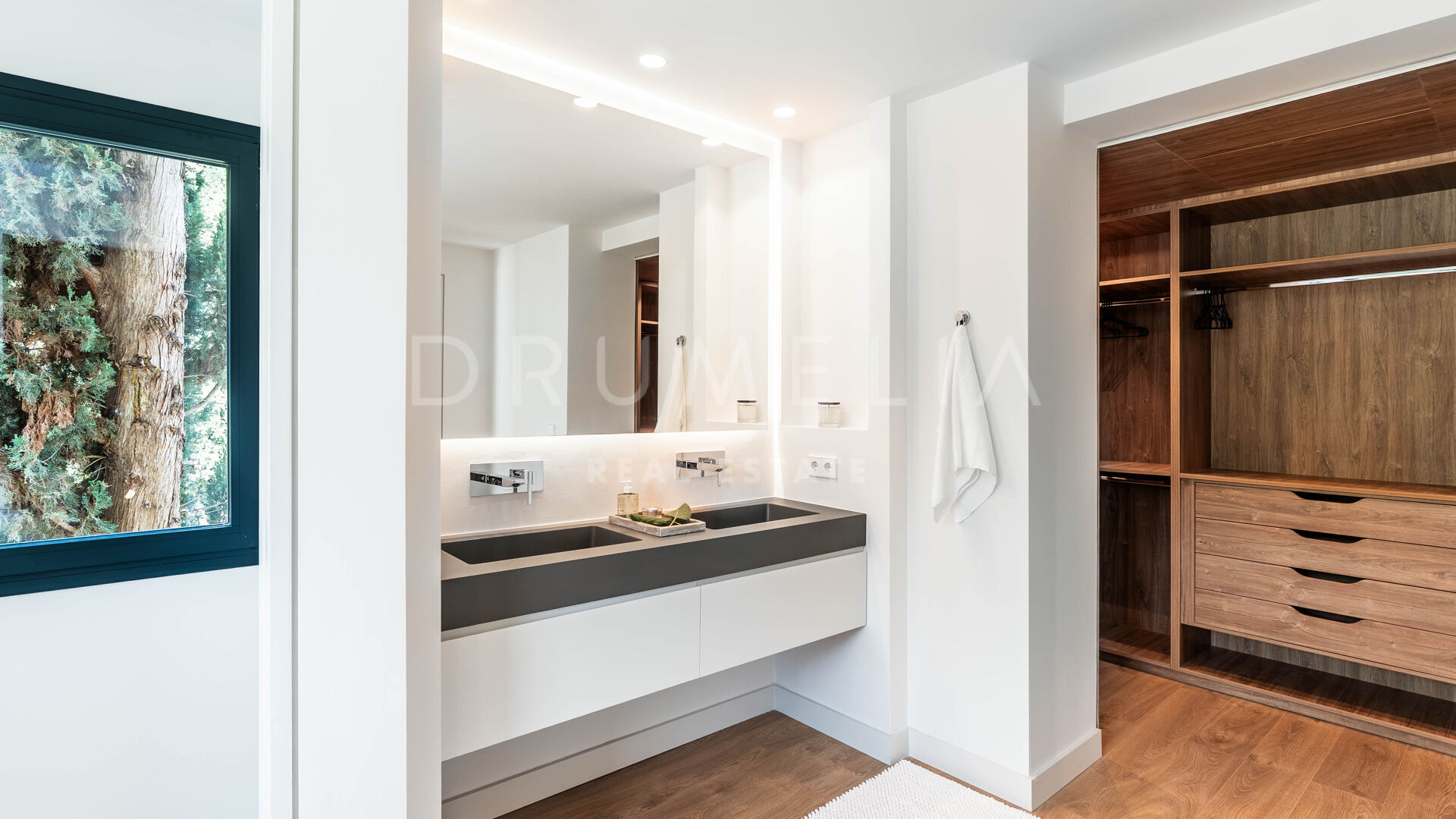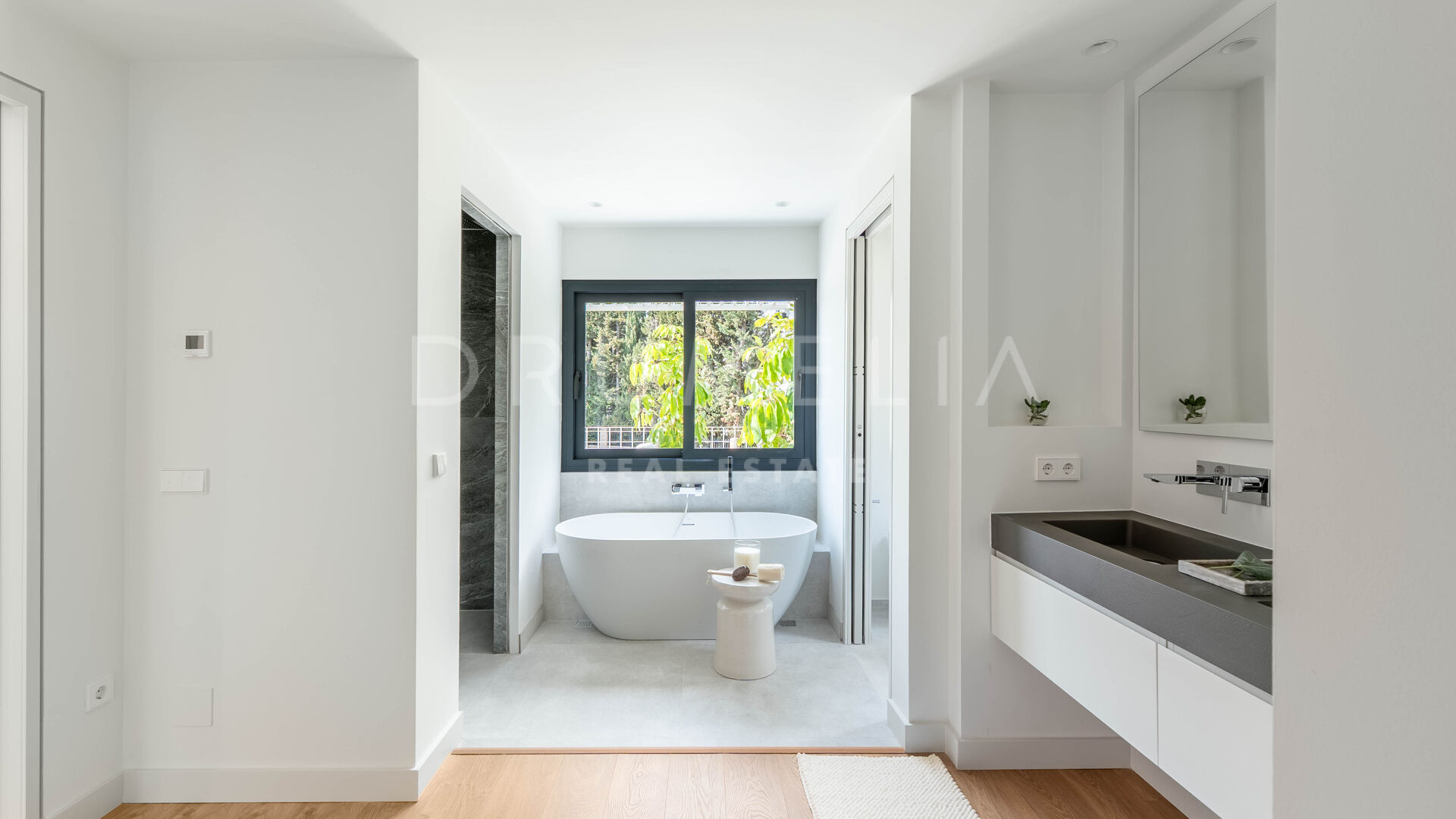 Denne nyrenoverte eiendommen på 330 m² på en 1 121 m² stor tomt er omgitt av frodige, subtropiske grøntområder og lignende eksklusive eiendommer i Nueva Andalucia, og er perfekt for deg som ønsker en moderne familiebolig med førsteklasses fasiliteter. Her får du en kombinasjon av moderne luksus og følelsen av et ekte hjem. Når du kommer inn i villaen, blir du møtt av en innbydende hall, et åpent kjøkken, spiseplass og en romslig stue. Toppmoderne hvitevarer sørger for en sømløs matlagingsopplevelse. LED-belysning og dempede fargetoner i interiøret skaper en beroligende og avslappende atmosfære. Skyvedører i glass gjør det enkelt å leve ute og inne. Fra både stue og spisestue er det utgang til terrassene og den romslige hagen, der du kan nyte den åpne utsikten over omgivelsene. Den øvre etasjen er viet til elegant innredede soverom. Her finner du tre soverom, alle med eget bad. Hovedsoverommet har en stor terrasse hvor du kan nyte morgenkaffen mens du nyter havutsikten.
