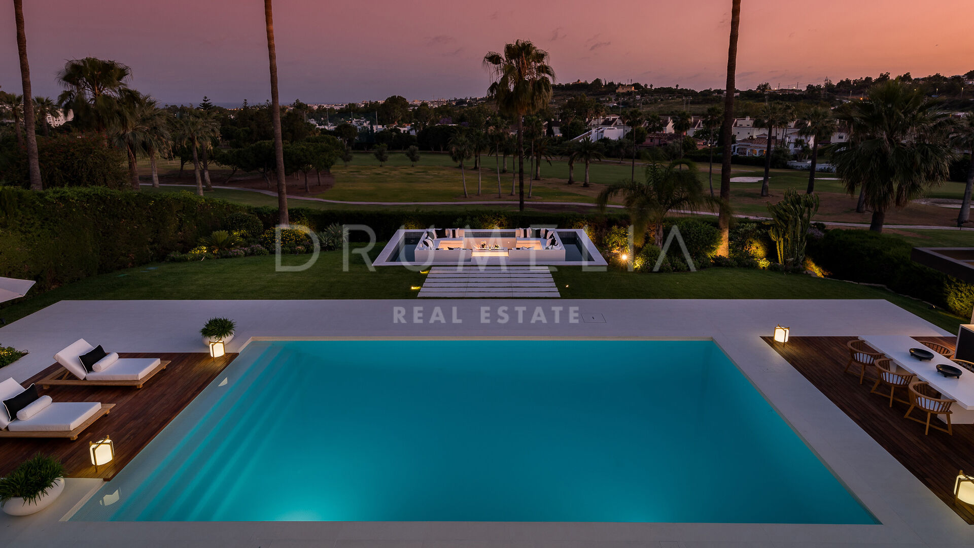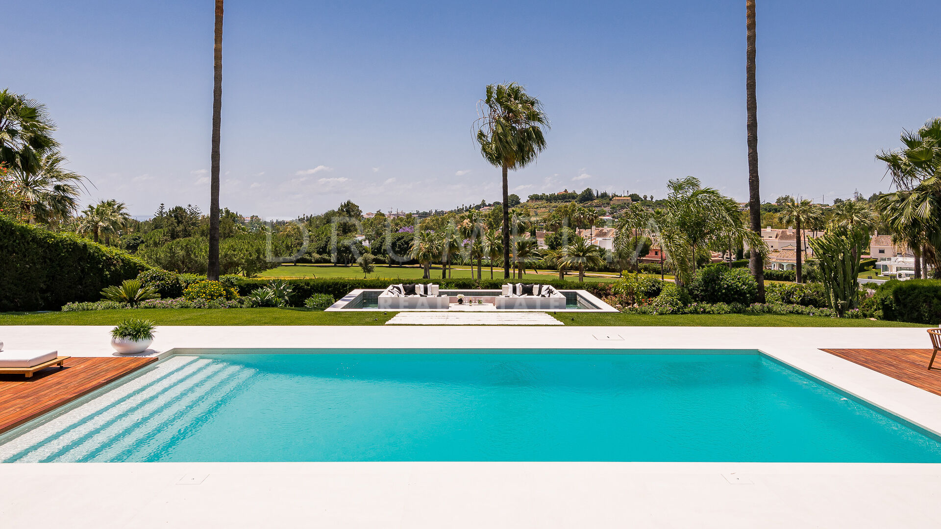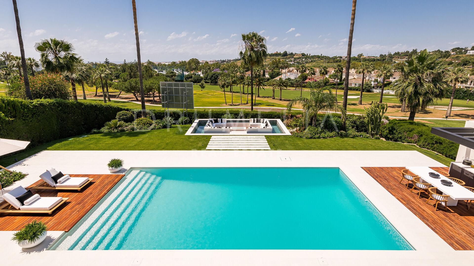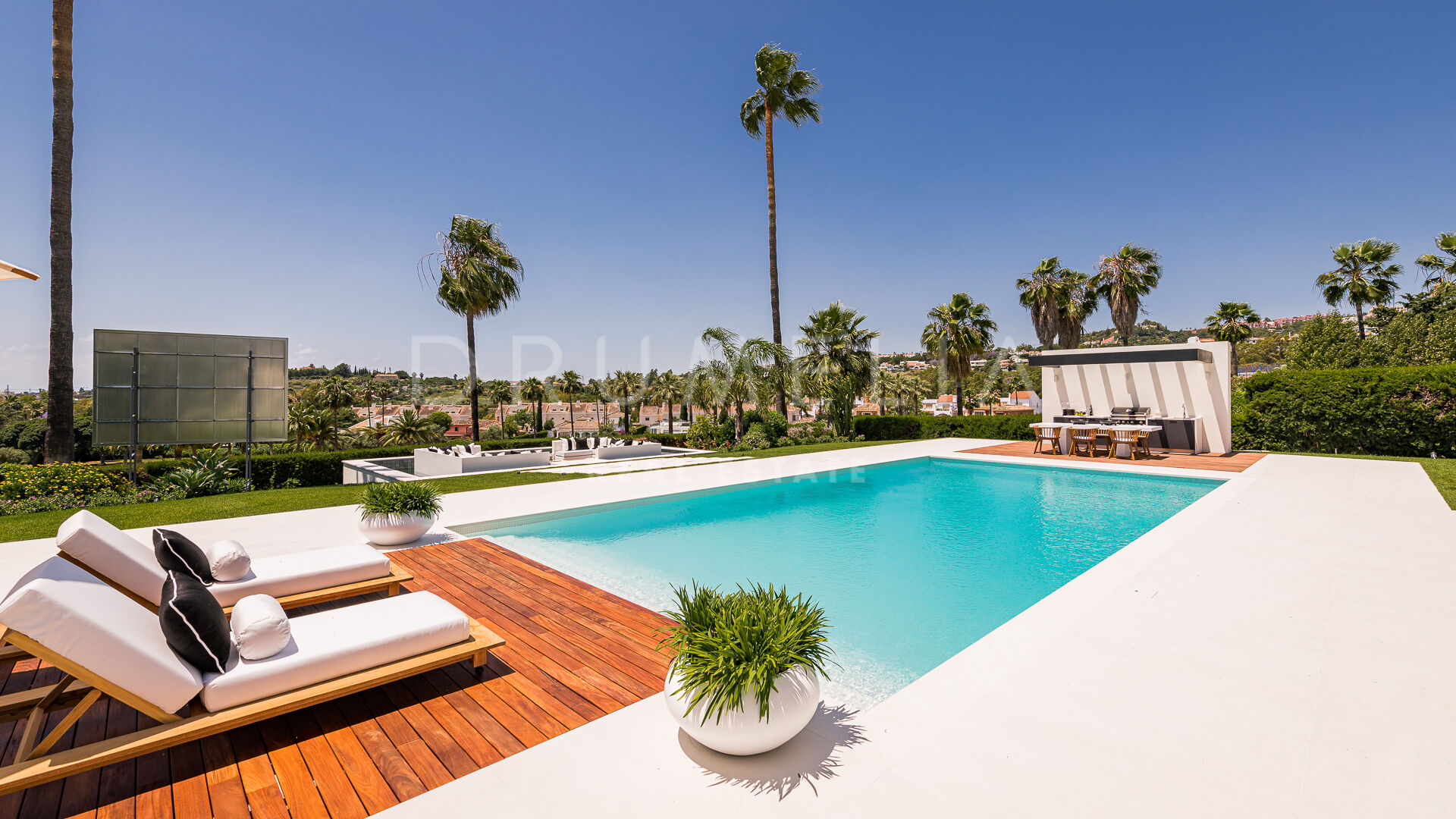 Uteområdene er designet for avslapning og underholdning, med en chill-out-sone med vannspeil, et utendørs grillkjøkken og rikelig med plass til soling. Den vakkert anlagte hagen er en ideell ramme for uteservering og fritidsaktiviteter. Beliggenheten i Nueva Andalucía er perfekt for familier og golfentusiaster, med nærhet til prestisjefylte golfbaner og viktige fasiliteter.