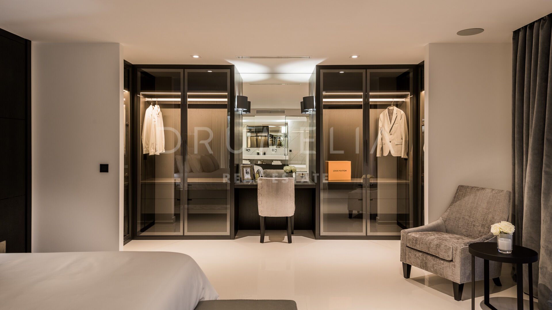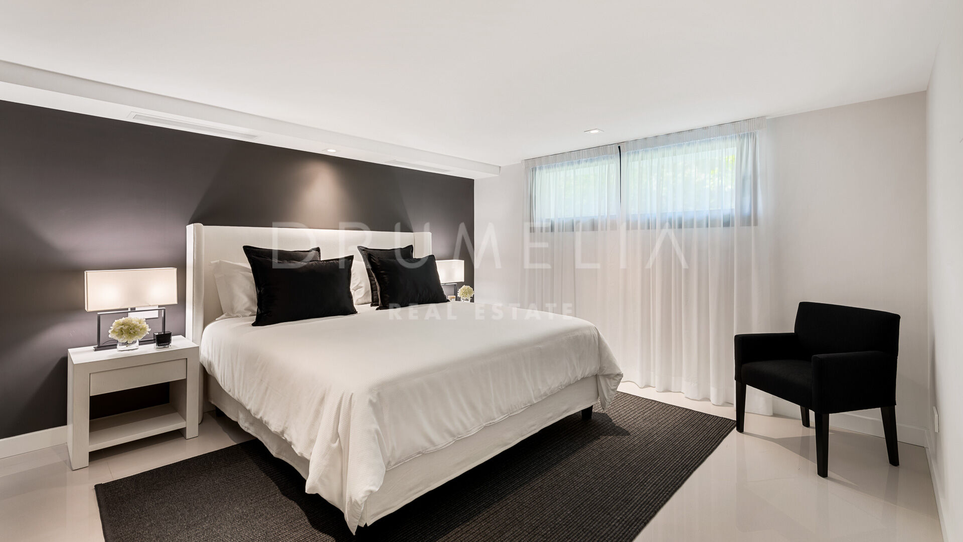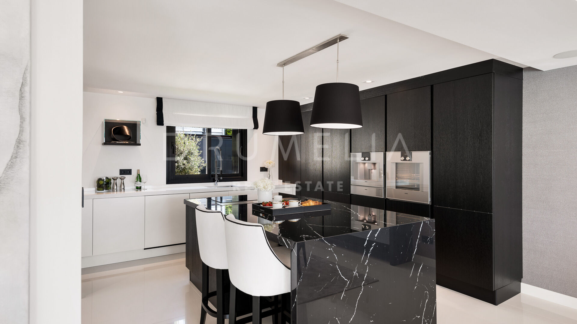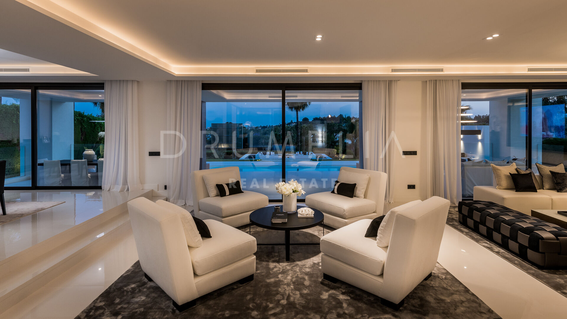 Den 540 m² store villaen, som er bygget over tre etasjer, smelter vakkert sammen med de frodige omgivelsene. Villaen har et elegant italiensk designerkjøkken fullt utstyrt med hvitevarer fra Gaggenau, og eksklusive bad med Dornbracht-armaturer. Interiøret har lyse oppholdsrom, en romslig spiseplass, seks rolige soverom og seks og et halvt bad. Nøkkelfunksjoner som en pittoresk terrasse, hageanlegg og et overdimensjonert, oppvarmet basseng forsterker eiendommens sjarm.